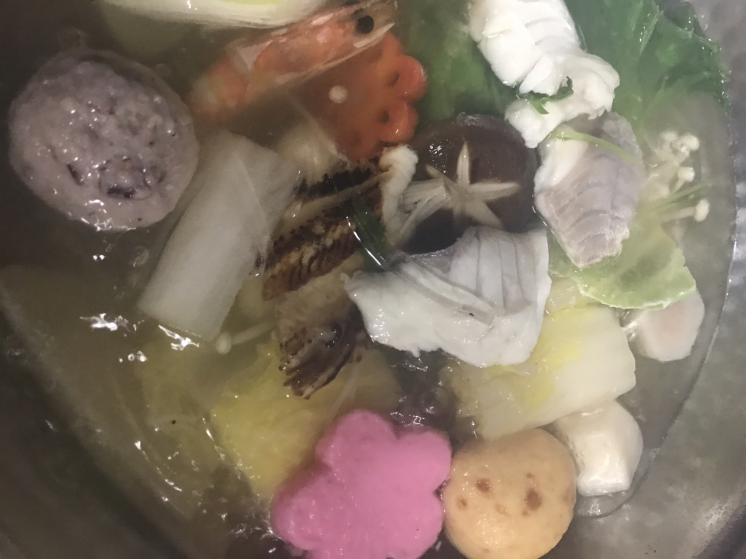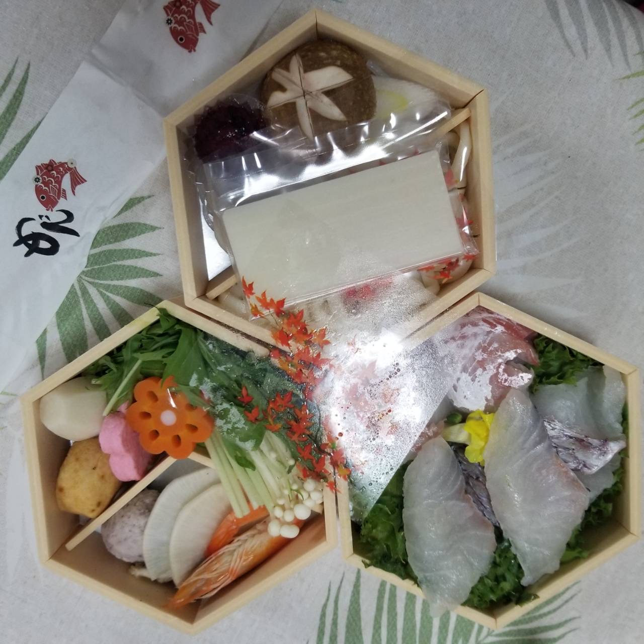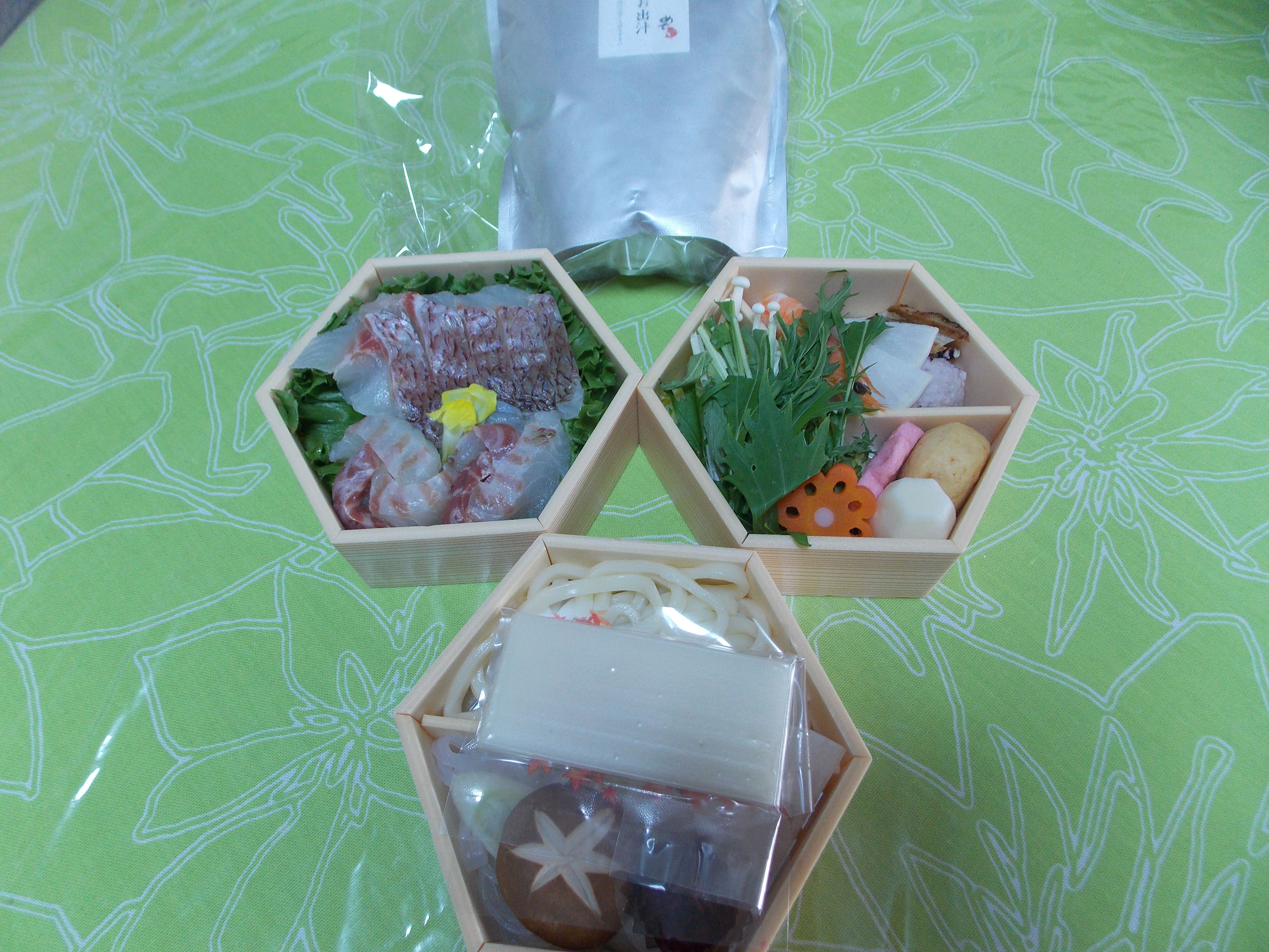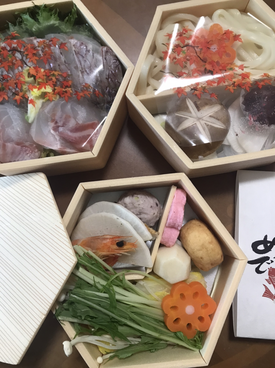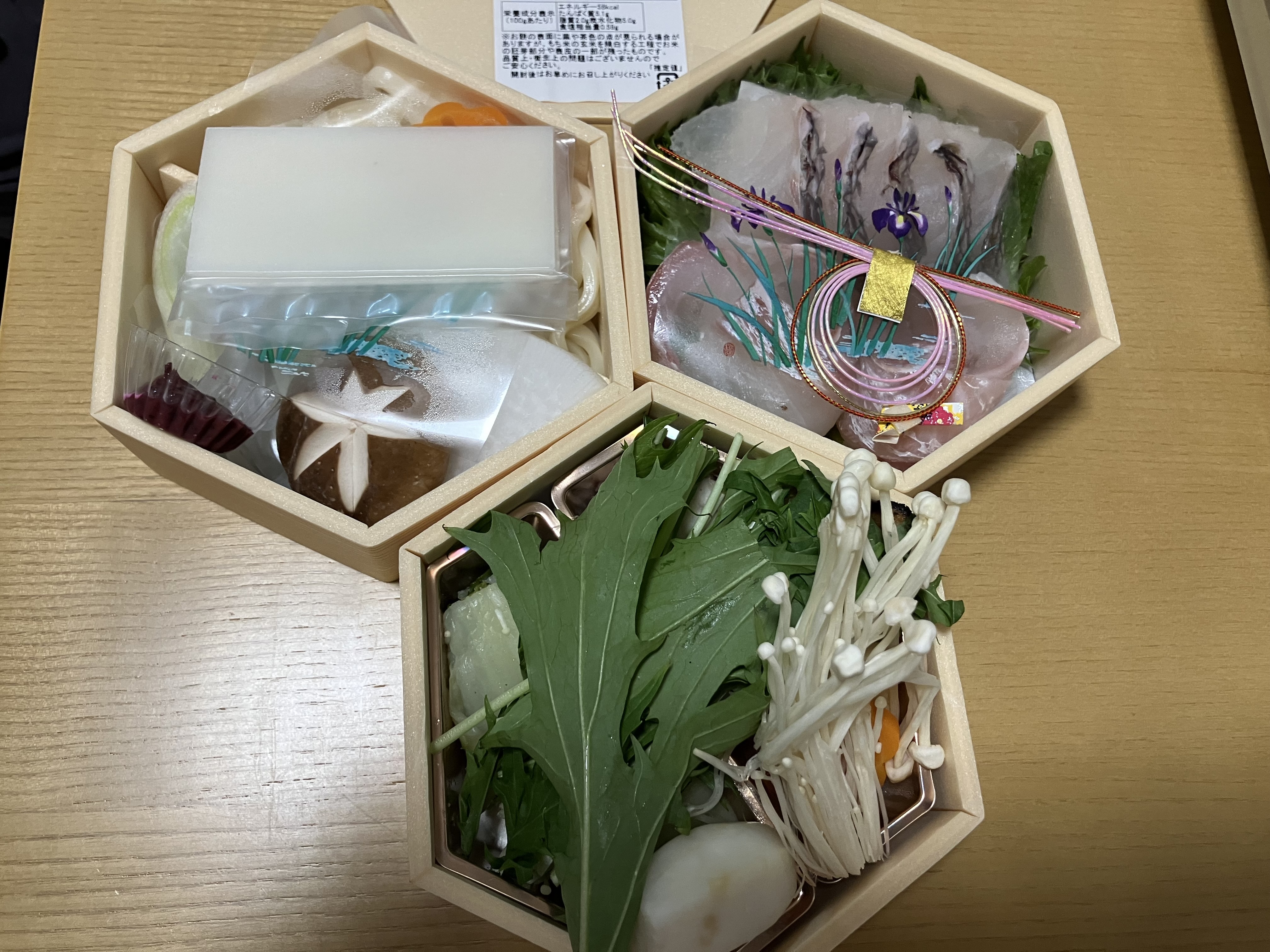 2段目はうどんやお餅、エビ、つみれ、がんもなどが、3段目は野菜がそれぞれ綺麗に敷き詰められていました。