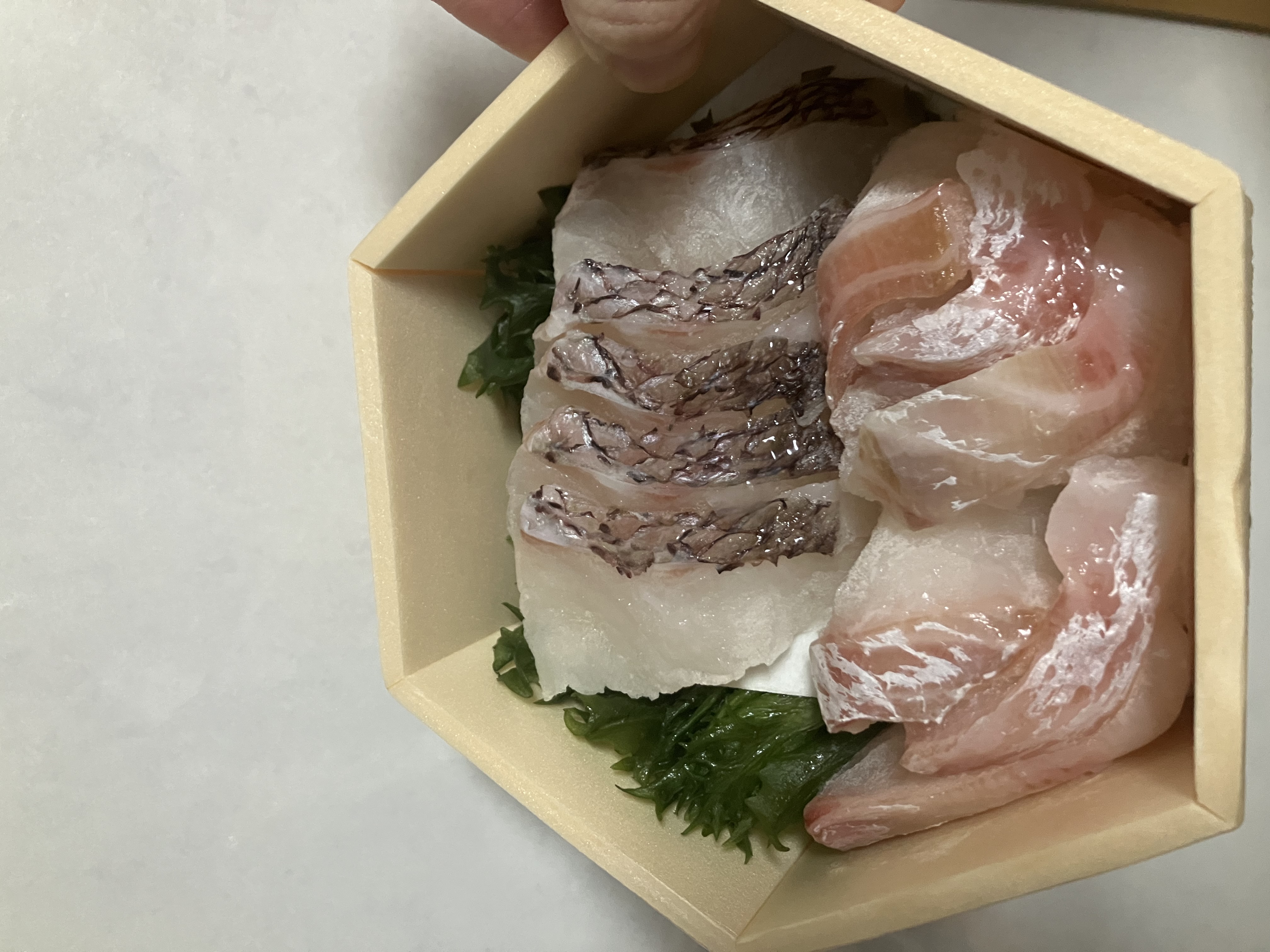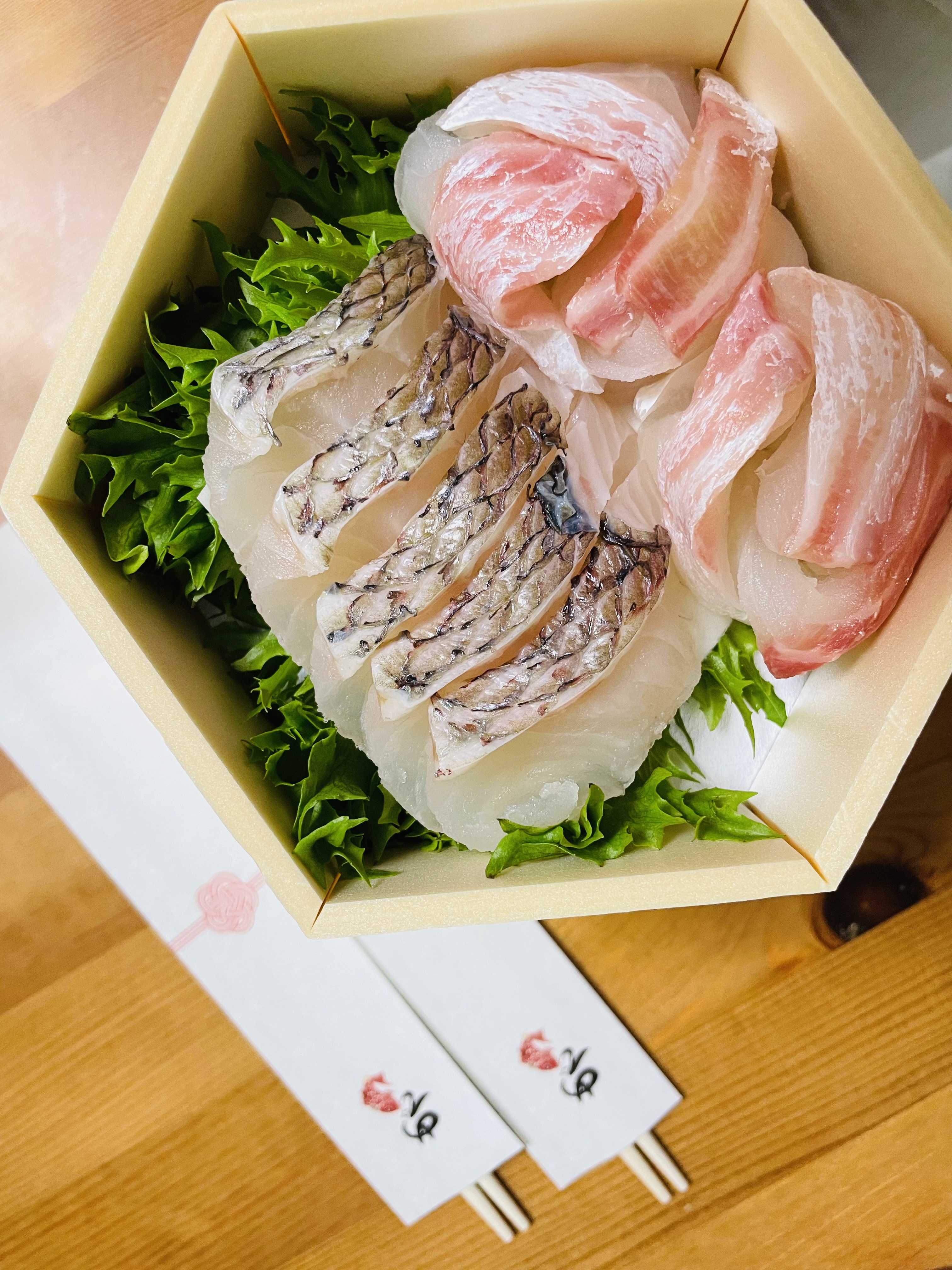 1段目は鯛とレタスが綺麗に並んでいて身も分厚そうですし、2種類の鯛が入っていました。