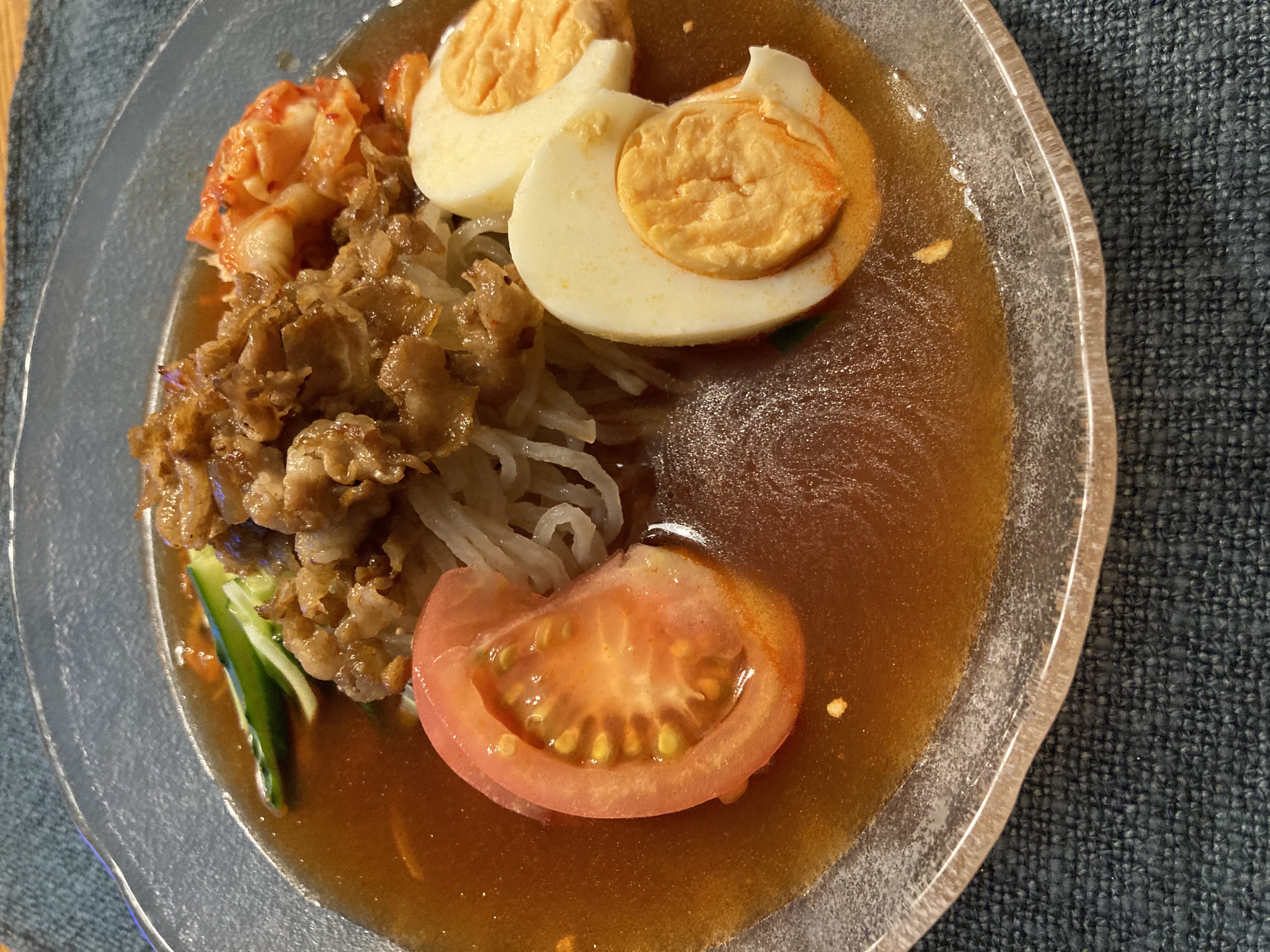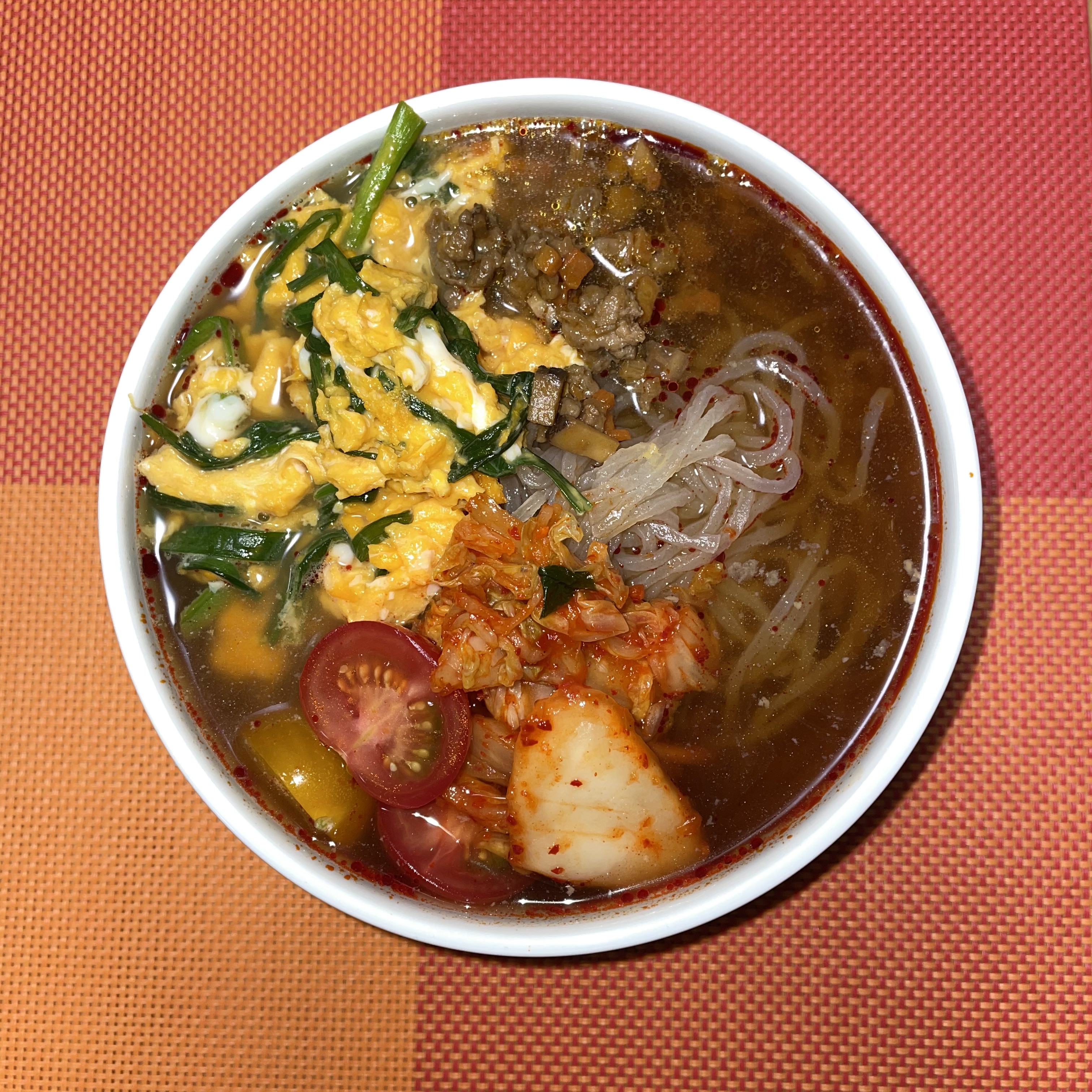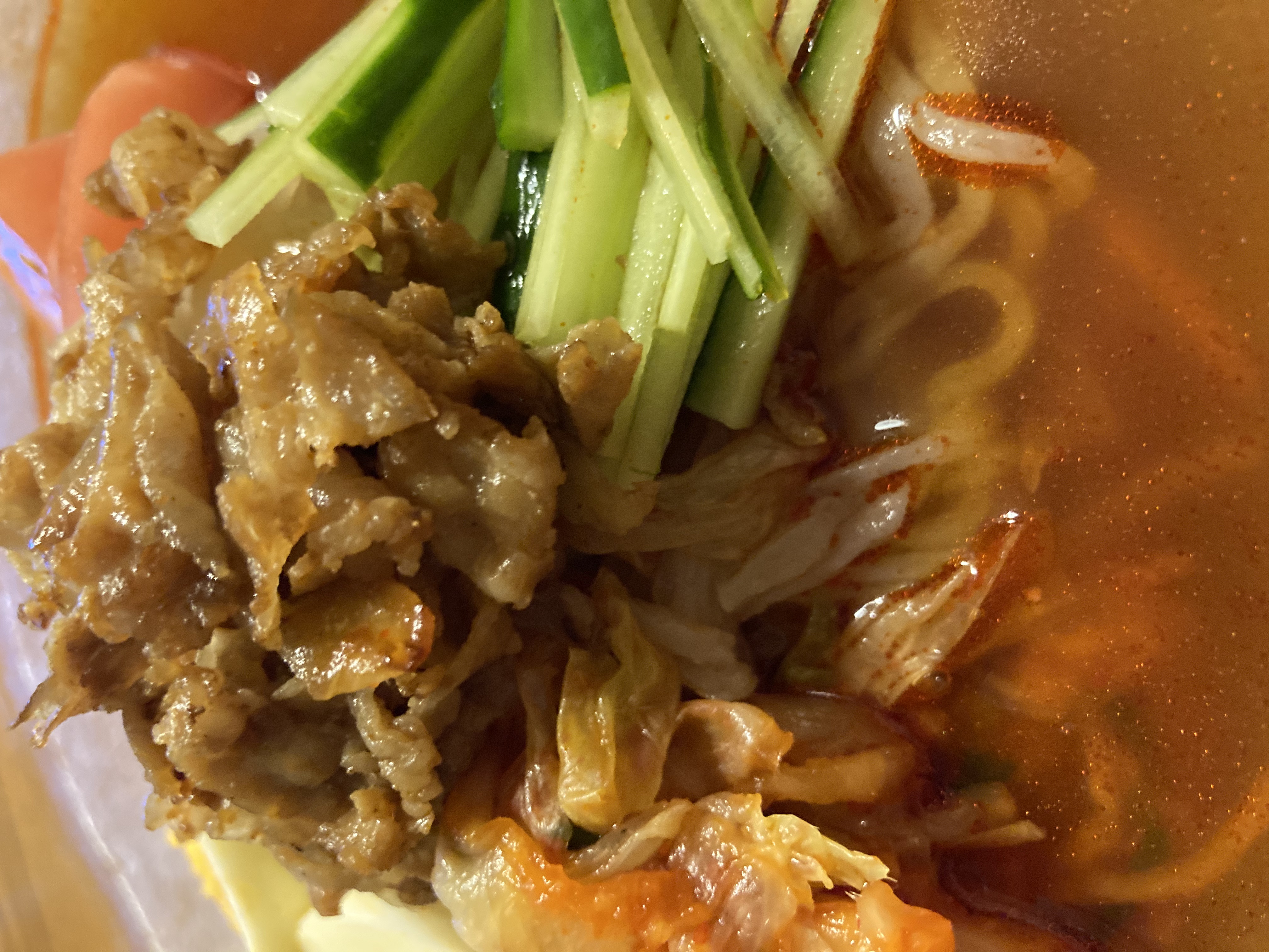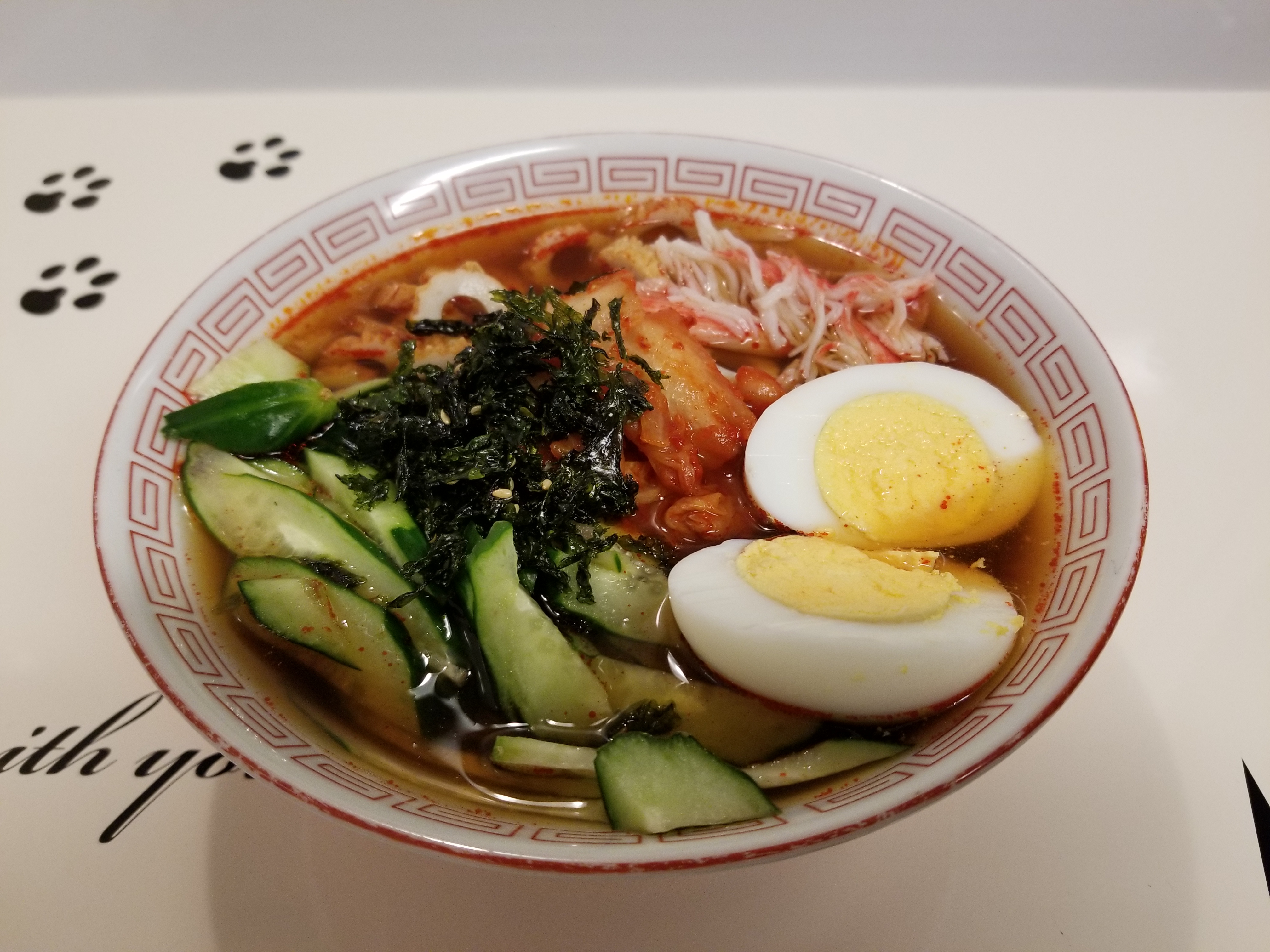 今回は、きゅうり、白菜キムチ、カニかま、ちくわ、韓国海苔(きざみ)、ゆで卵を乗せました。(いり卵にすればよかったw)