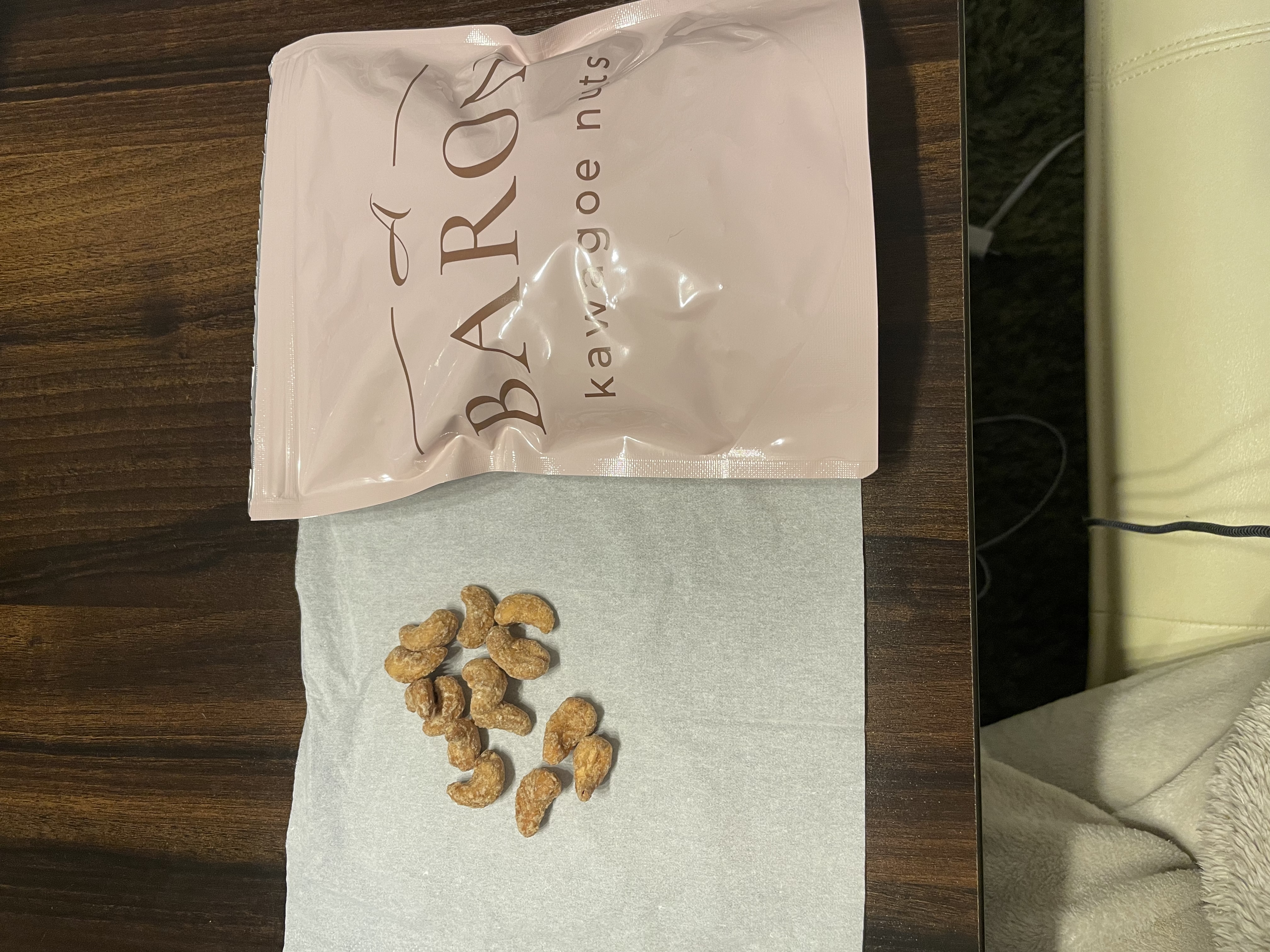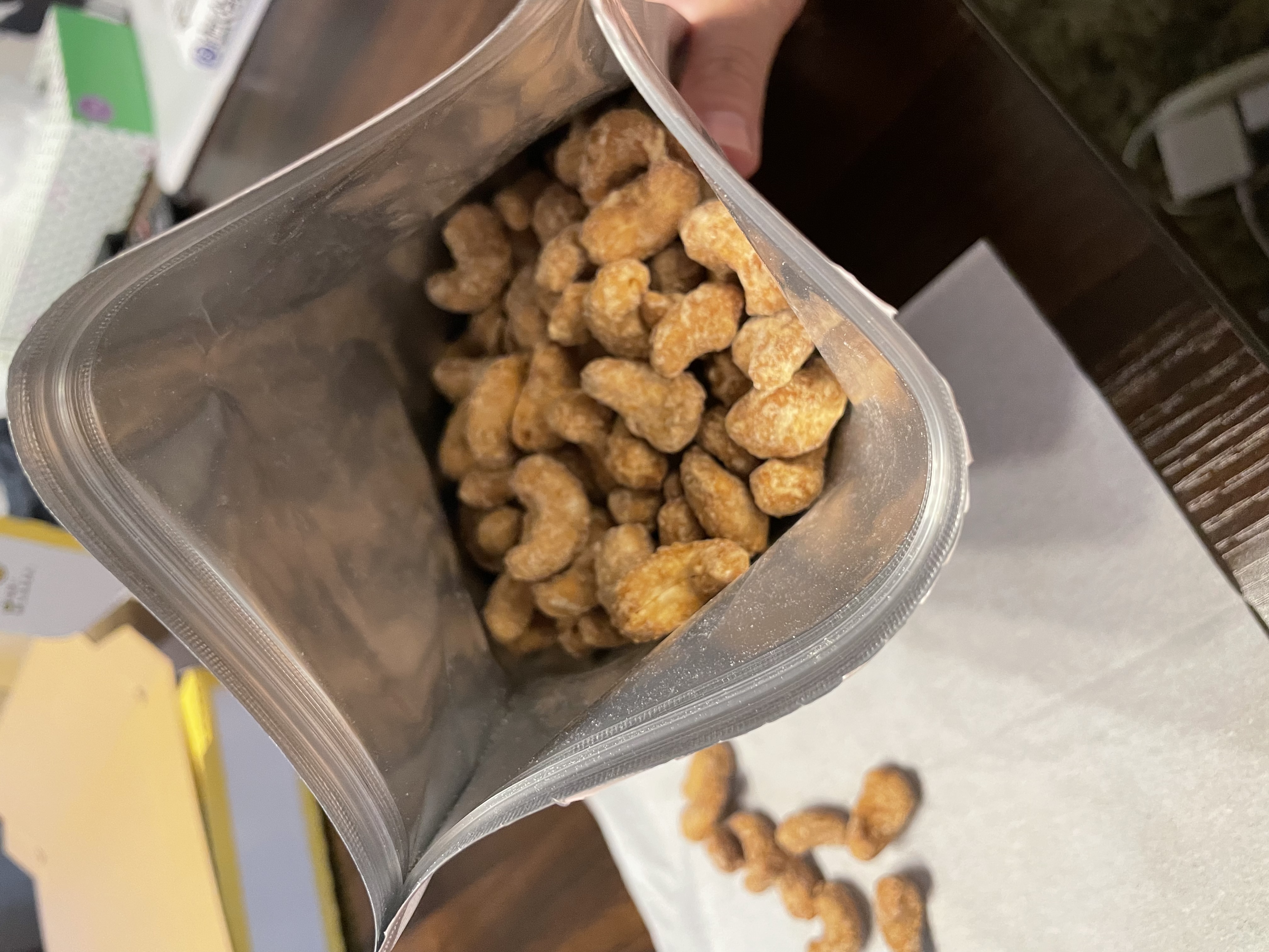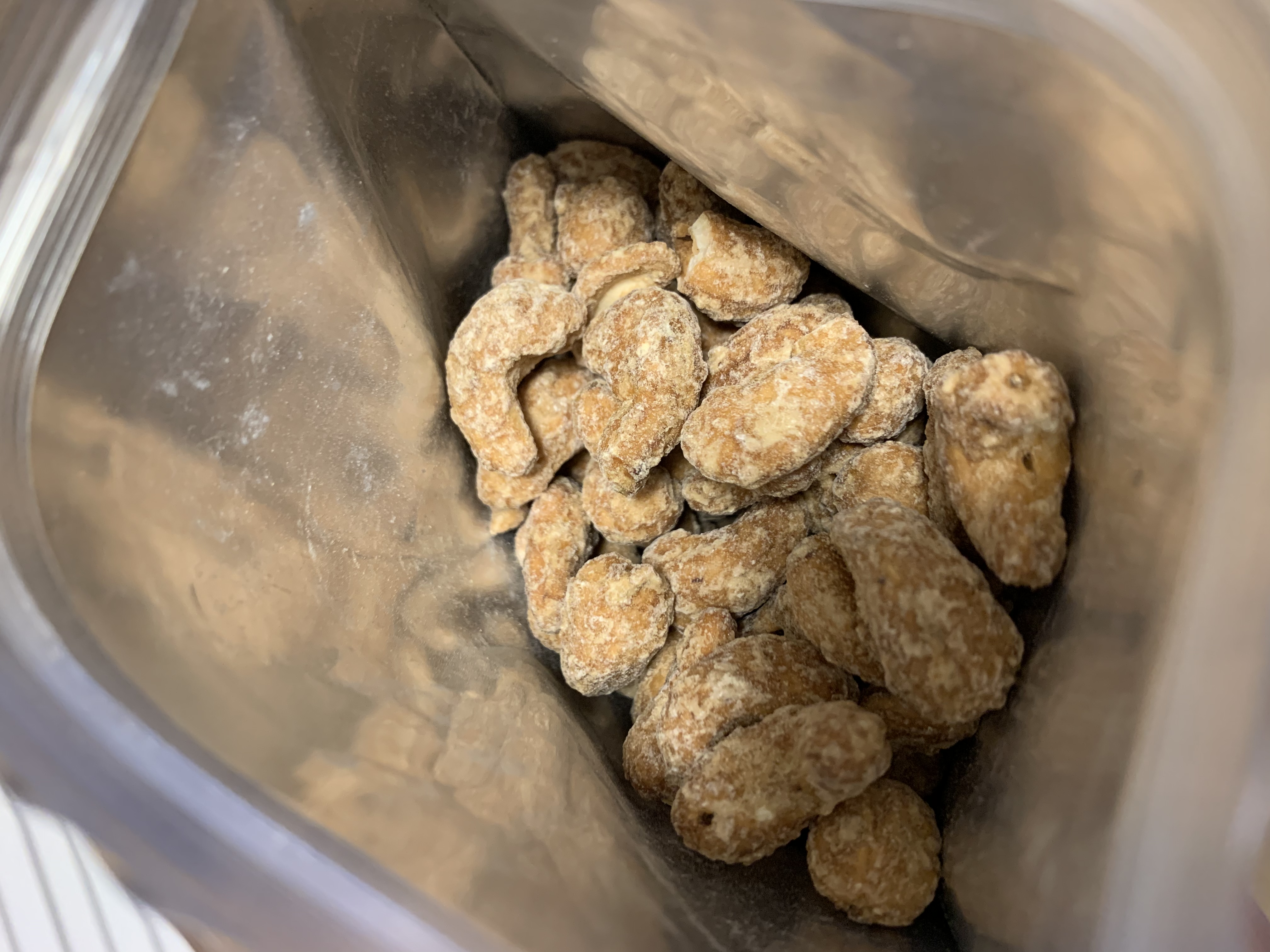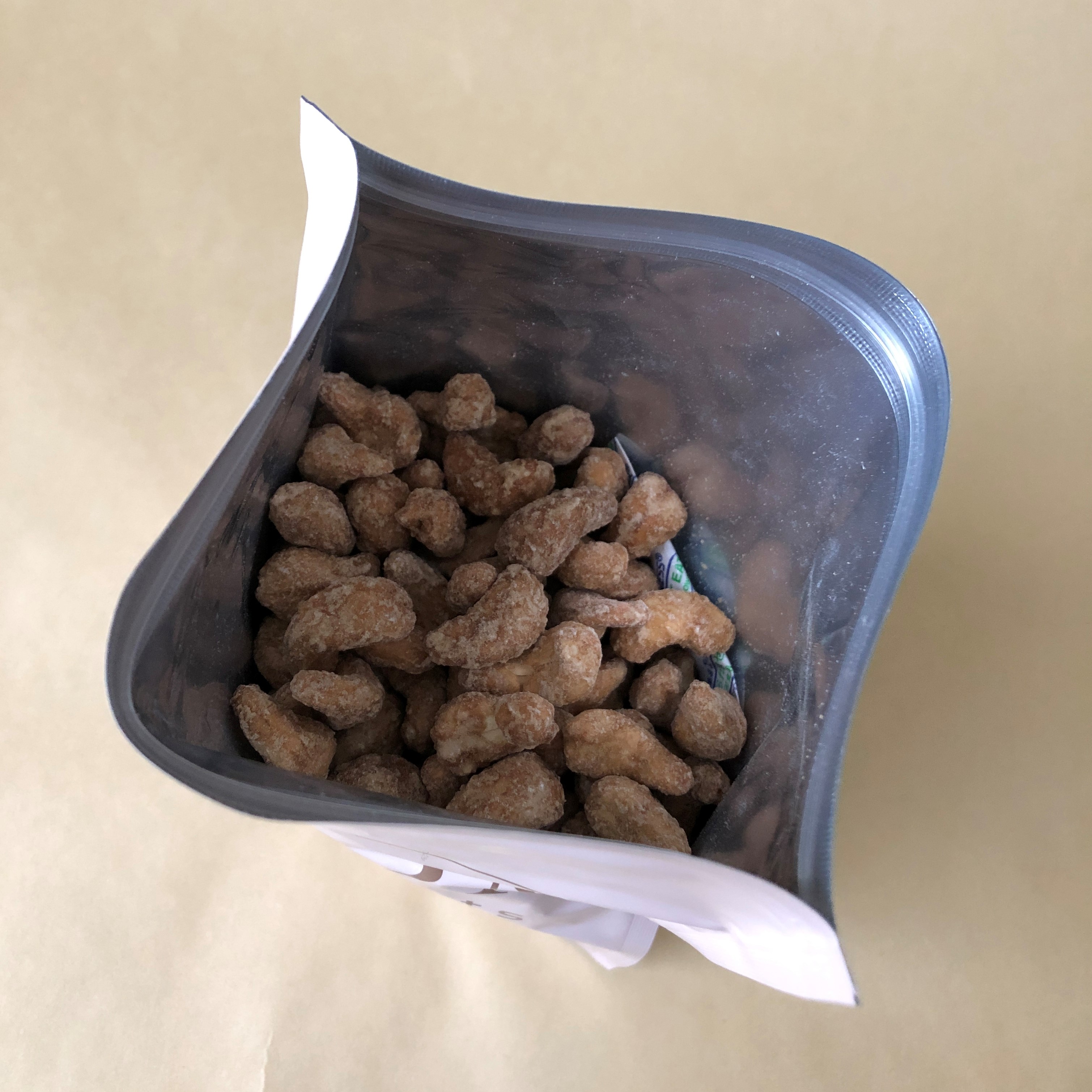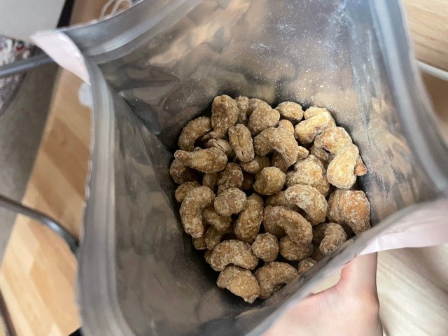 とにかくボリューミーです!!そして封を開けたらメープルの香りがふんわり広がり、とても美味しそうな香りがします。取り出してみると、そのつぶの大きさにも驚きました!!ゴロゴロと大きなカシューナッツが入っています!周りはメープルでコーティングされていて、ひと口食べるとカリカリコリコリ食感で、噛みごたえ抜群!!