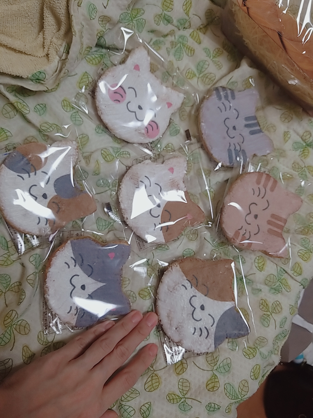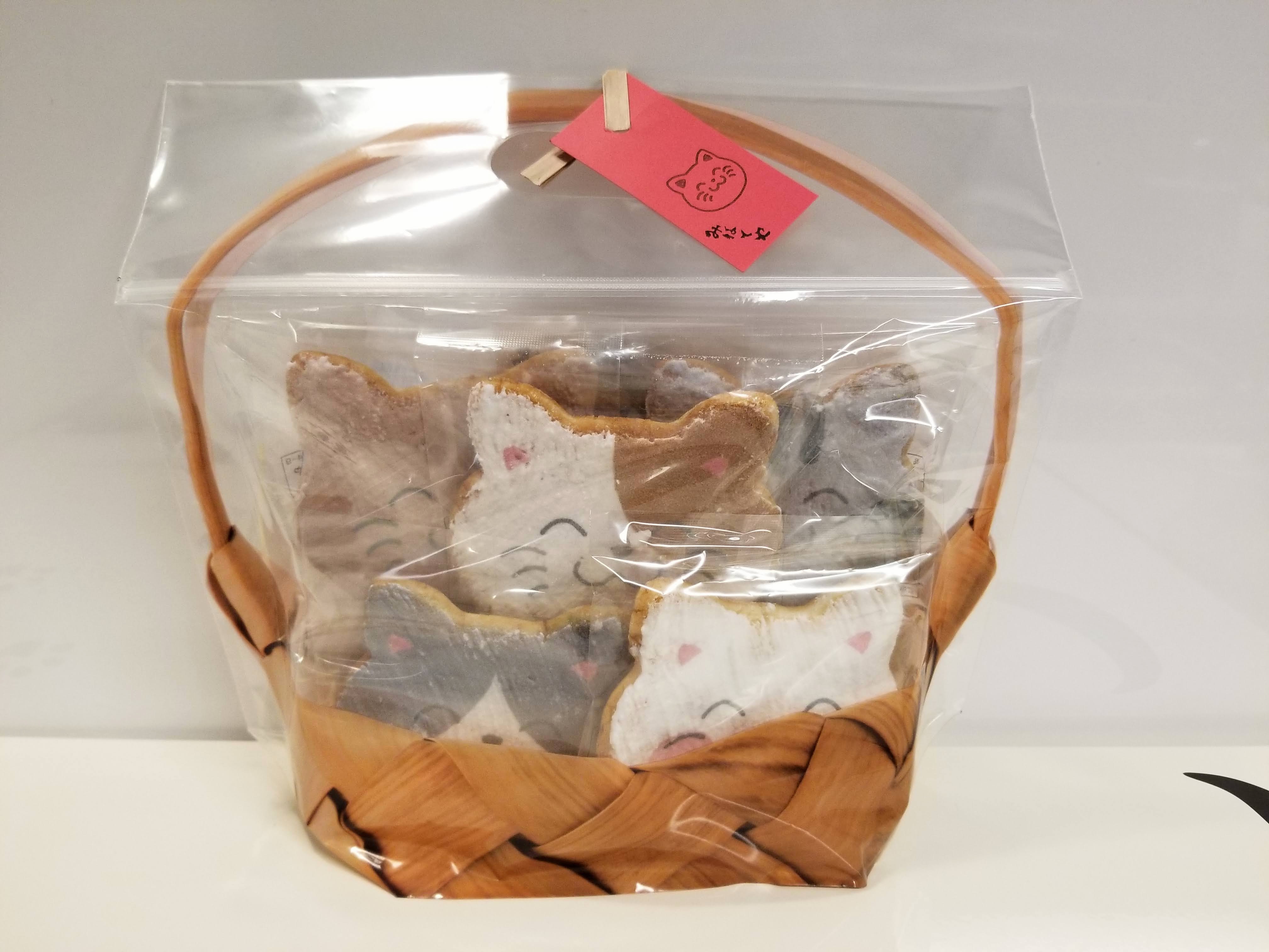 お煎餅が入っている袋には籠のイラストがプリントされているので微笑ましい猫ちゃん達が籠の中からひょっこり顔を覗かせているように感じます。