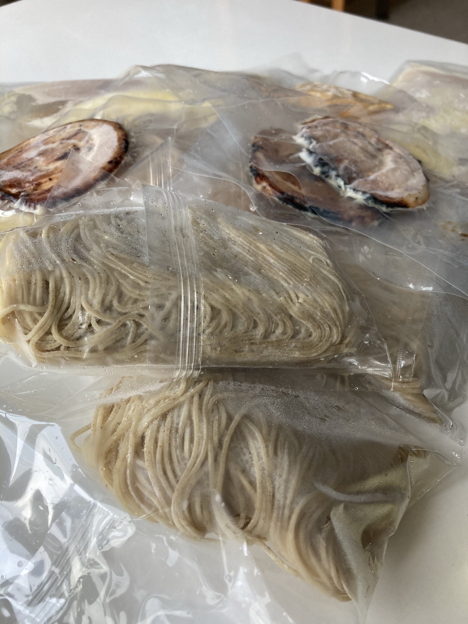 (2)別のお鍋にも同様にたっぷりのお湯を沸かし、麺を入れる。投入後、自然とほぐれてきたら、お箸で広げて、そのまま強火で1分〜1分半(真空手もみ麺の場合は、2分半〜3分)、お好みの硬さに茹でる。