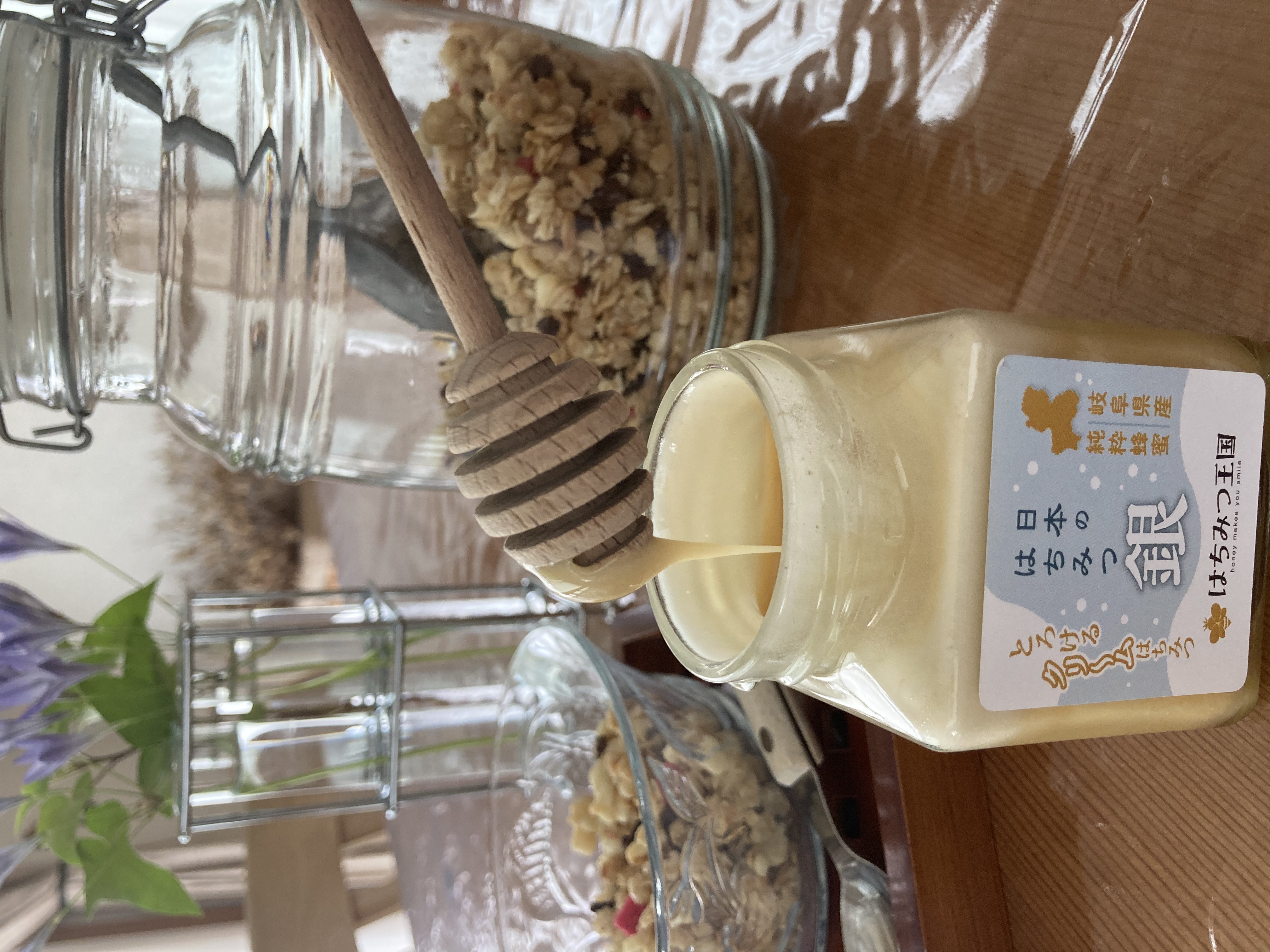 岐阜県産の「白いはちみつ」です。混ぜ物などは一切せずに、特別な製法仕上げた、とろけるクリーム状のホワイトハニー。はちみつの濃厚な香りと、さわやかな口どけを楽しめます。そのまま食べるのはもちろんのこと、パンケーキやグラノーラなどのトッピング、辛口マスタードと混ぜて生野菜サラダのドレッシングとしてなど、幅広く活用できます。