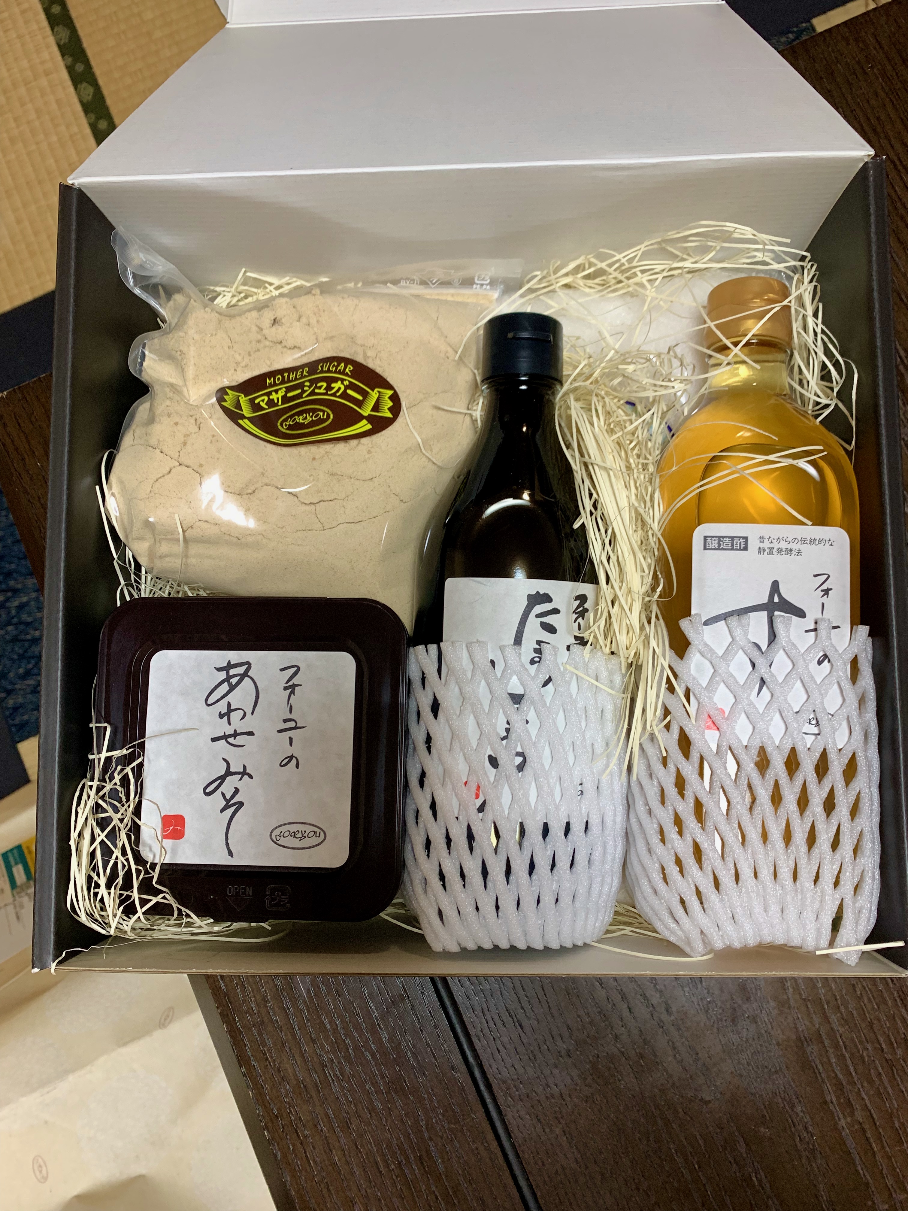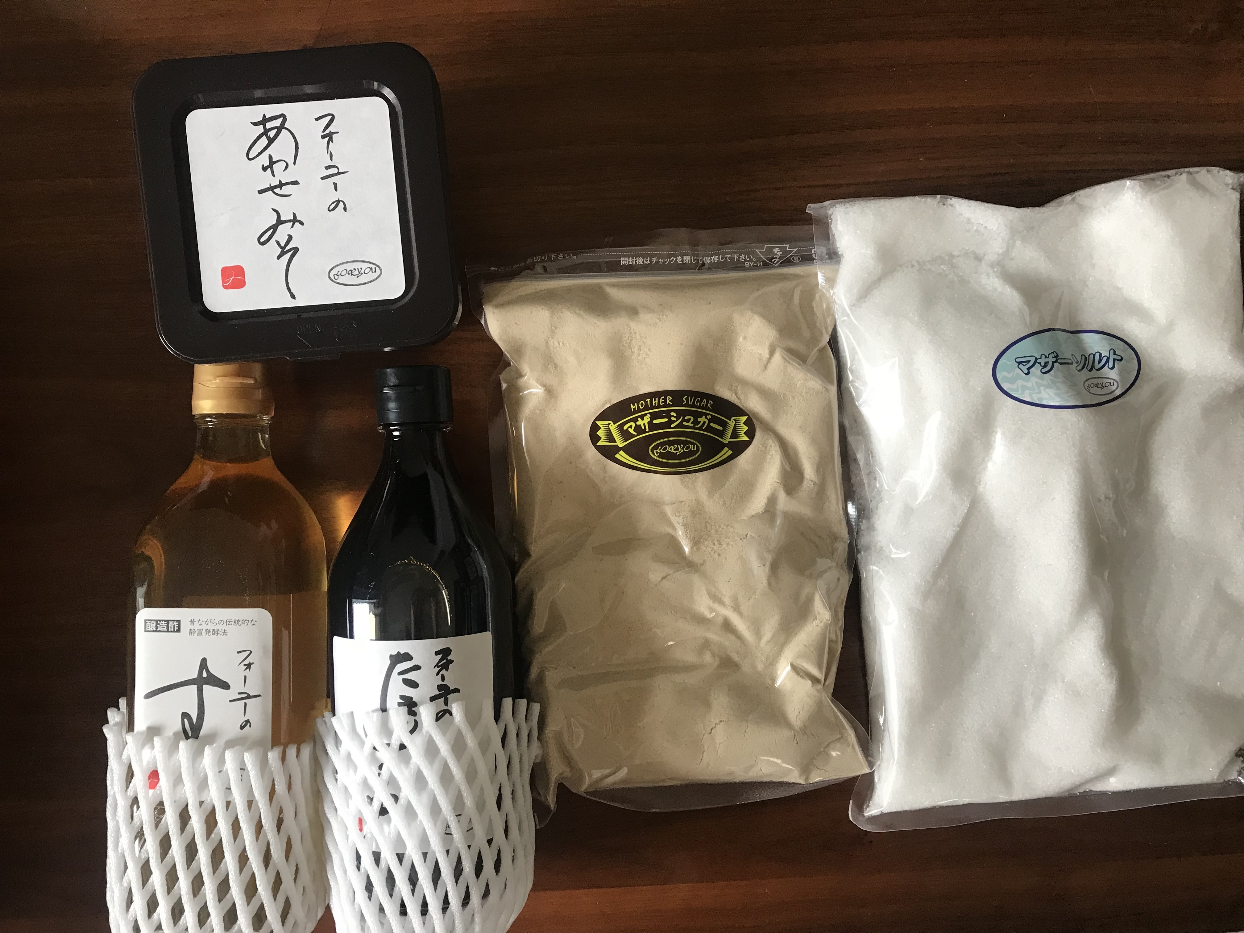 無添加の素材を使用した調味料セットです。「マザーソルト」は、満潮時の深層海水だけを陶器を敷きつめた塩田に引き込み、自然結晶させ一年間熟成させた塩。喜界島産のさとうきびで作った「マザーシュガー」。明治の初めから、味噌とたまりを作り続けてきた南蔵·青木弥右衛門の蔵で、国産大豆100%を使い丁寧に作り上げた、香りのいい醤油「たまりしょうゆ」等5種の調味料。毎日使うものだからこそ、安心安全にこだわった商品です。