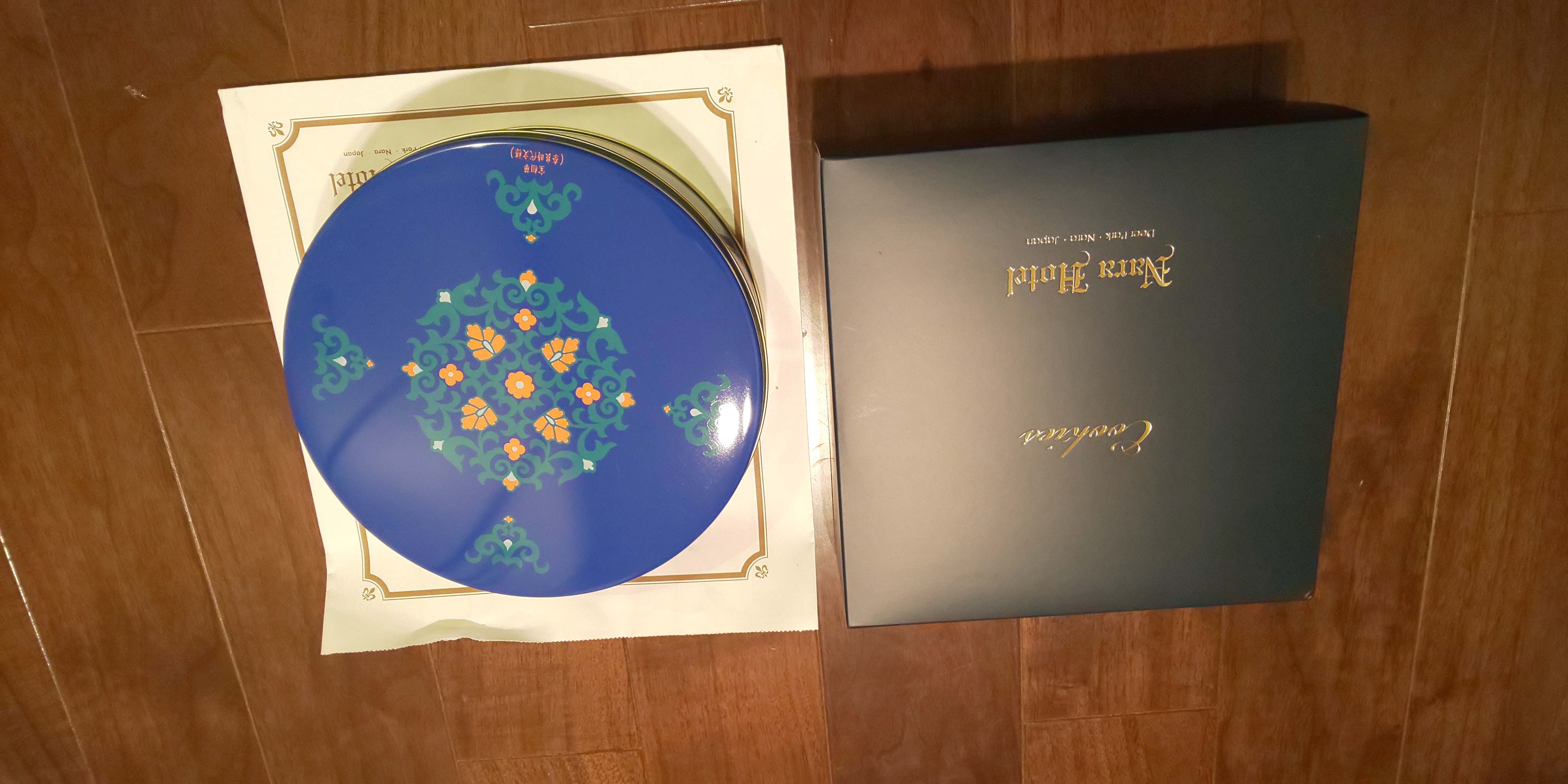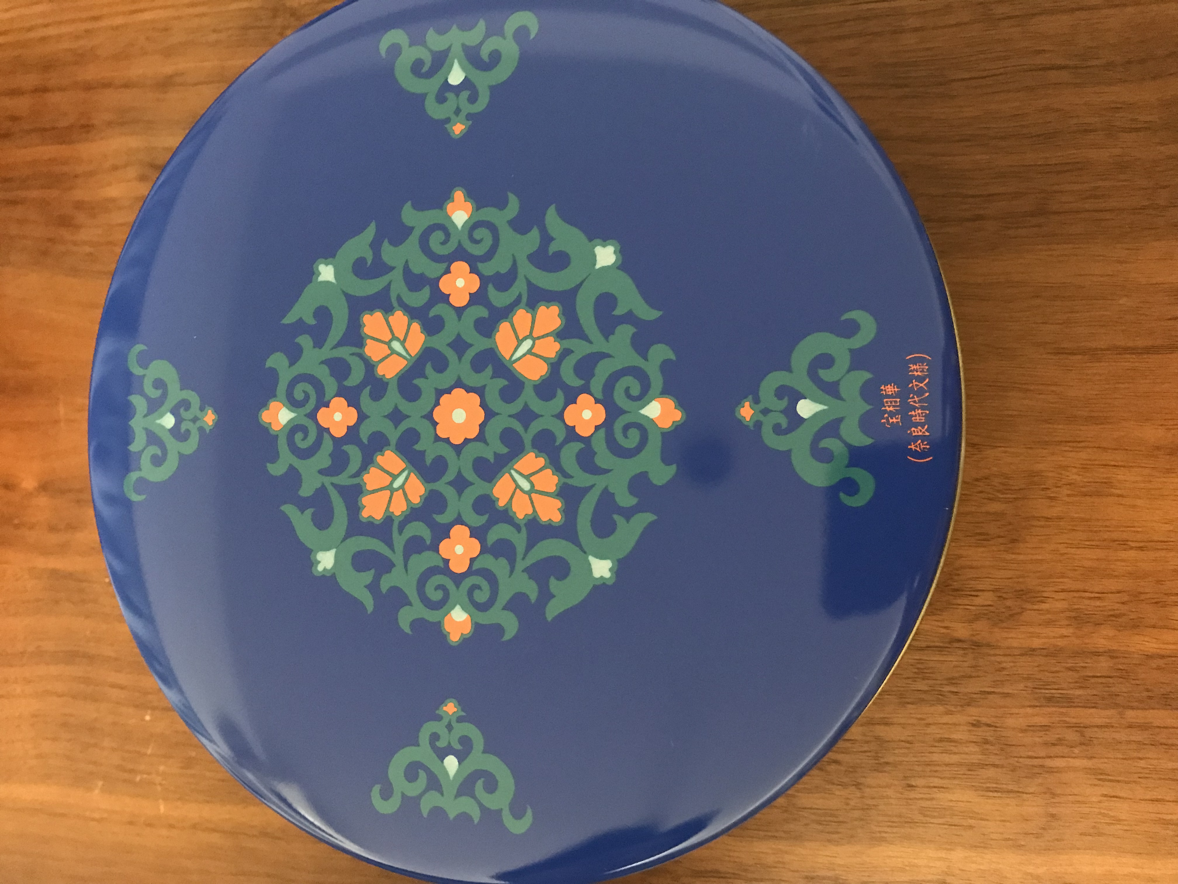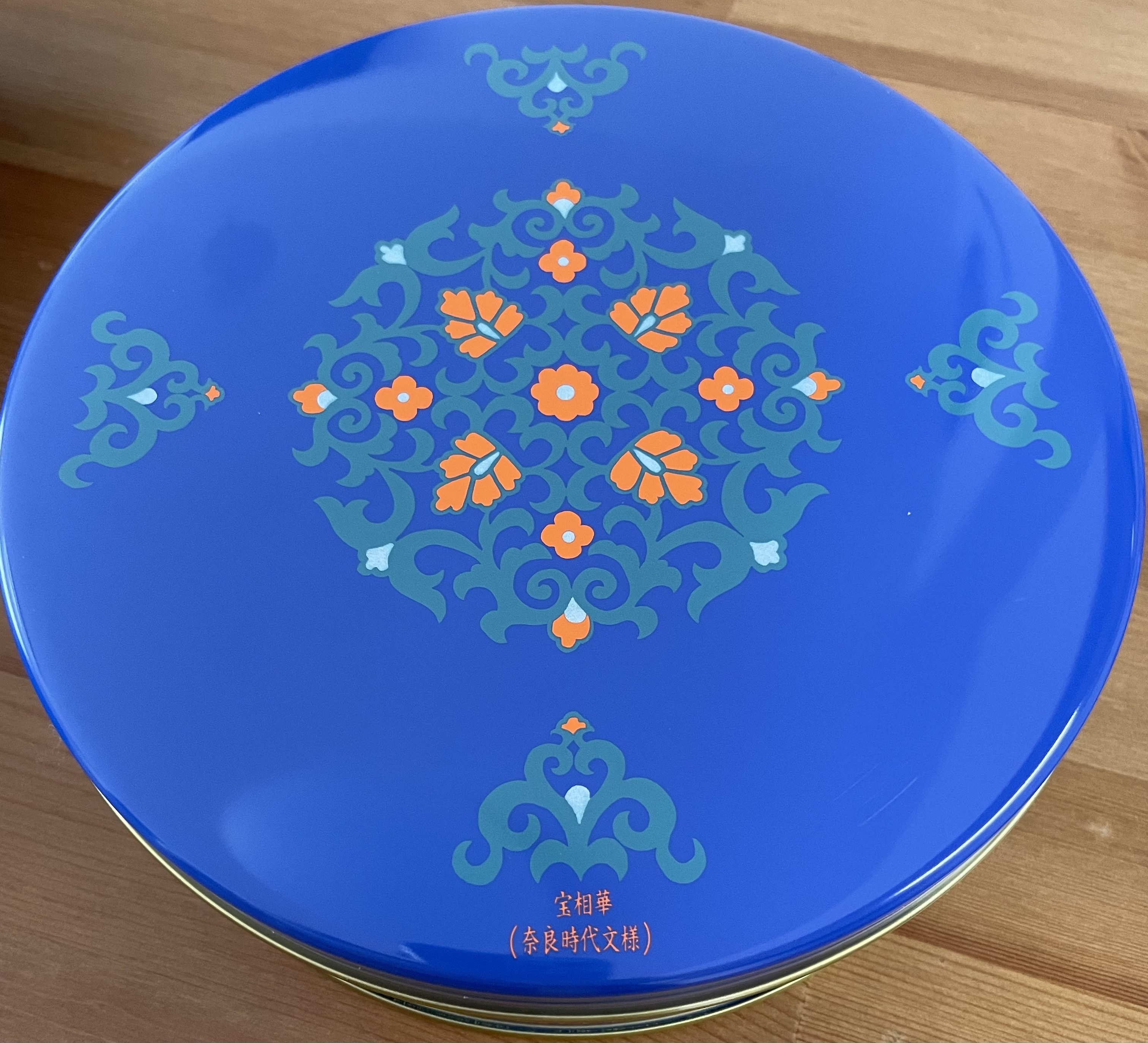 ブルーの缶は正倉院文様の宝相華(ほうそうげ)をデザインしました。