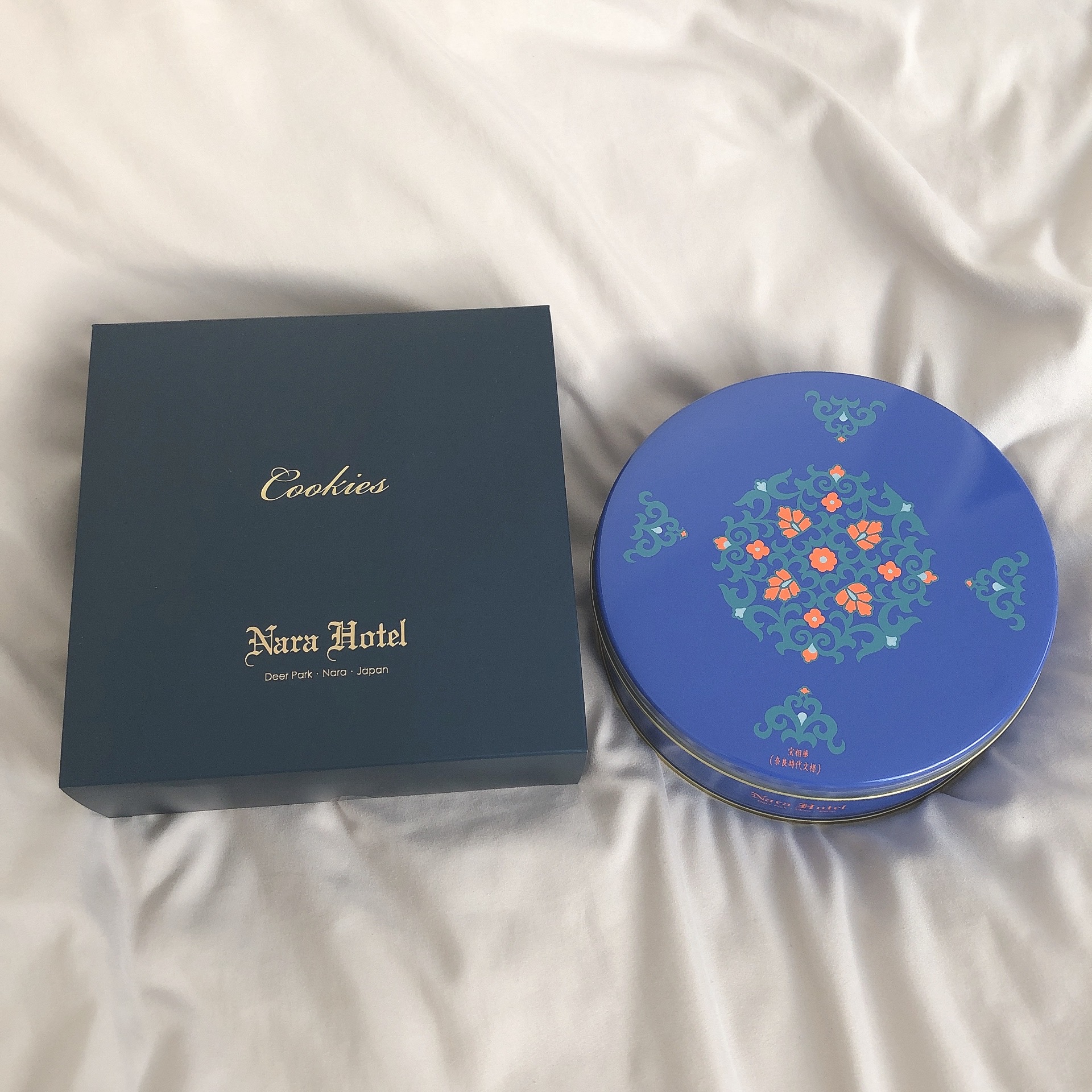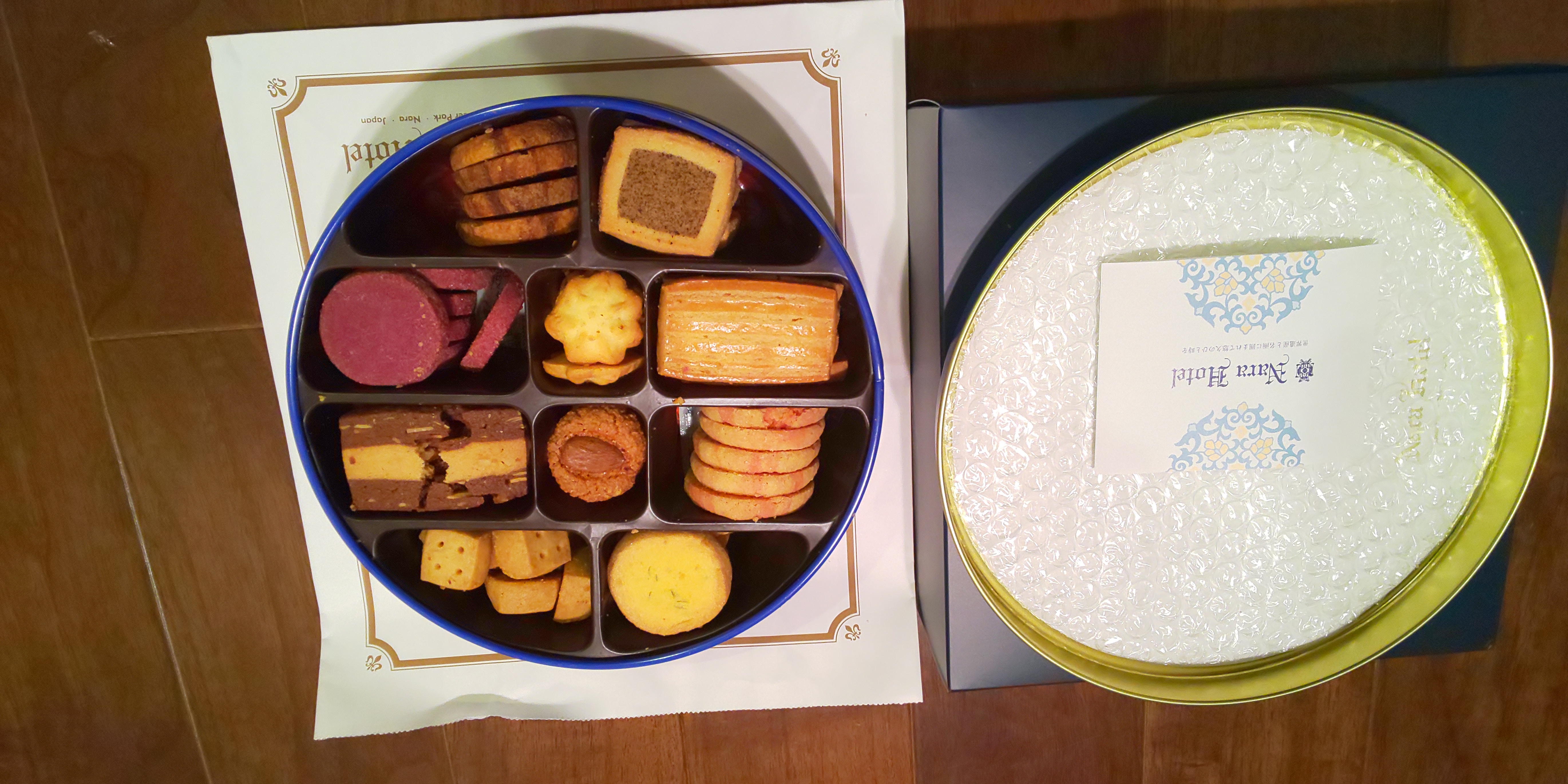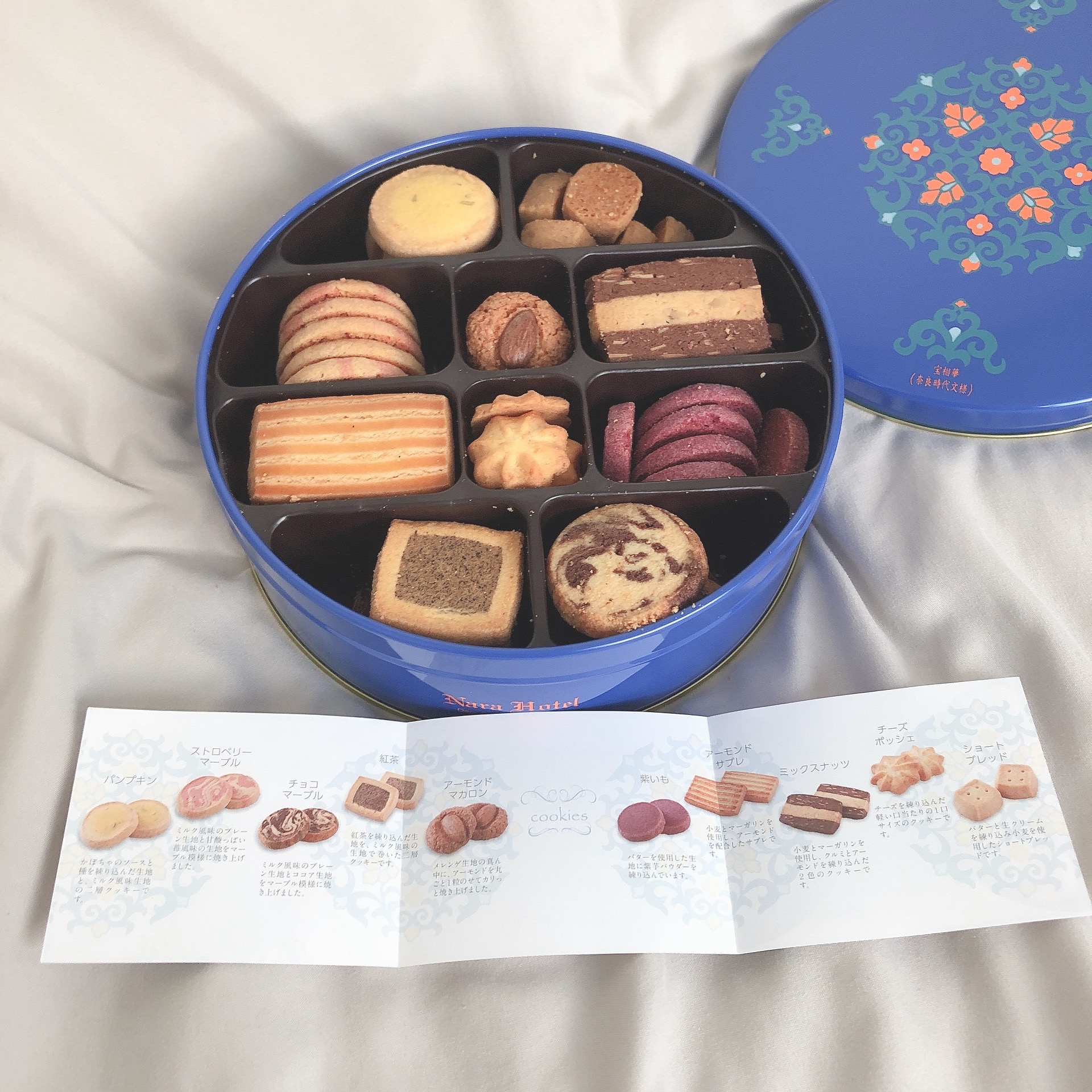 正倉院の宝物にも用いられた奈良時代の文様である宝相華(ほうそうげ)がデザインされたブルーの丸缶の中に、レトロな風合いがあるクッキーを詰め合わせました。「パンプキン」は、かぼちゃのソースと種を練り込んだ生地と、ミルク風味生地の二層クッキー、ミルク風味のプレーン生地と甘酸っぱい苺風味の生地をマーブル模様「ストロベリーマーブル」、バターを使用した生地に紫芋パウダーを練り込んだ色鮮やかな「紫いも」など計10種。それぞれ味が異なり、甘さ控えめでサクサクの口当たりが特徴。ホテル同様クラシカルな雰囲漂う気懐かしい味わいです。