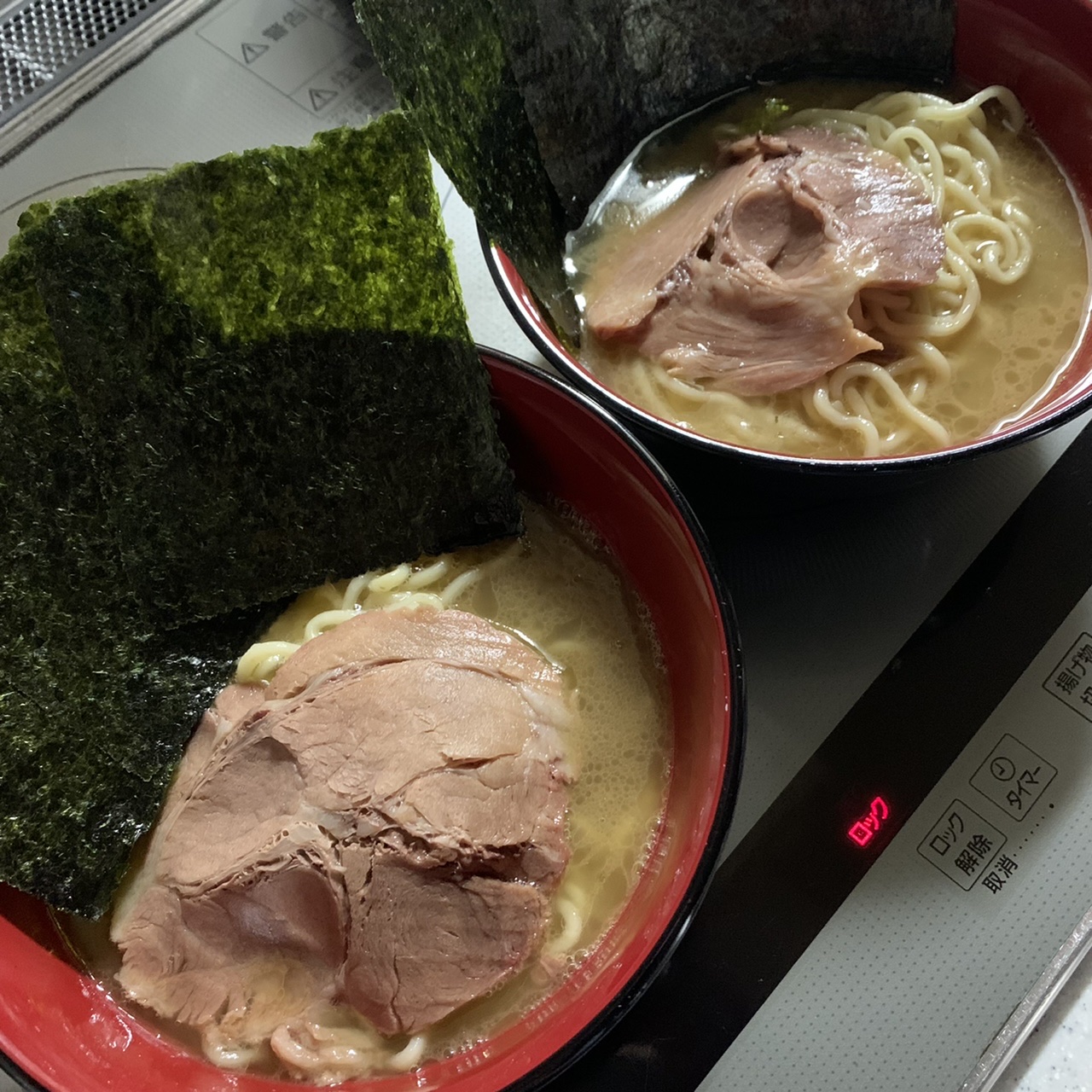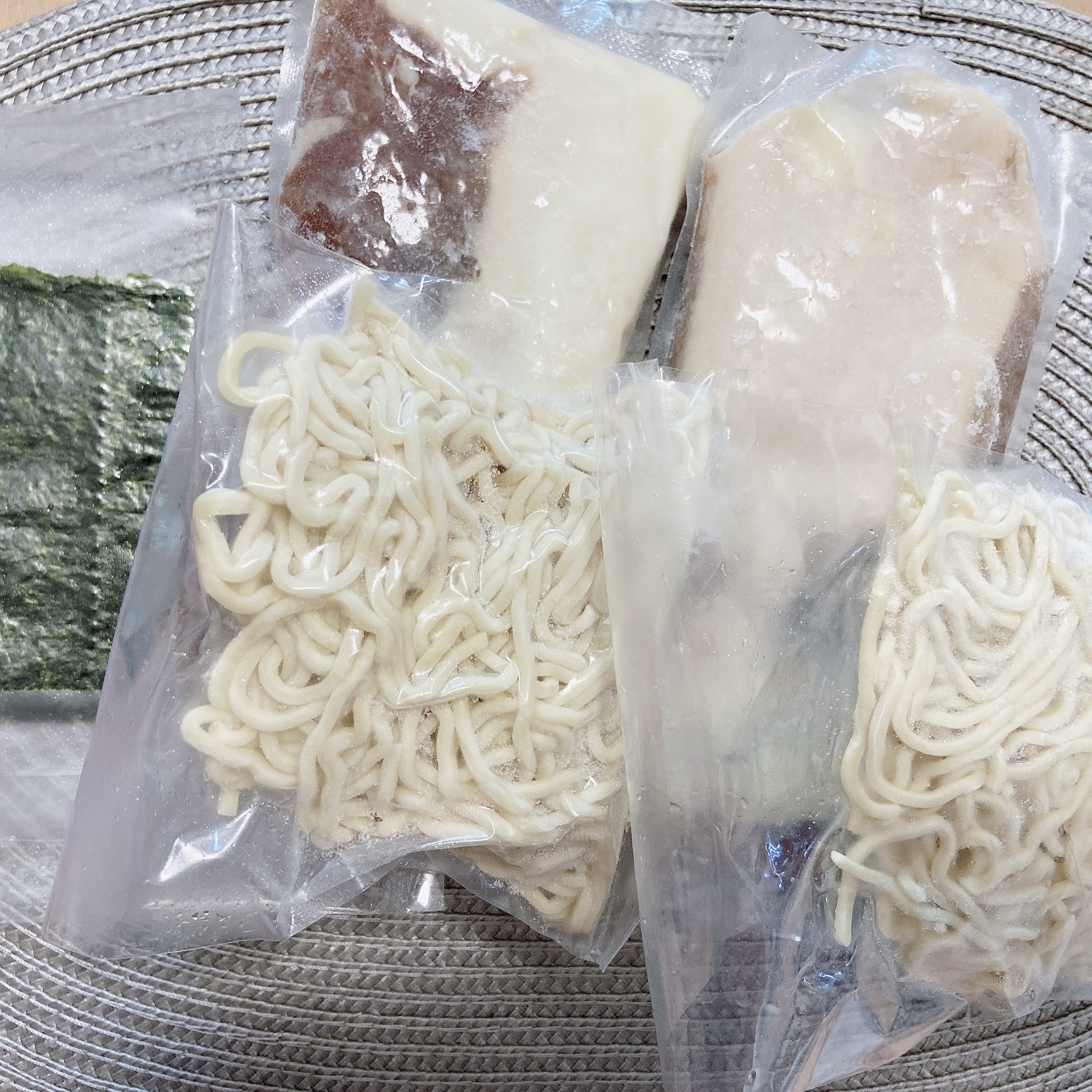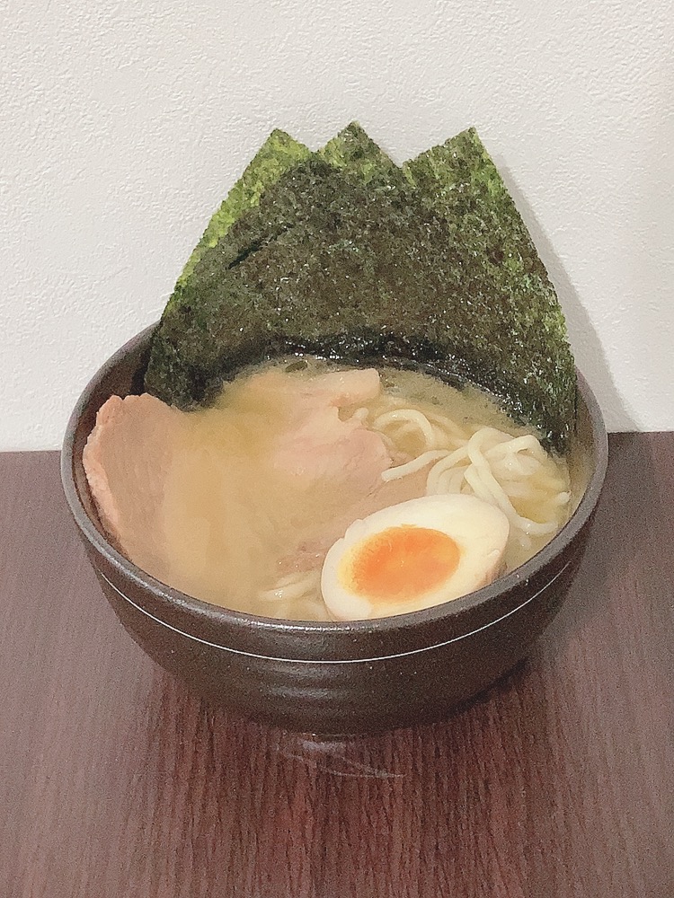 とんこつ醤油のスープは、冷凍状態で熱湯に入れて9分! 別鍋で冷凍状態の麺を中火で5〜7分で完成です! 湯切りをしたら器に盛って海苔を添えて、追加で茹で卵を加えました。