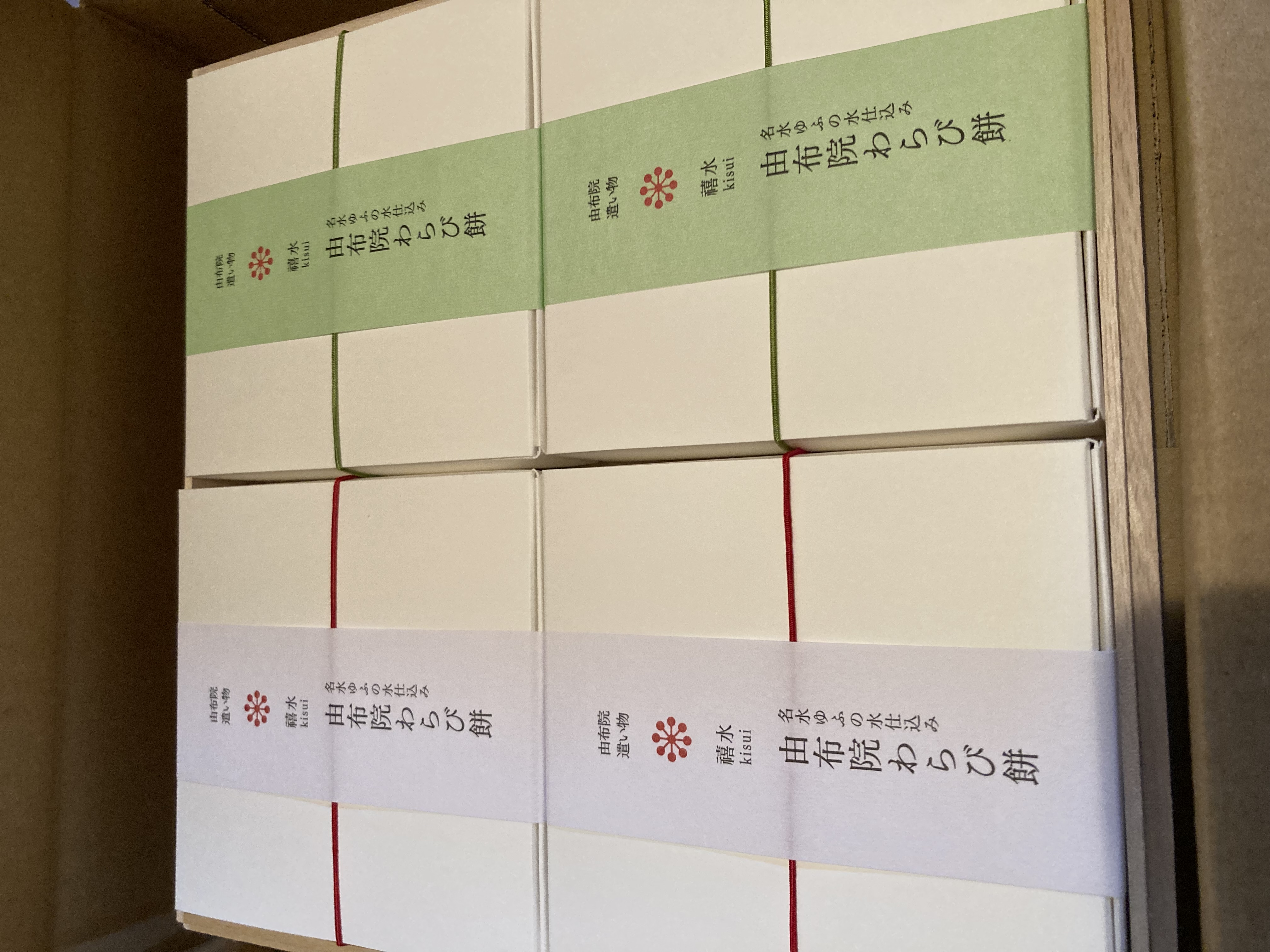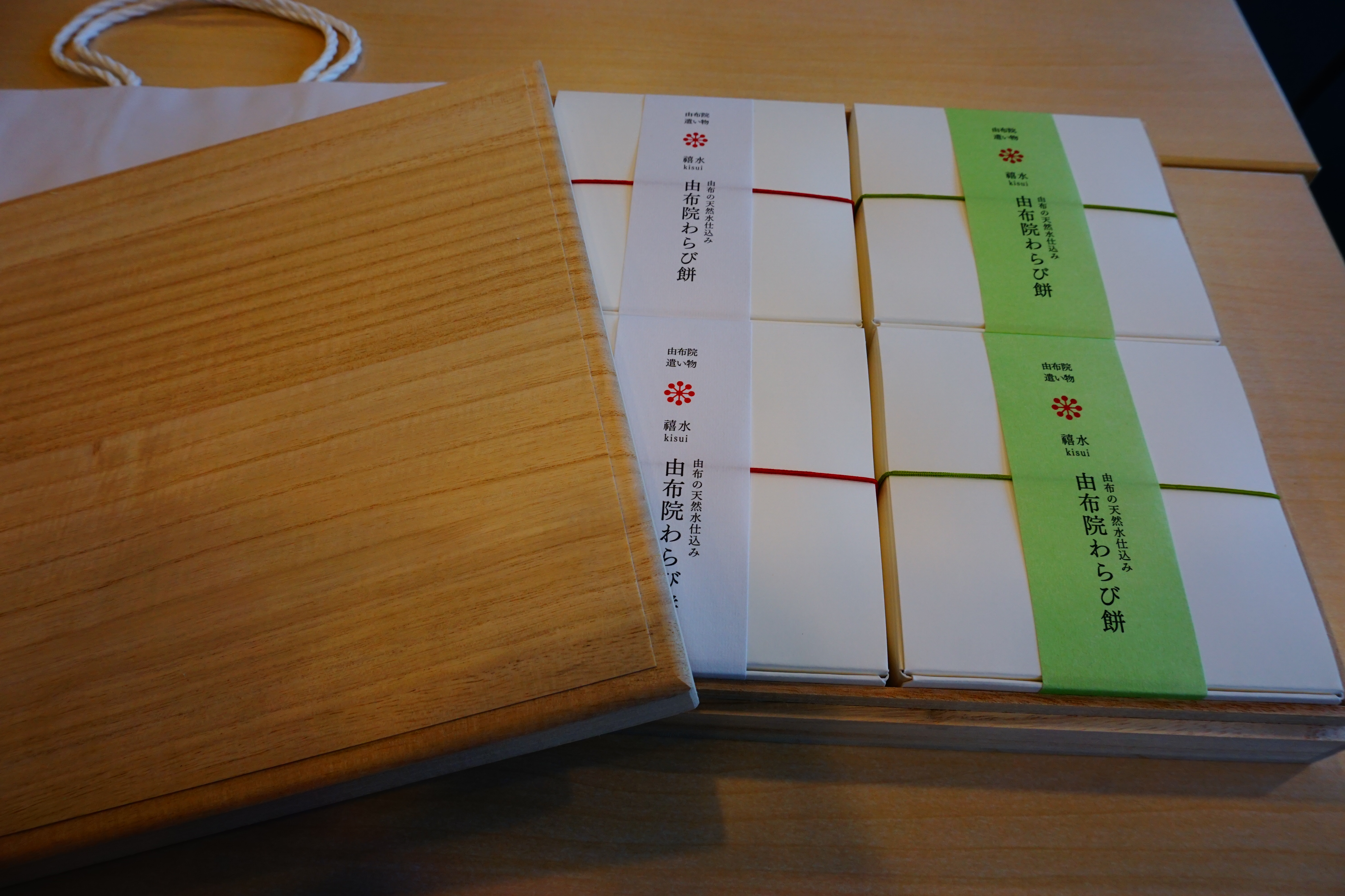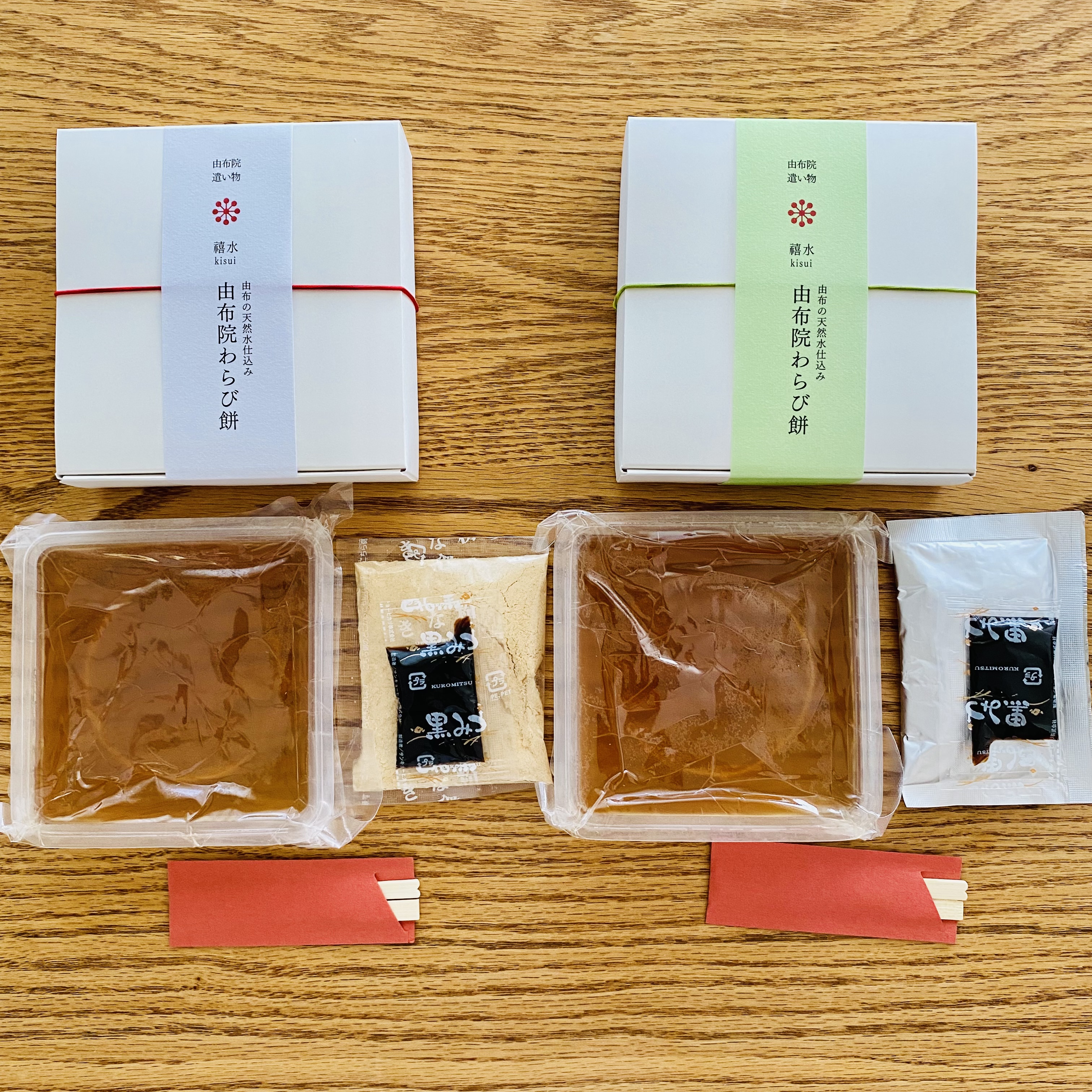 日本屈指の豊かな自然に恵まれた癒しの地・由布院の美しさを表現した「わらび餅」です。添加物、着色料、保存料等は一切使用せず、由布の天然水とわらび粉、てん菜糖、きな粉、抹茶など、国産素材のみを使用して作り上げています。長時間かけて手煉りでじっくり煉り上げることで、今までにない繊細な食感、とろける口どけ、上品な味わいを生み出しています。抹茶の緑が美しい「抹茶きな粉味」、香り高い「きな粉味」の2種が桐箱に入って届くので、贈り物にもお勧めです。