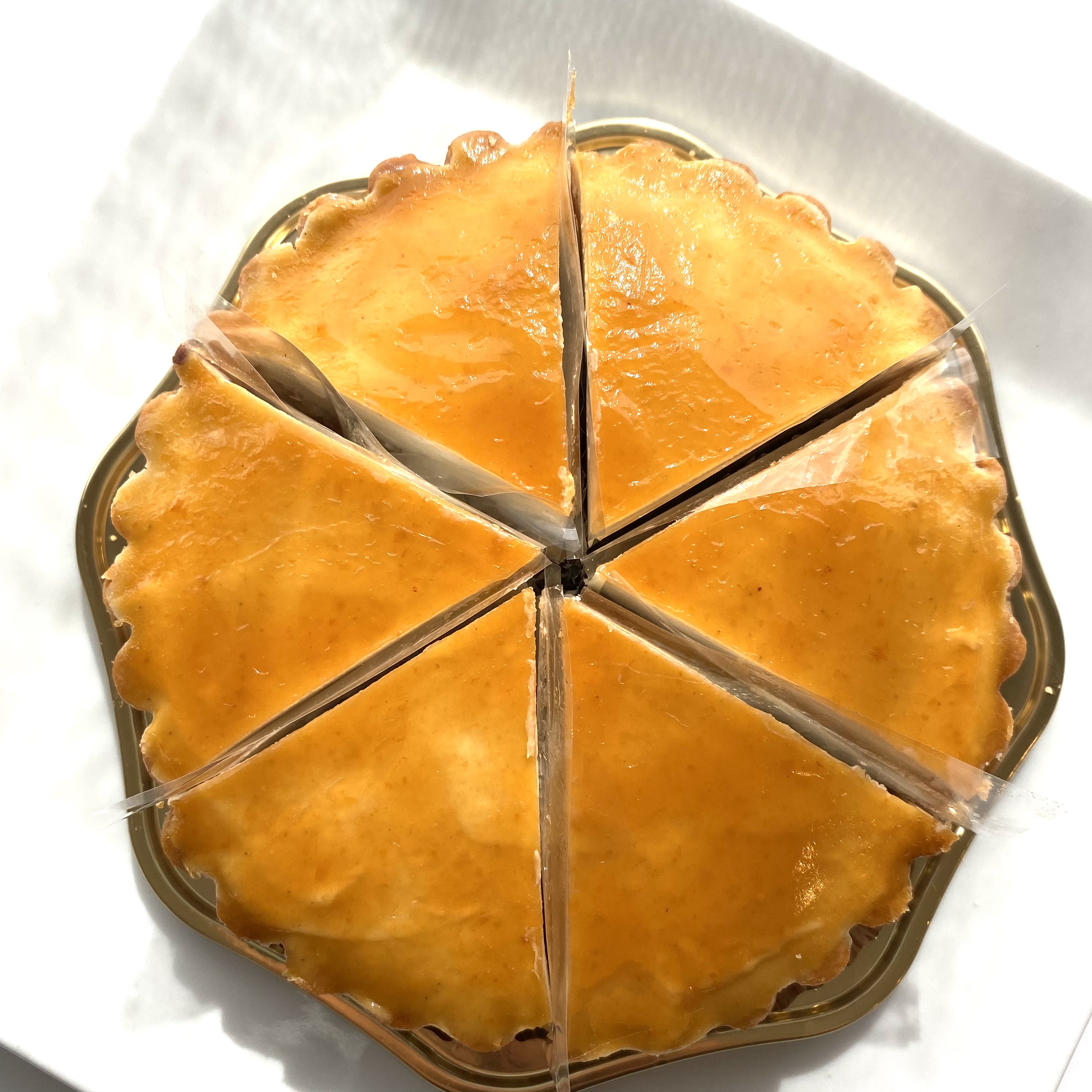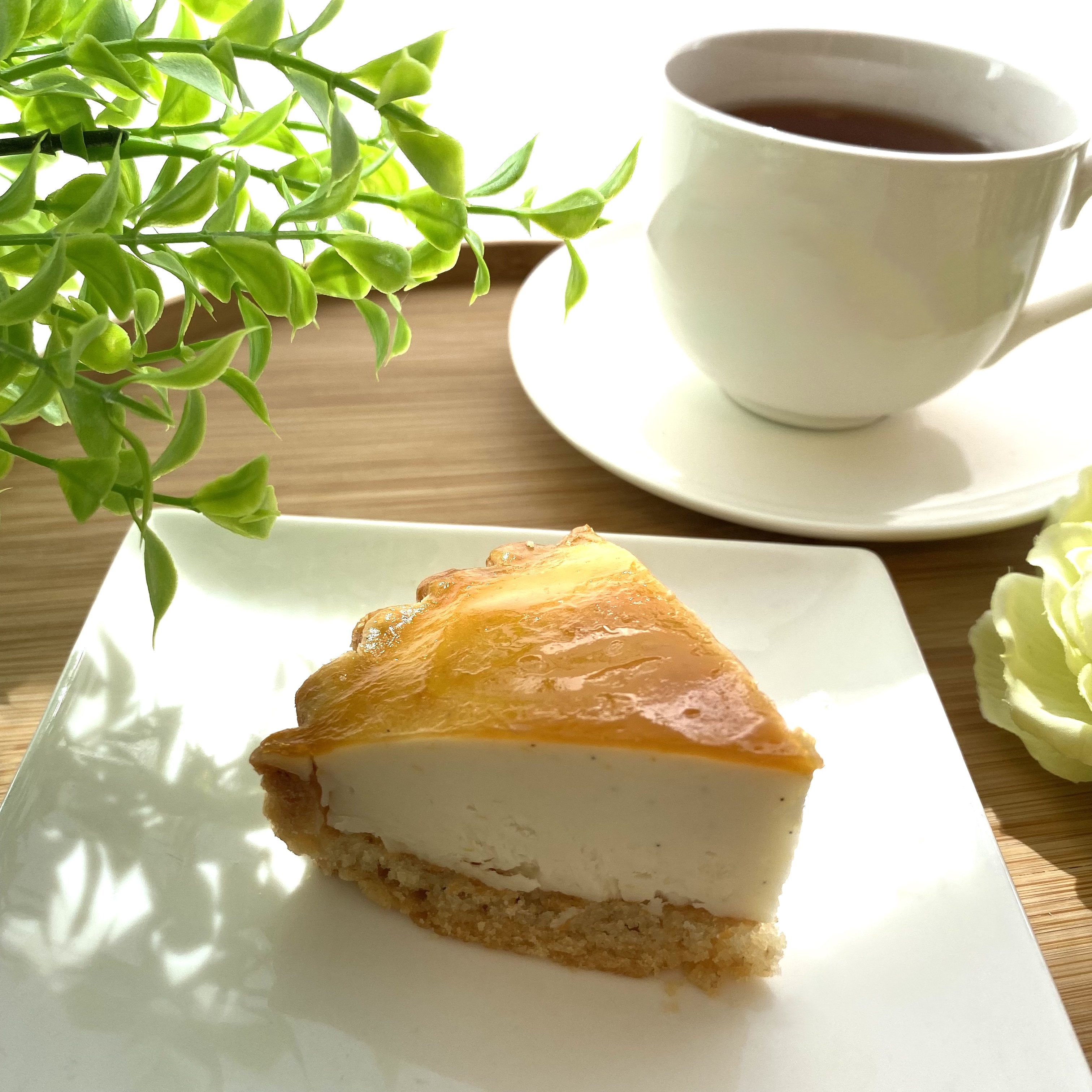 濃厚なのにさわやかで軽やか、植物性100%の「レアチーズケーキ」です。ミルキー感や発酵感をだすために、カシューナッツや豆乳ヨーグルト、オリジナルの豆乳クリームをベースに、白ワインビネガー等を加えています。レモン皮のすりおろしが丸ごと1個分入りで、香りも爽やか。トップにりんごジュースで甘さをつけたアプリコットジャムを塗って艶やかに仕上げています。国産小麦で作った香ばしいタルトのサクサク感がアクセント。有機アーモンドパウダーを使用したアーモンド生地がコクをプラスしています。カット済みで届くので、案外難しいカットが不要なので便利です。