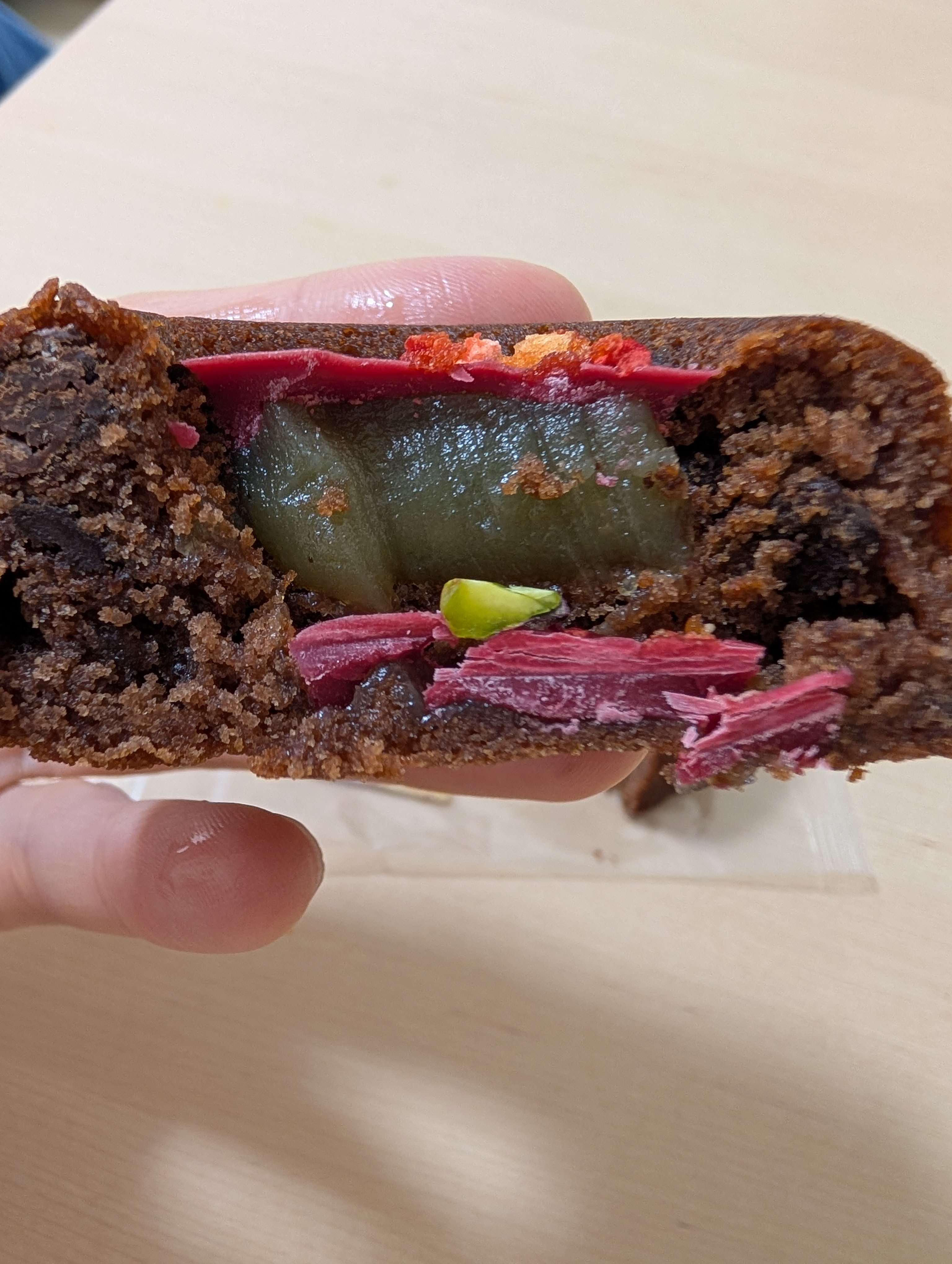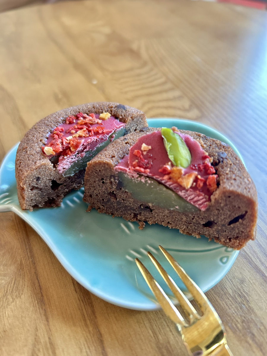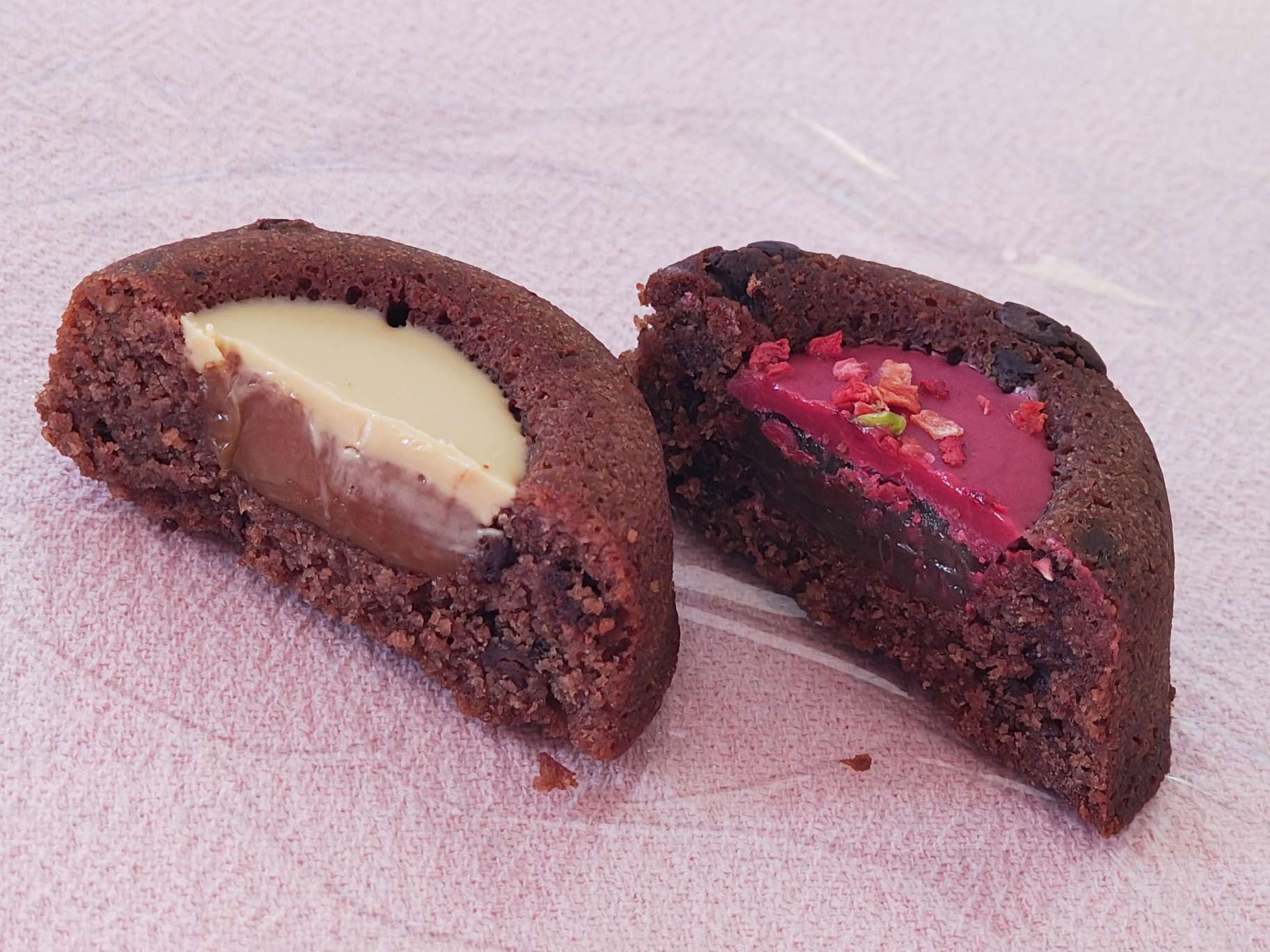 そこで、ケーキのように柔らかいクリームやジュレを重ね、複雑な味わいを伝統的なお菓子のかたちで表現することを目指しました。焦がしバターを加えたしっとり生地にチョコチップを混ぜ込み、伝統の要素を守りながら、中の具材に工夫を凝らしています。