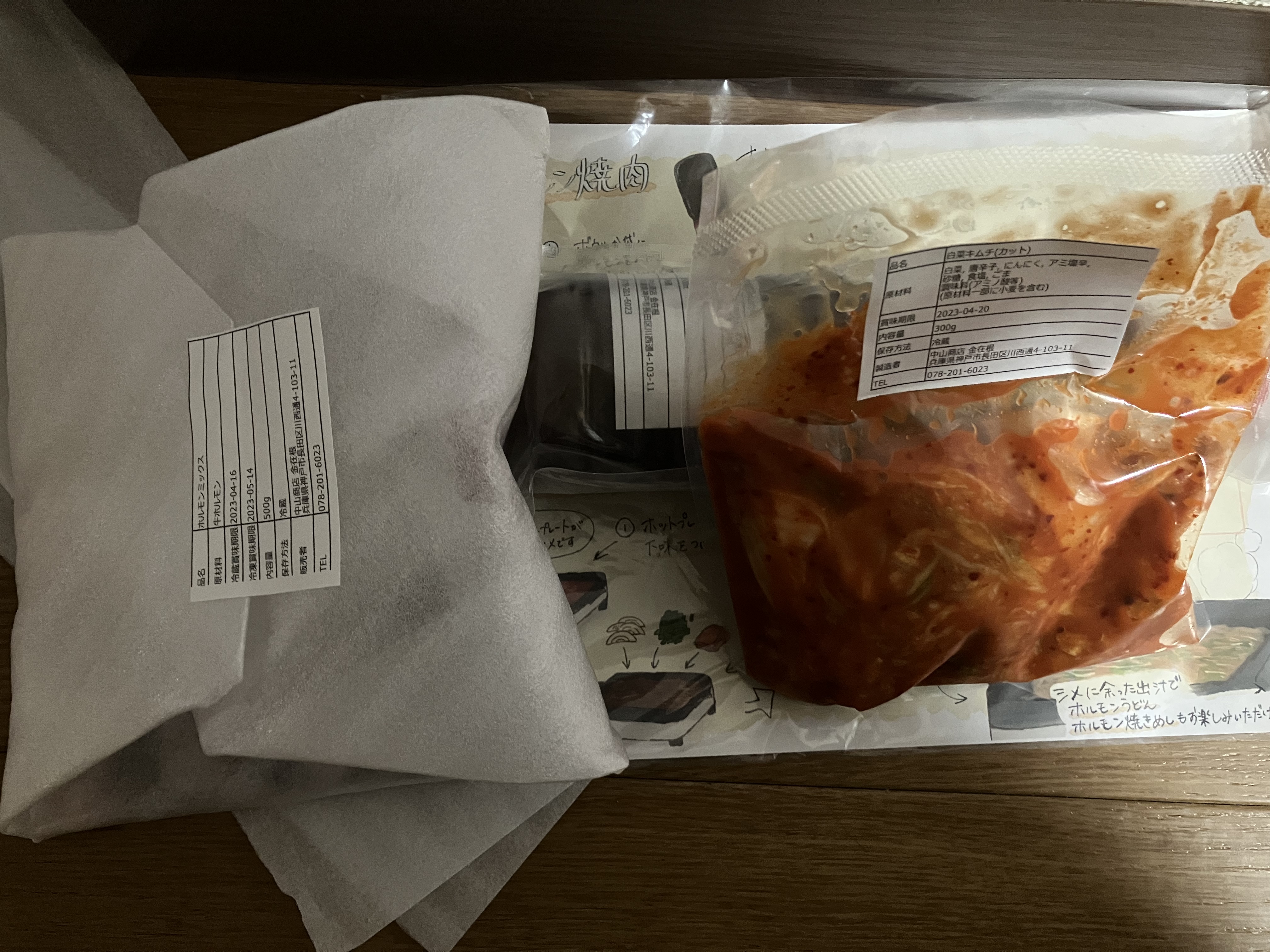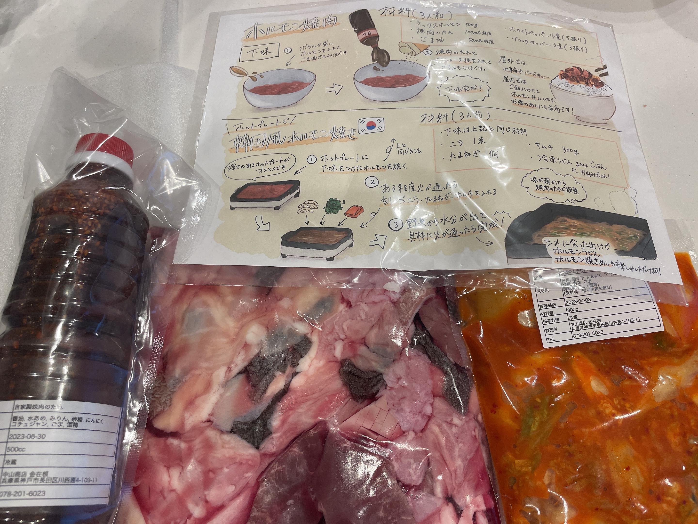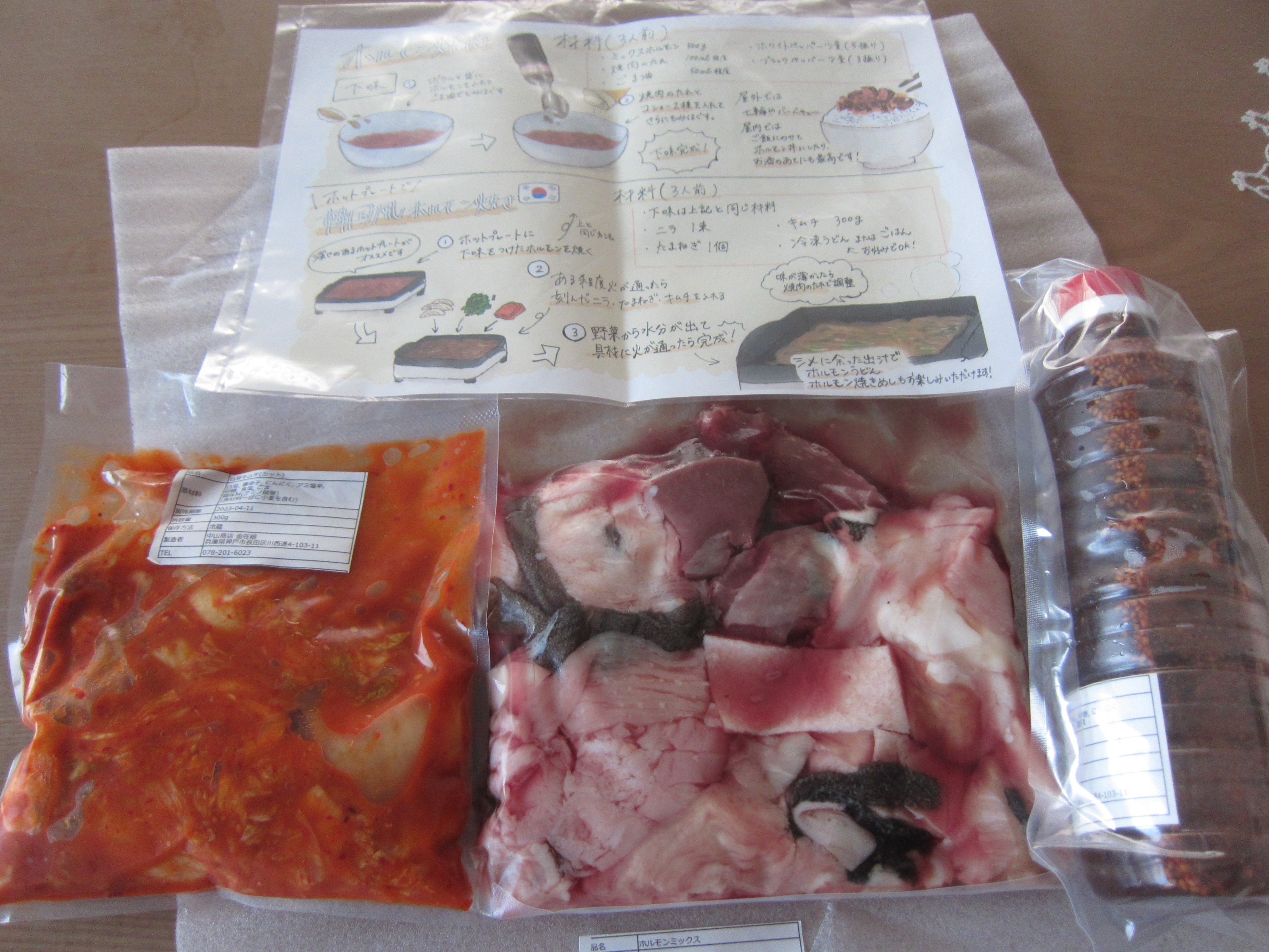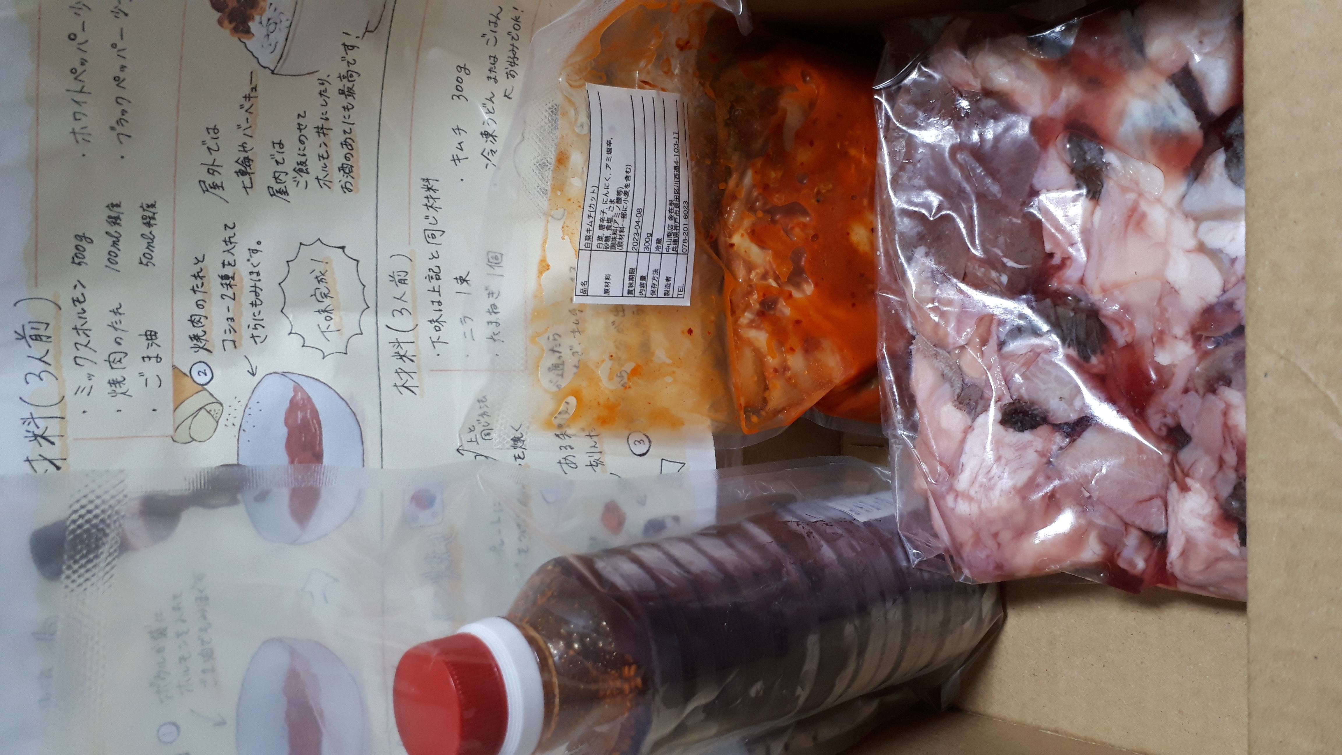 箱を開けると、ホルモンミックスと白菜キムチ、自家製焼肉のタレ、美味しい食べ方の説明書が同封されていました。自家製焼肉のタレは「え?これ多くない?余るよね?」と思うほどたっぷりです。そしてホルモンミックスも、ずっしりと重みを感じるボリューム感でした。アカセンマイ、センマイ、大腸、小腸、ハチノス、ミノ、ハート、ハツモトなど6〜8種類のホルモンが入っているとのことです。食べたことない部位も入っていて胸が高鳴ります。食べ方の説明書も、手作り感があり、好感度が増しました。