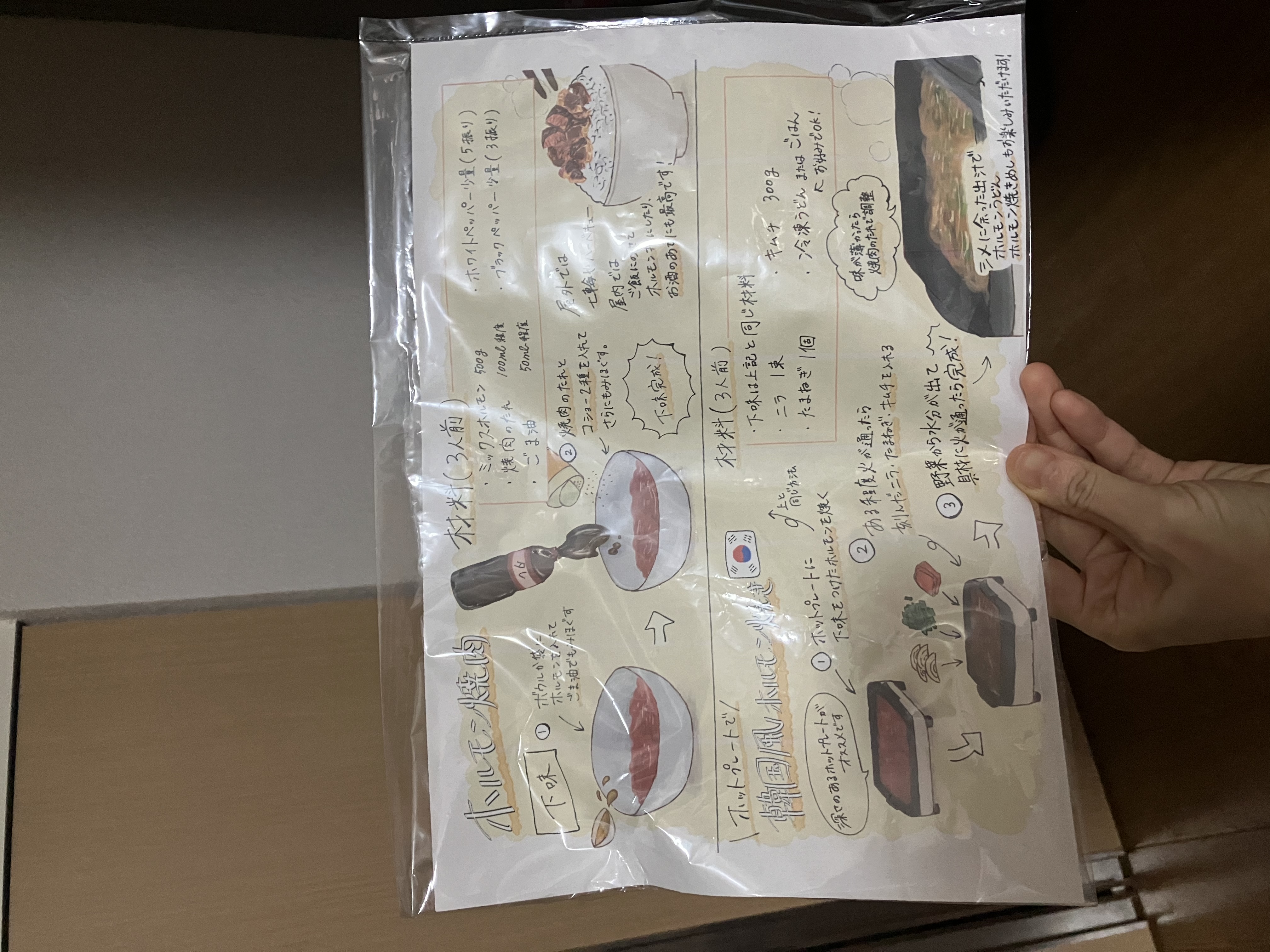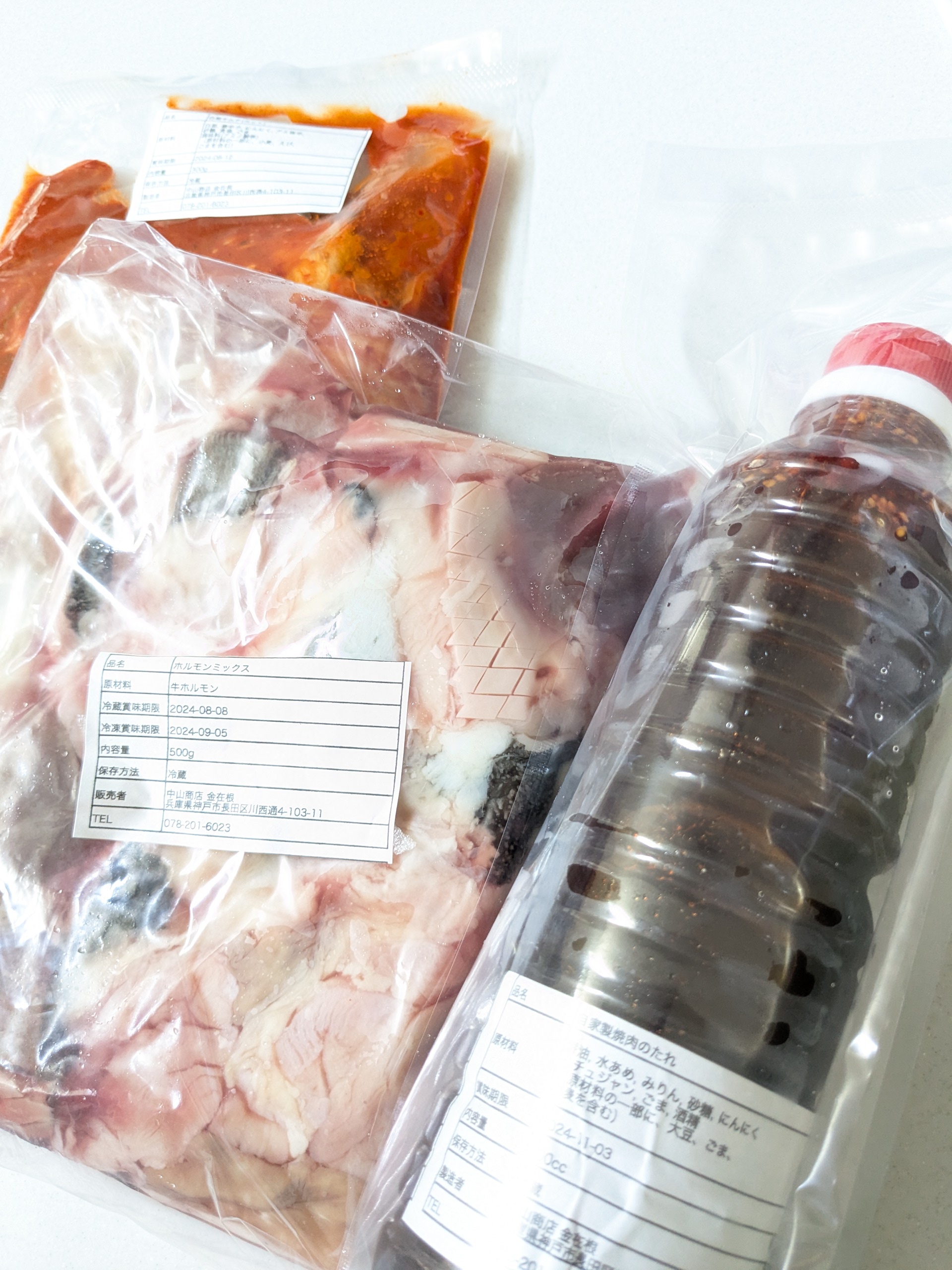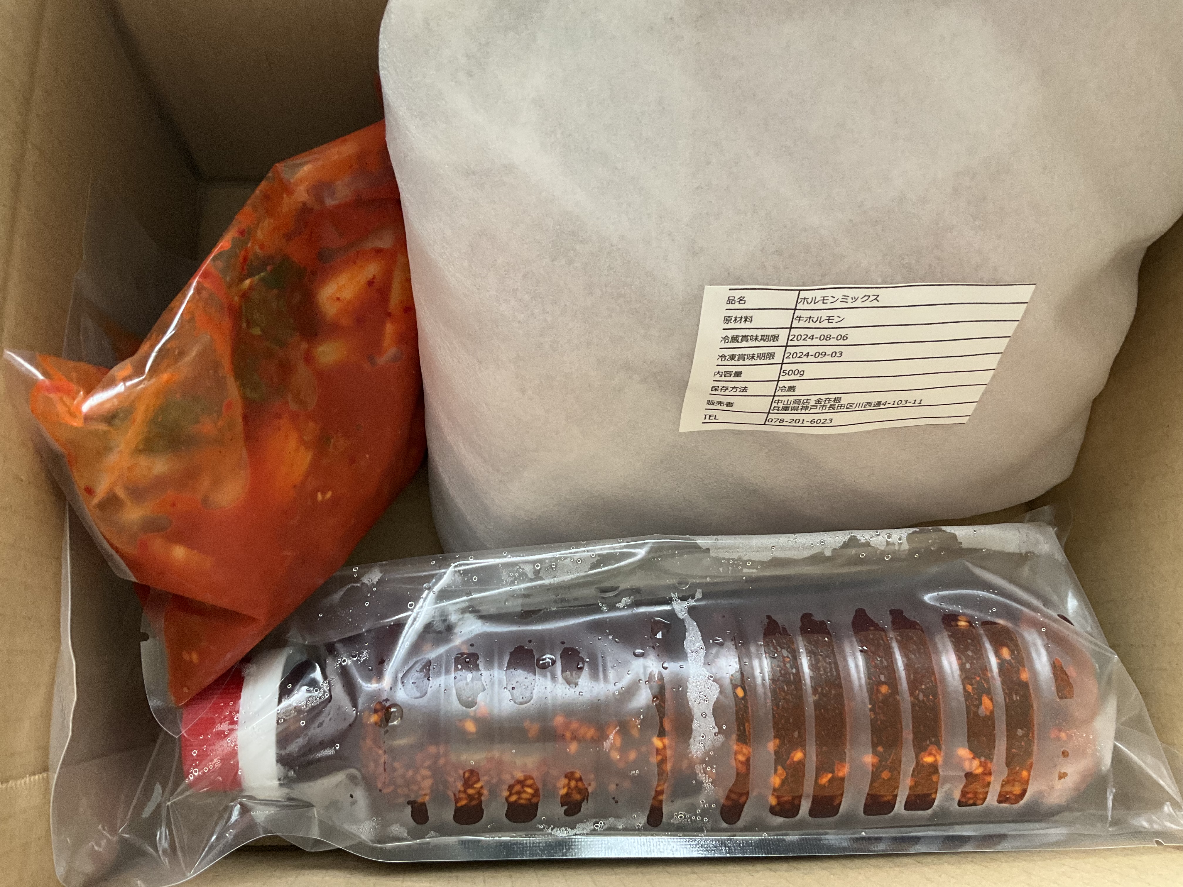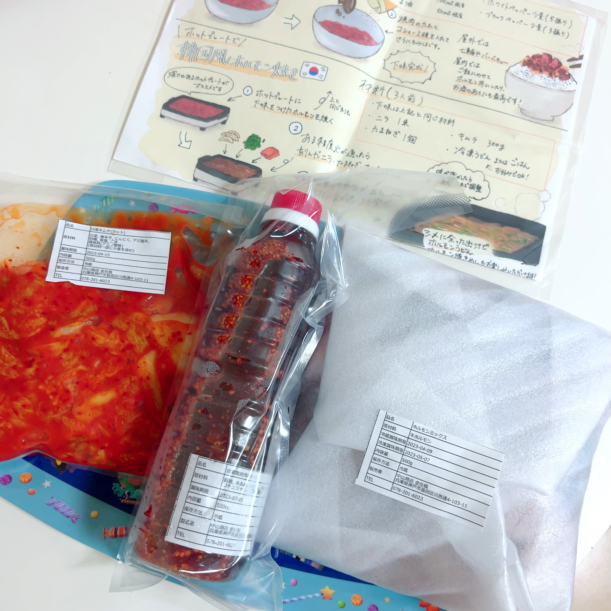 箱を開けると、ホルモンミックスと白菜キムチ、自家製焼肉のタレ、美味しい食べ方の説明書が同封されていました。自家製焼肉のタレは「え?これ多くない?余るよね?」と思うほどたっぷりです。そしてホルモンミックスも、ずっしりと重みを感じるボリューム感でした。アカセンマイ、センマイ、大腸、小腸、ハチノス、ミノ、ハート、ハツモトなど6〜8種類のホルモンが入っているとのことです。食べたことない部位も入っていて胸が高鳴ります。食べ方の説明書も、手作り感があり、好感度が増しました。