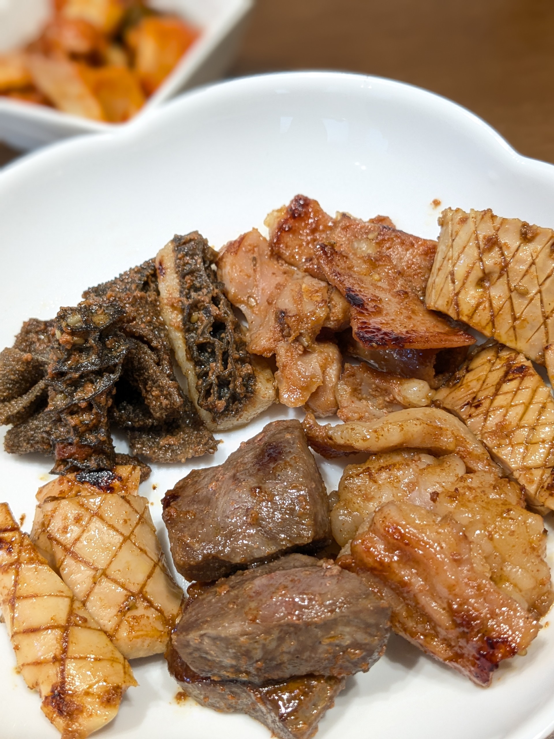 焼いている間に、フライングでキムチを一口。これは美味しい!これまで食べてきたキムチの中で1番美味しかったです。そして、まずはセンマイ。「んん!新鮮!歯応えもいい!」ホルモン特有のくさみもありません。美味しいです。精肉店によく買い物に行くのですが、そこで購入するセンマイより新鮮な気がします。他の部位も、非常に柔らかく驚きでした。特に大腸が私のお気に入りです。こんなに様々な部位を一度に食べ比べる機会はないので、楽しいです。また途中で食べるキムチがホルモンに本当に合います。あっさりしていて、辛すぎないので、辛いのが得意でない方にもいいかもしれません。