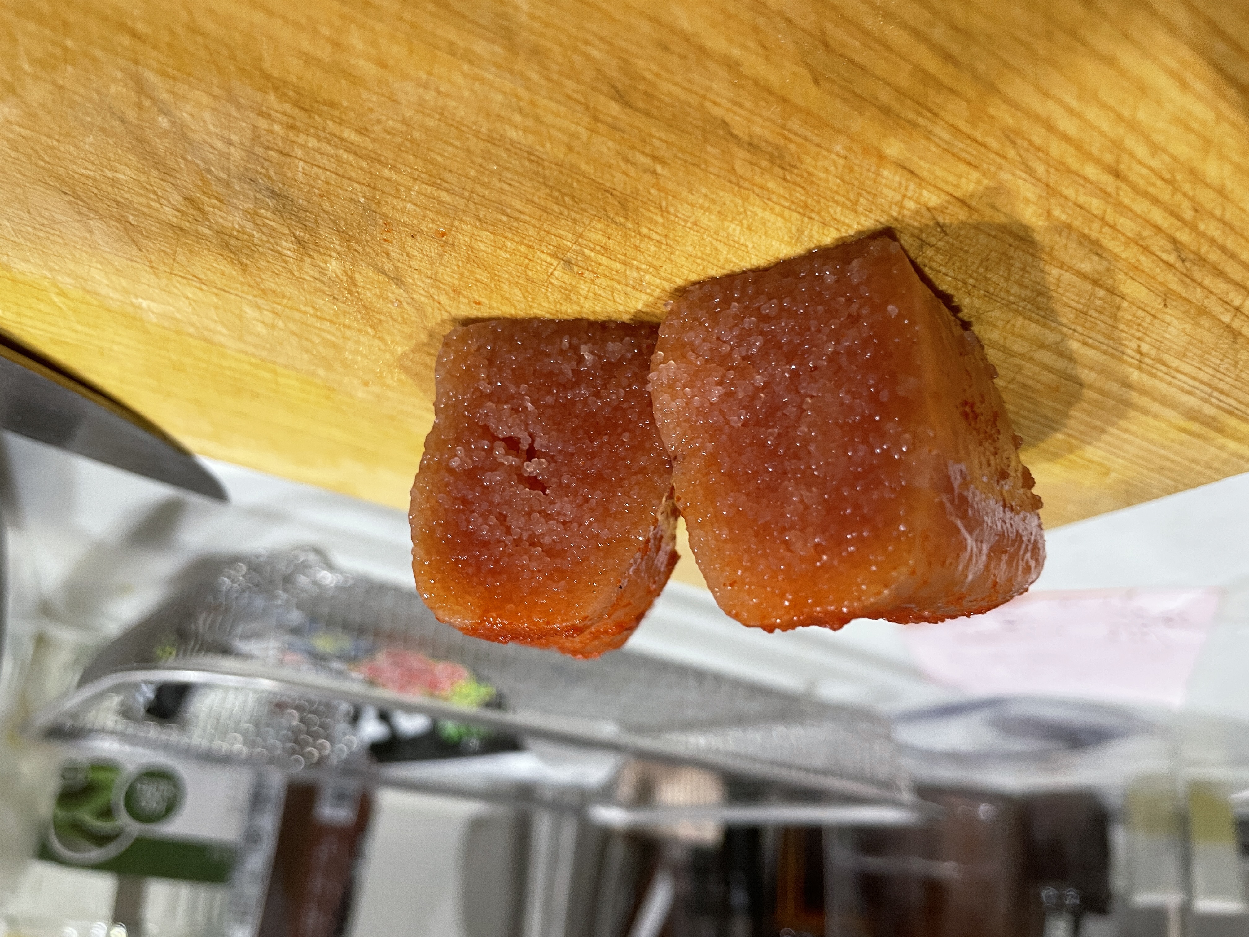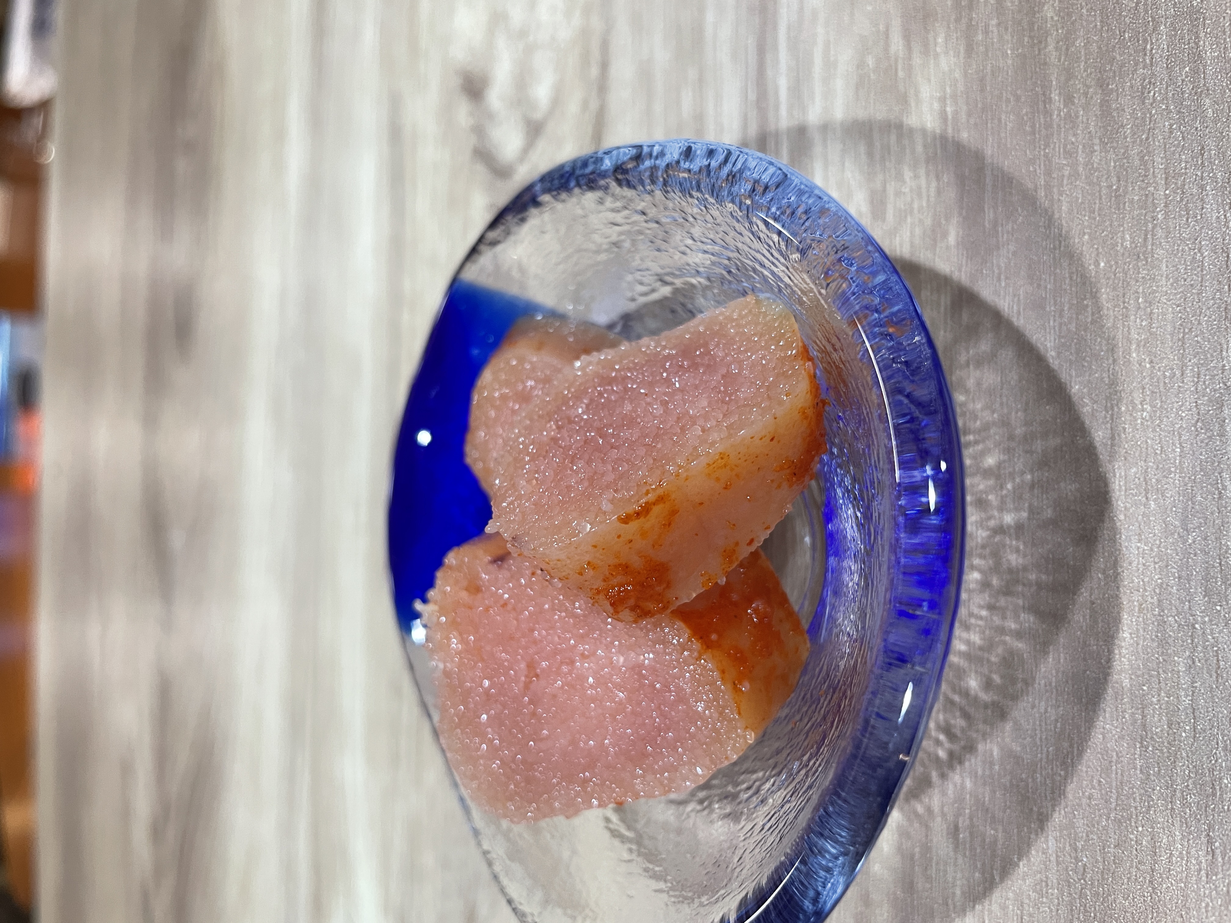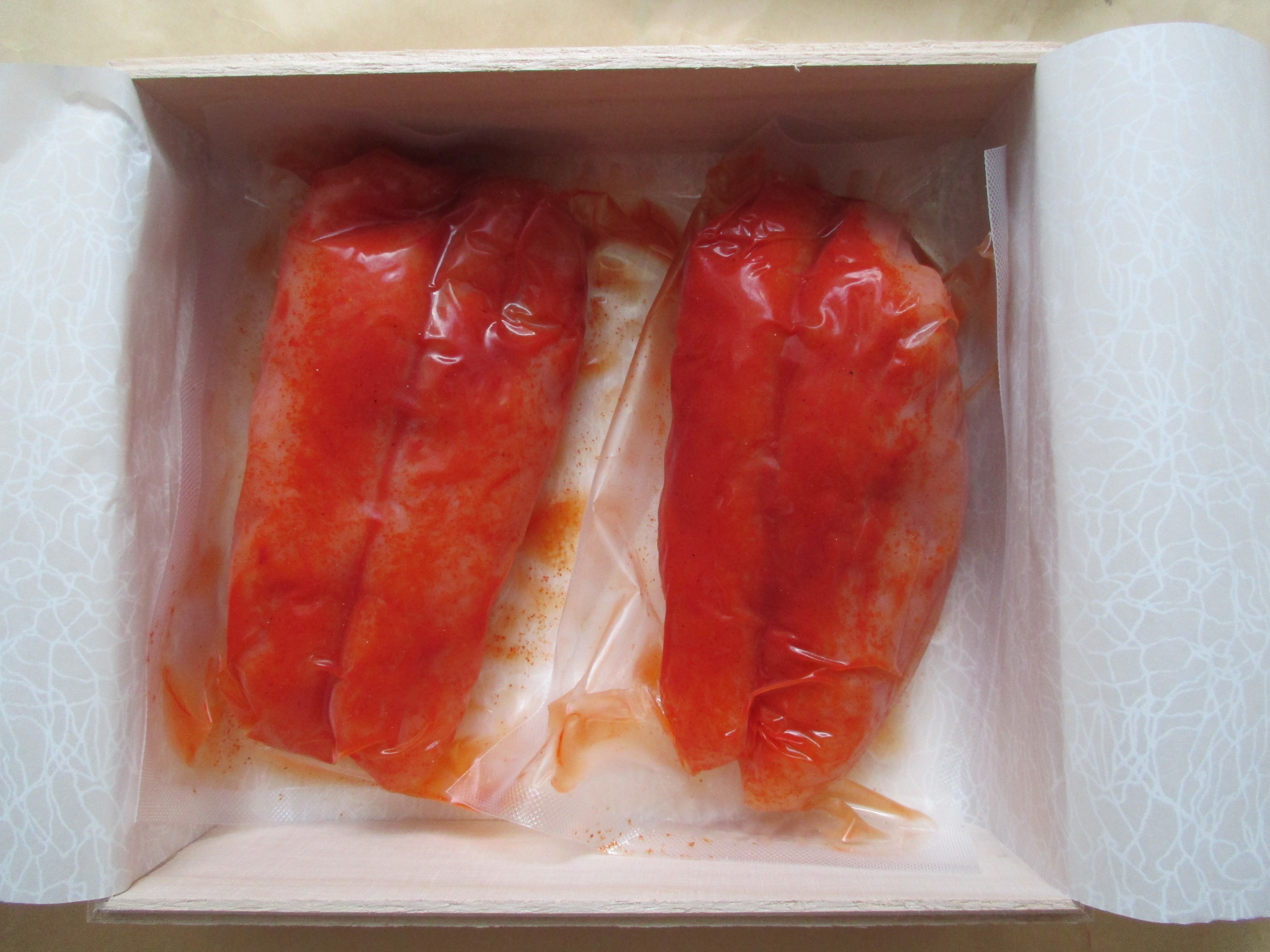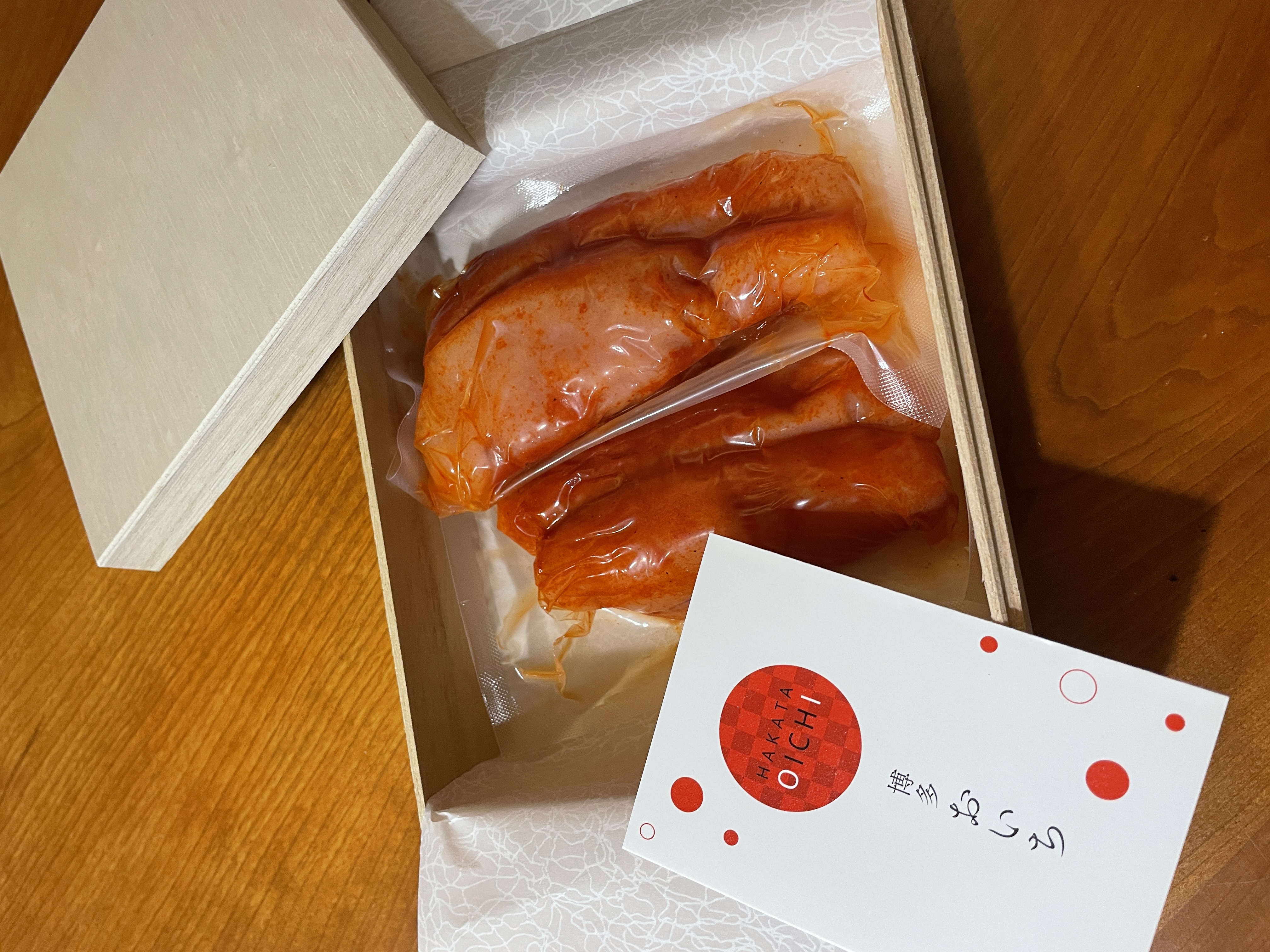 明太子の粒を連想させる赤い水玉模様の包装紙を開けると、
