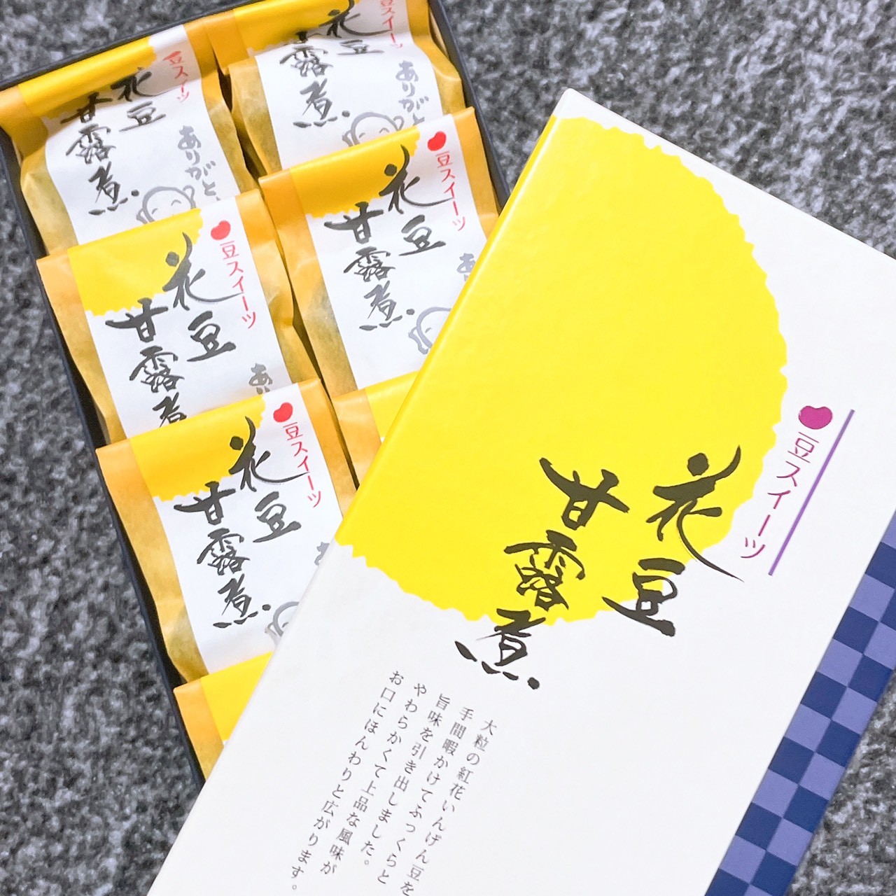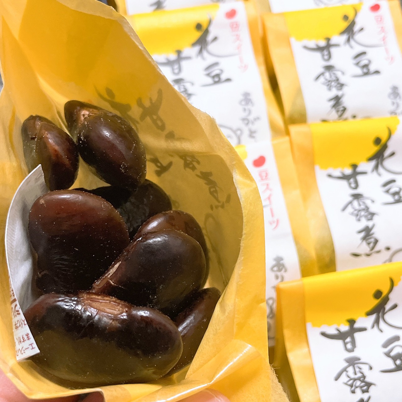 花豆をゆっくりと砂糖で煮込んだ「甘露煮のお菓子」です。花豆はインゲン属の中の「べにばないんげん」のことで、 赤花の子実は紫の地に黒色の斑が入っているものが「紫花豆」といわれます。花豆独特の香りがあり、冷めてもホクッとなめらかな食感が残るのが特徴です。3日間も寸胴で煮込んでいるので、ふっくらと柔らかく、優しい甘さが後を引きます。手で持ってもべとべとしないのでお菓子感覚で楽しめます。お茶菓子やお盆やお供えのお返しの品としてもおすすめです。
