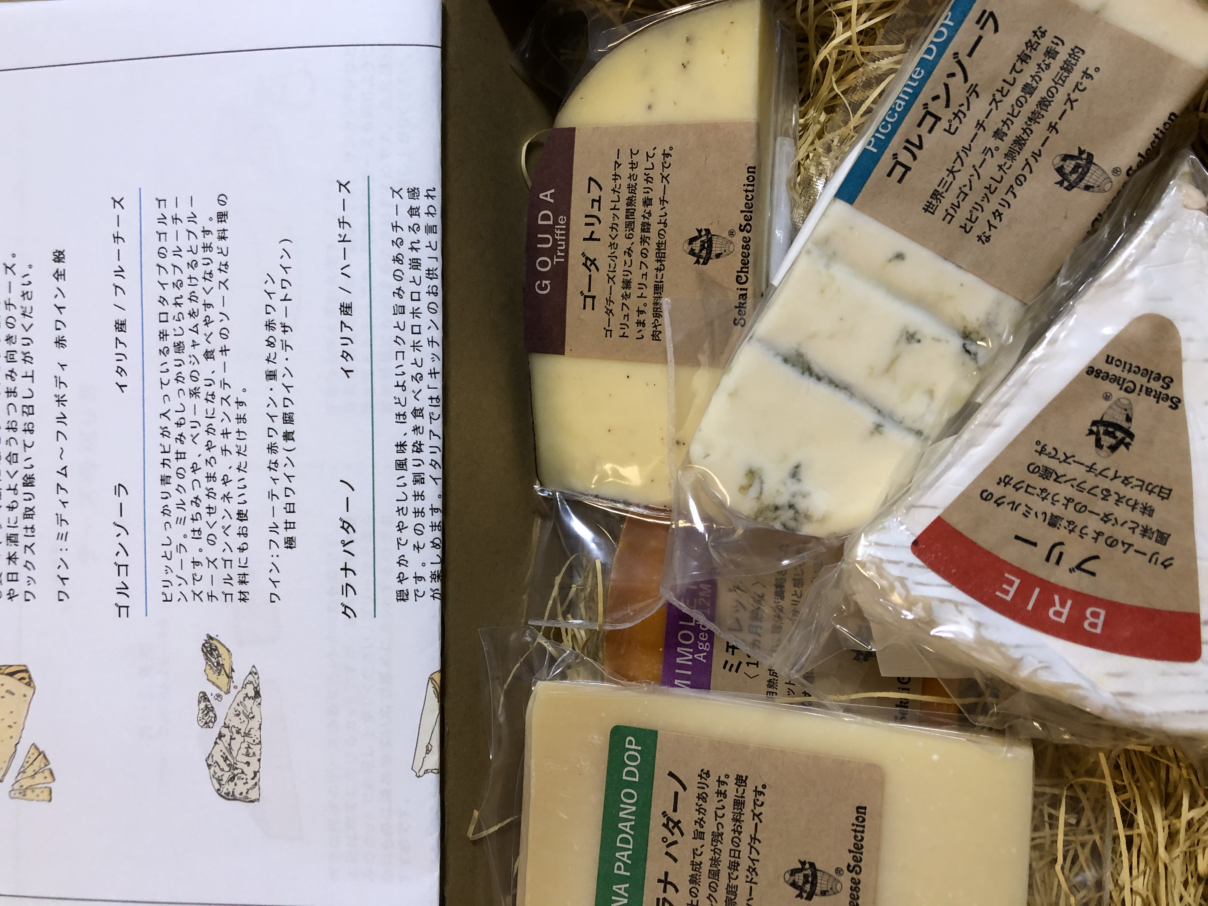 柔らかくて食べやすいタイプのチーズやブルーチーズ、トリュフが練りこまれた珍しいチーズ、お料理にも使いやすいグラナパダーノやミモレットのセットです。
