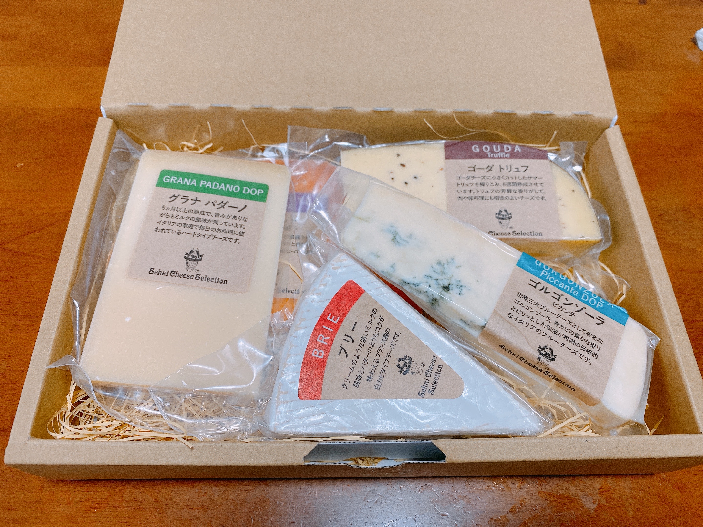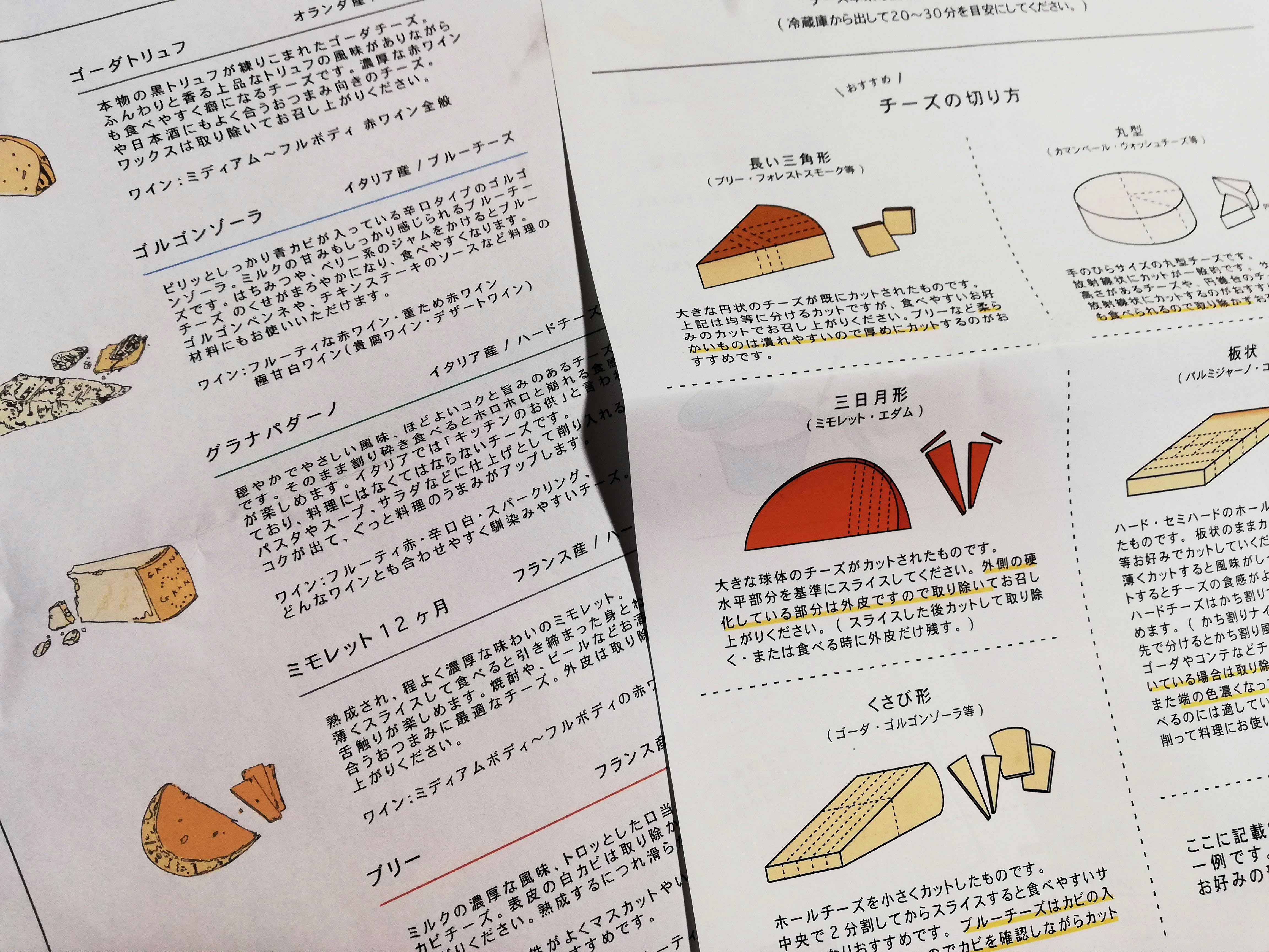 中にはそれぞれのチーズの説明書と食べ方、切り方、保管方法の用紙と5種類のチーズが入っています。