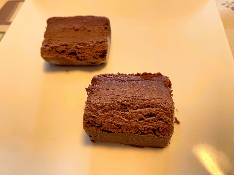 冷蔵庫で解凍してから→冷凍状態よりも生地に粘度を感じるが、やはりくちどけが良い。口の中に留まる時間が冷凍状態よりも長い為、よりチョコを味わえる。