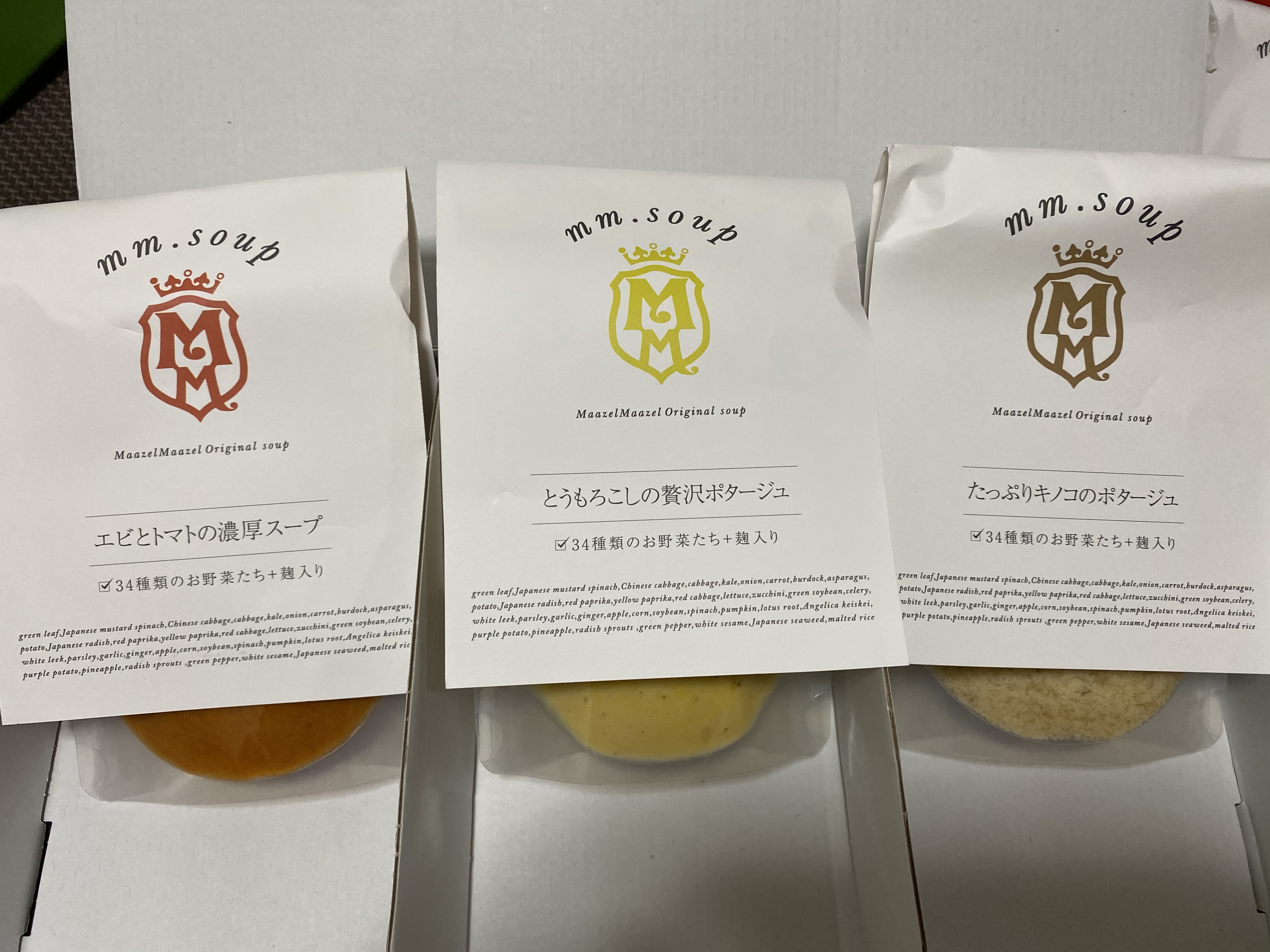 3種とも、同じような見た目で、お味も共通して、優しいふんわりした味なのですが、主張しすぎずに、それぞれのいいところが出ているというか、、キノコの風味を感じ、アスパラと玉ねぎははじめ想像つかなかったのですが、いただくと、自然に喉を通るしっくりくる味で、でも、ほどよくアスパラの風味を感じました。白ネギと生姜も、生姜風味がやんわり感じられて、想像以上に優しい味わいでした。