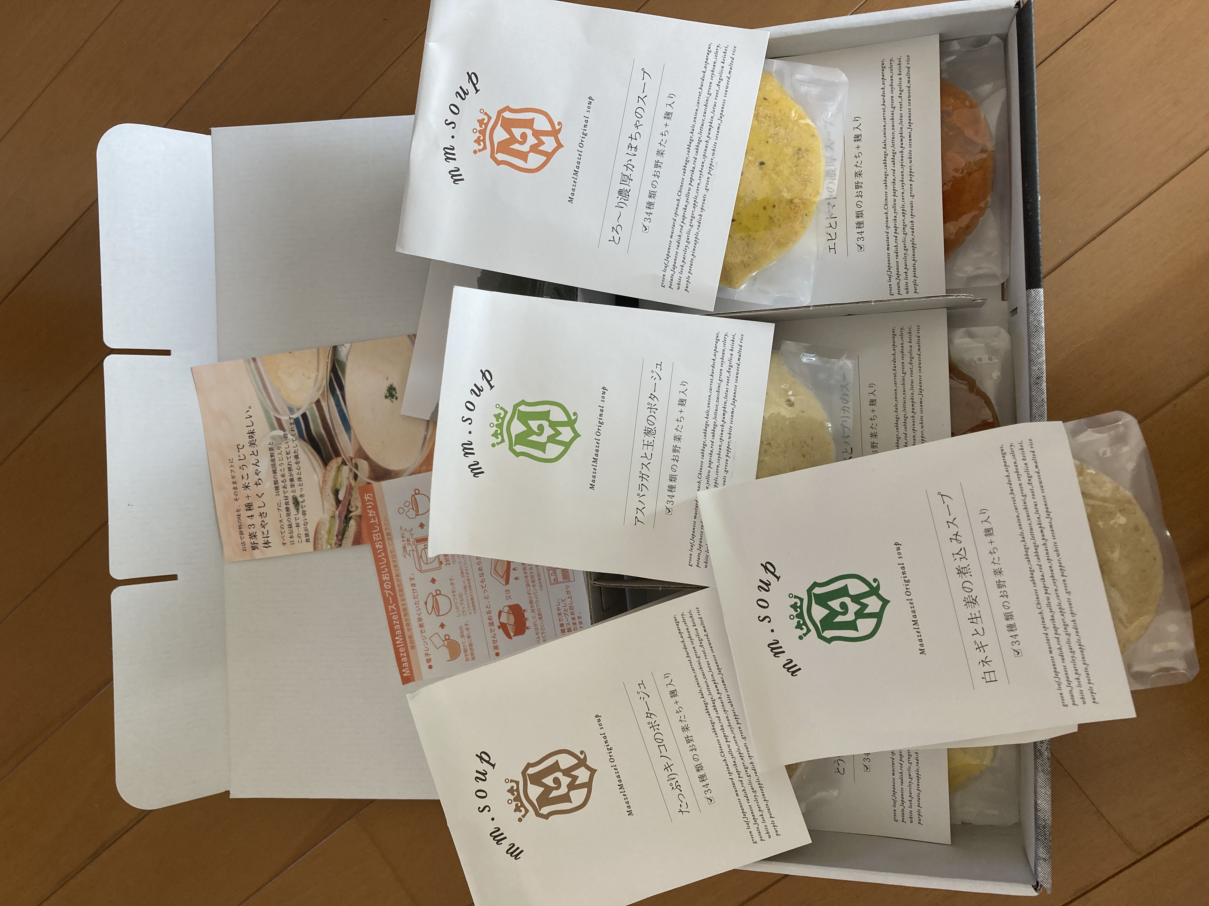 常温保存できるパウチに入っていて、電子レンジなら2分ほど、湯せんで5分、で、すぐ、食べれるので、早速いただきました。我が家は3人家族なので、まずは3種をシェアしていただきました。この日は他にメインもあったので、全部優しい味とは思いますが、中でも特に優しそうな、たっぷりキノコのポタージュとアスパラガスと玉ねぎのポタージュ、白ネギと生姜の煮込みスープをいただきました。