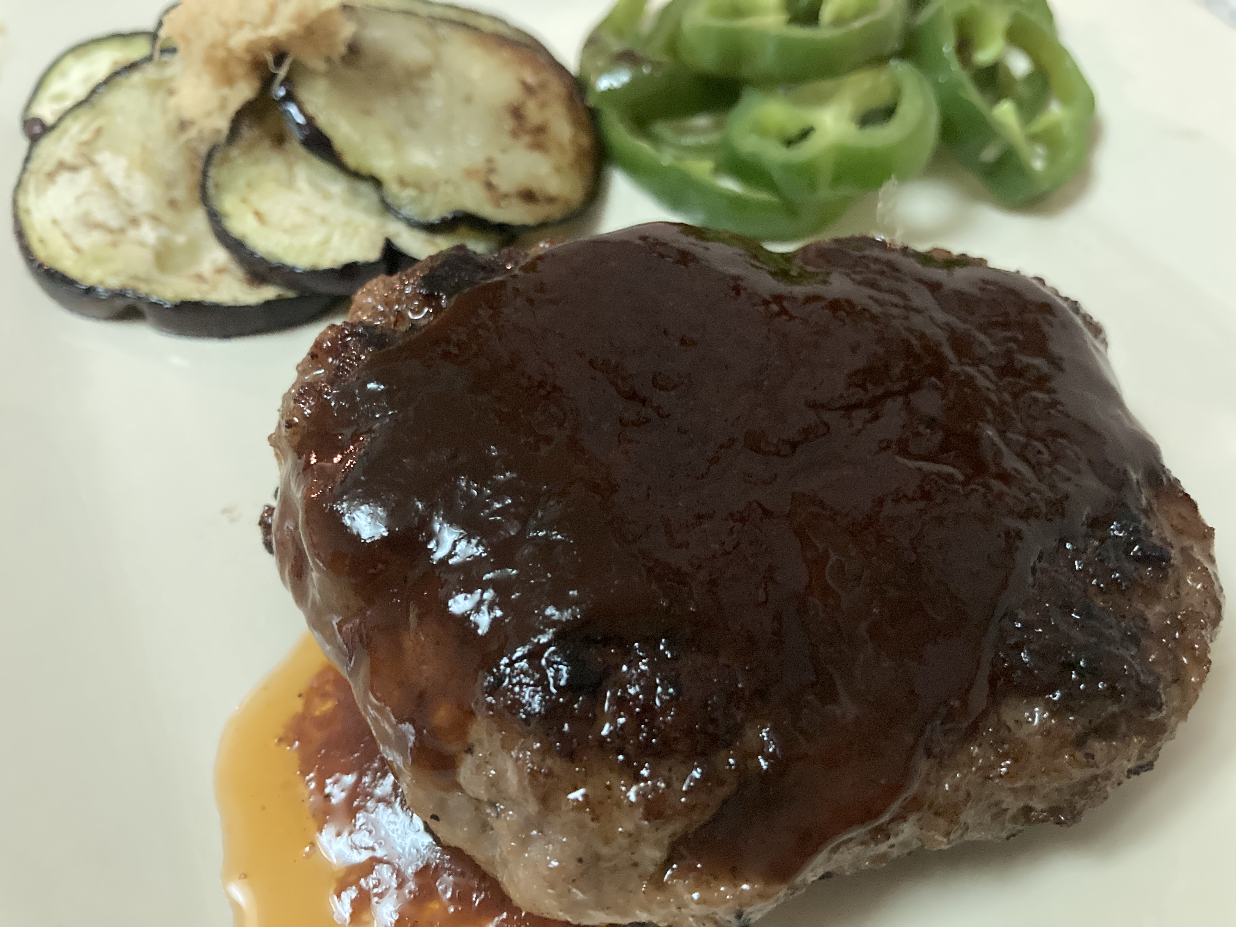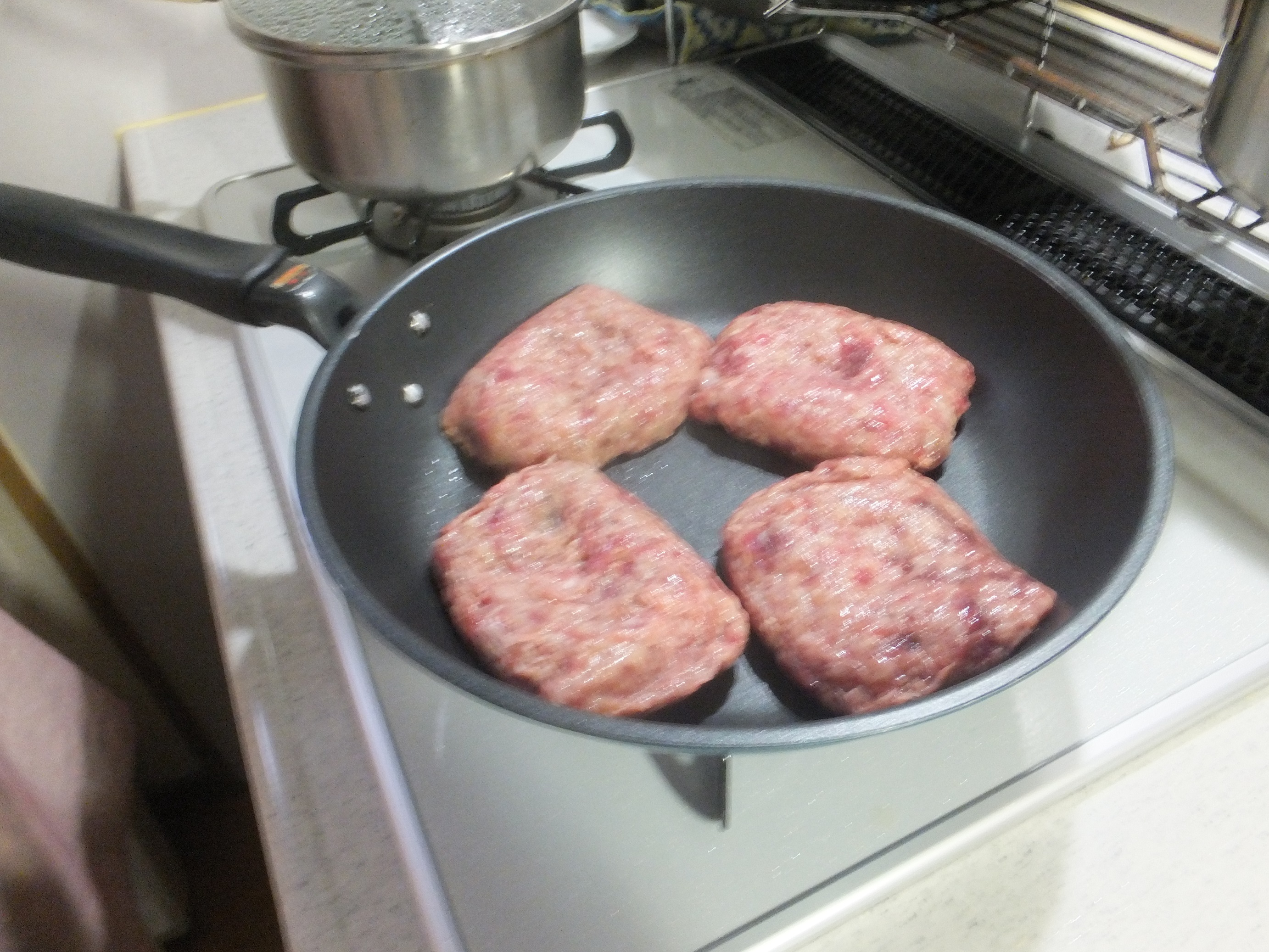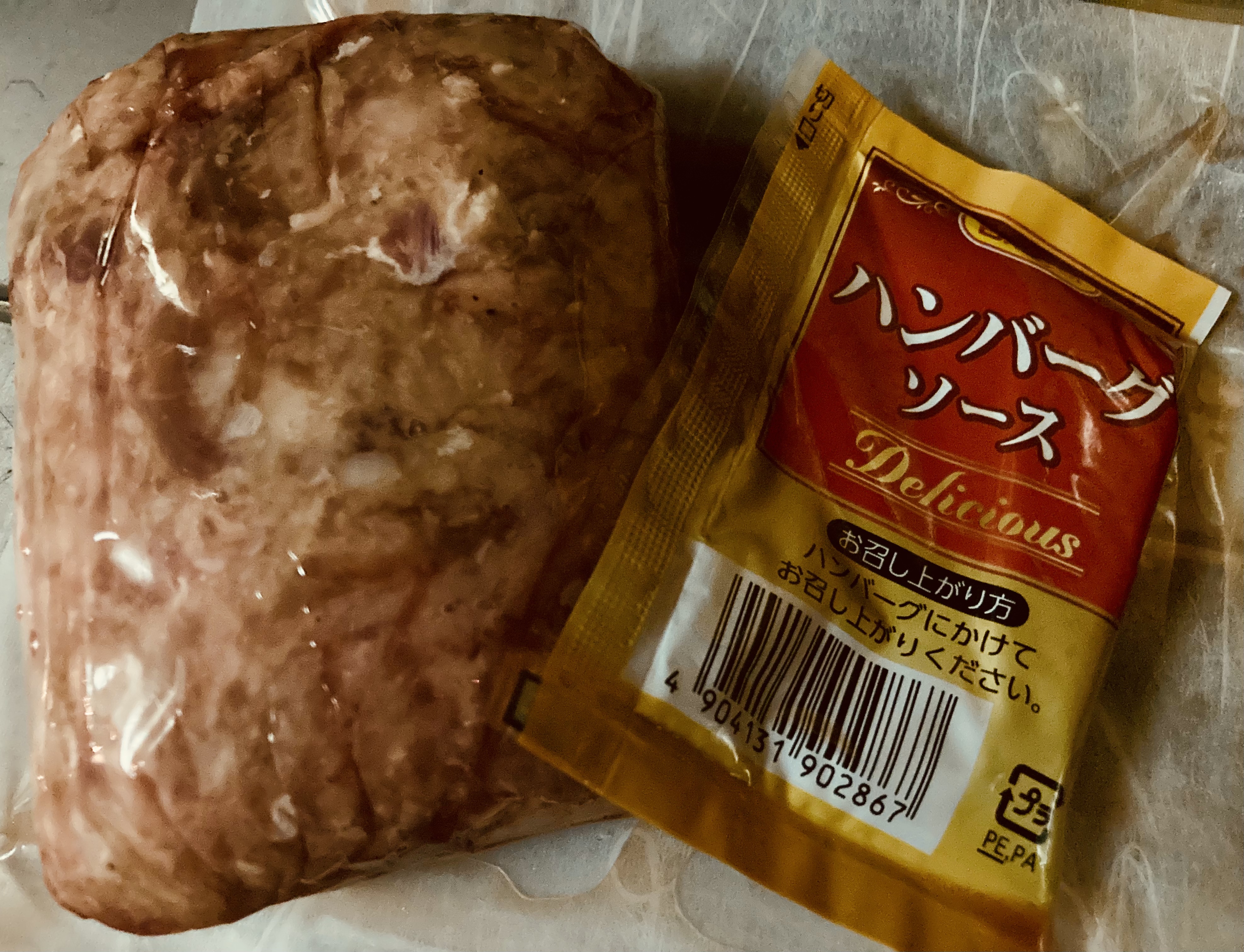 同封の、ハンバーグの美味しい焼き方を参考に、休日の夜、私が焼きました。フライパンで焼いていると、お肉の焼ける良い匂いに、子供たちが釣られてやって来ました。途中、大量の肉汁が出てきてびっくり。最後、肉汁と付属のソースを合わせて加熱し、出来上がり。