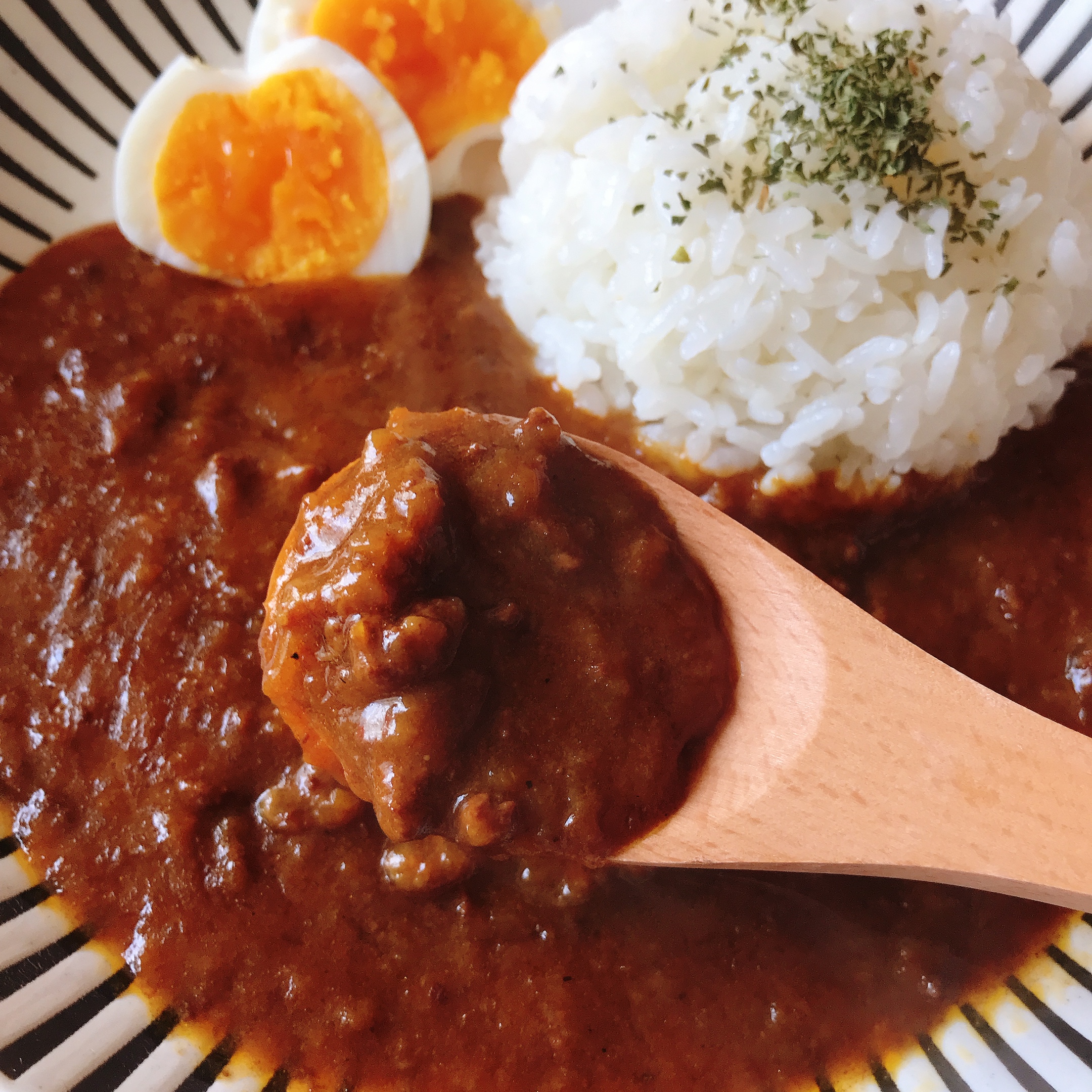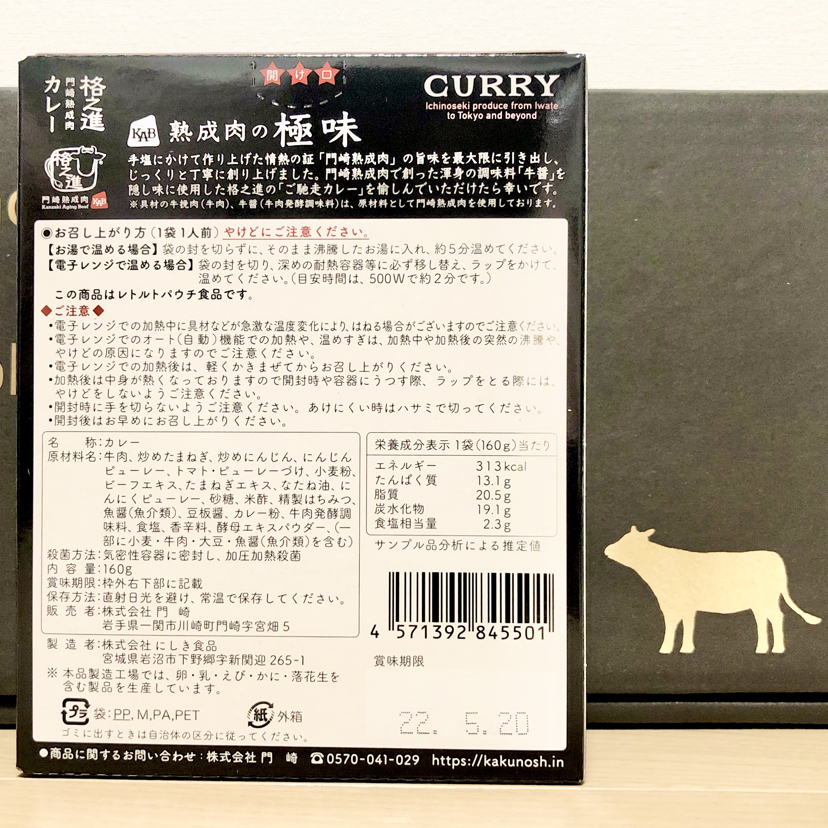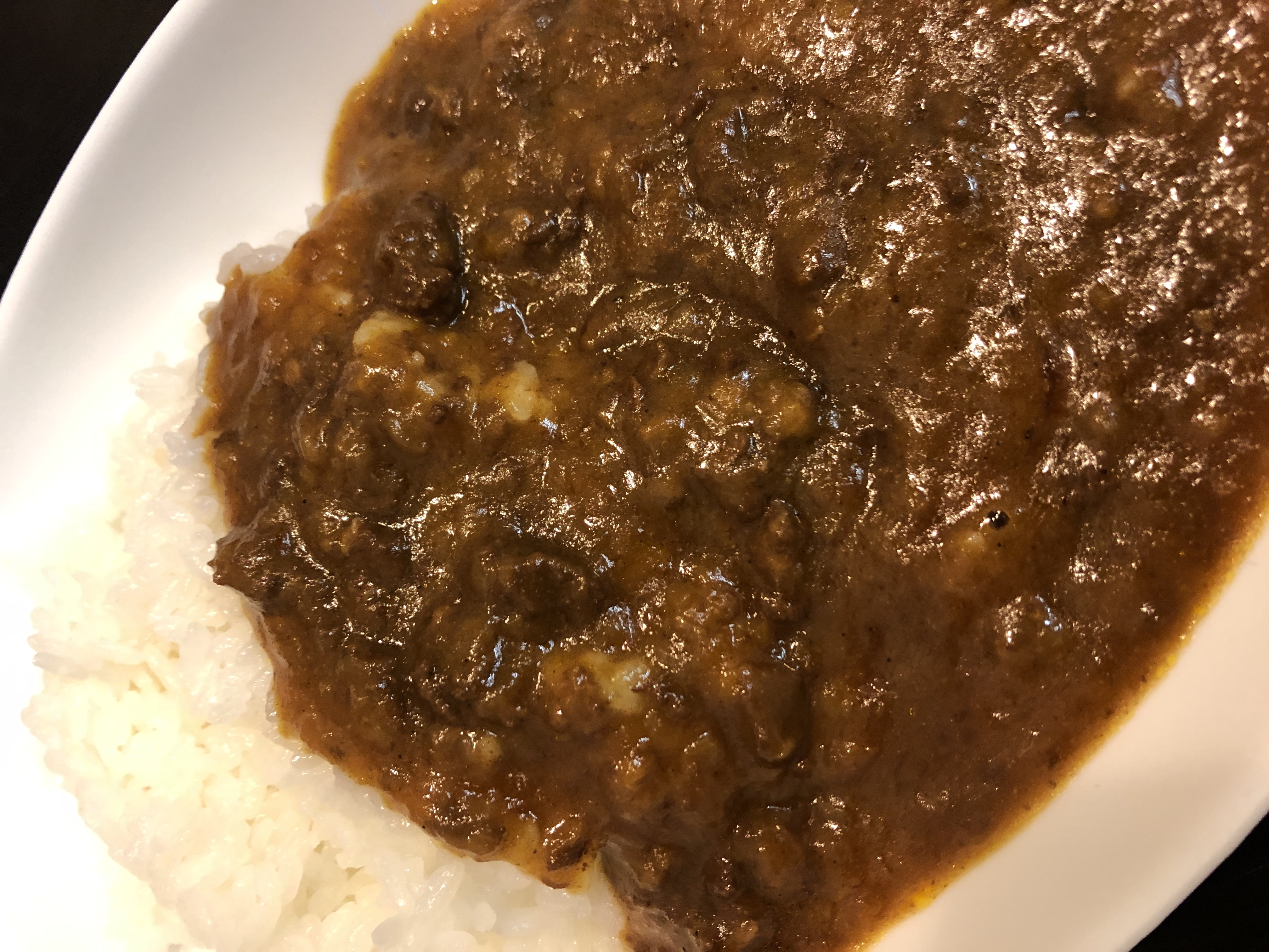 塊肉ではなく、熟成肉の粗挽き肉が使われていますが、「カレー用に厳選した門崎熟成肉(黒毛和牛)」の、煮込んでも型崩れしにない「スネ、ブリスケット、ネックなど、コラーゲンやうま味のもとになるアミノ酸を豊富に含むゼラチン質な部位を指定し」、しかもその量たるや、「内容量の30%も使用した」とのことで、挽肉でありながら肉々しい感じがするのは、これが理由かなと思いました。