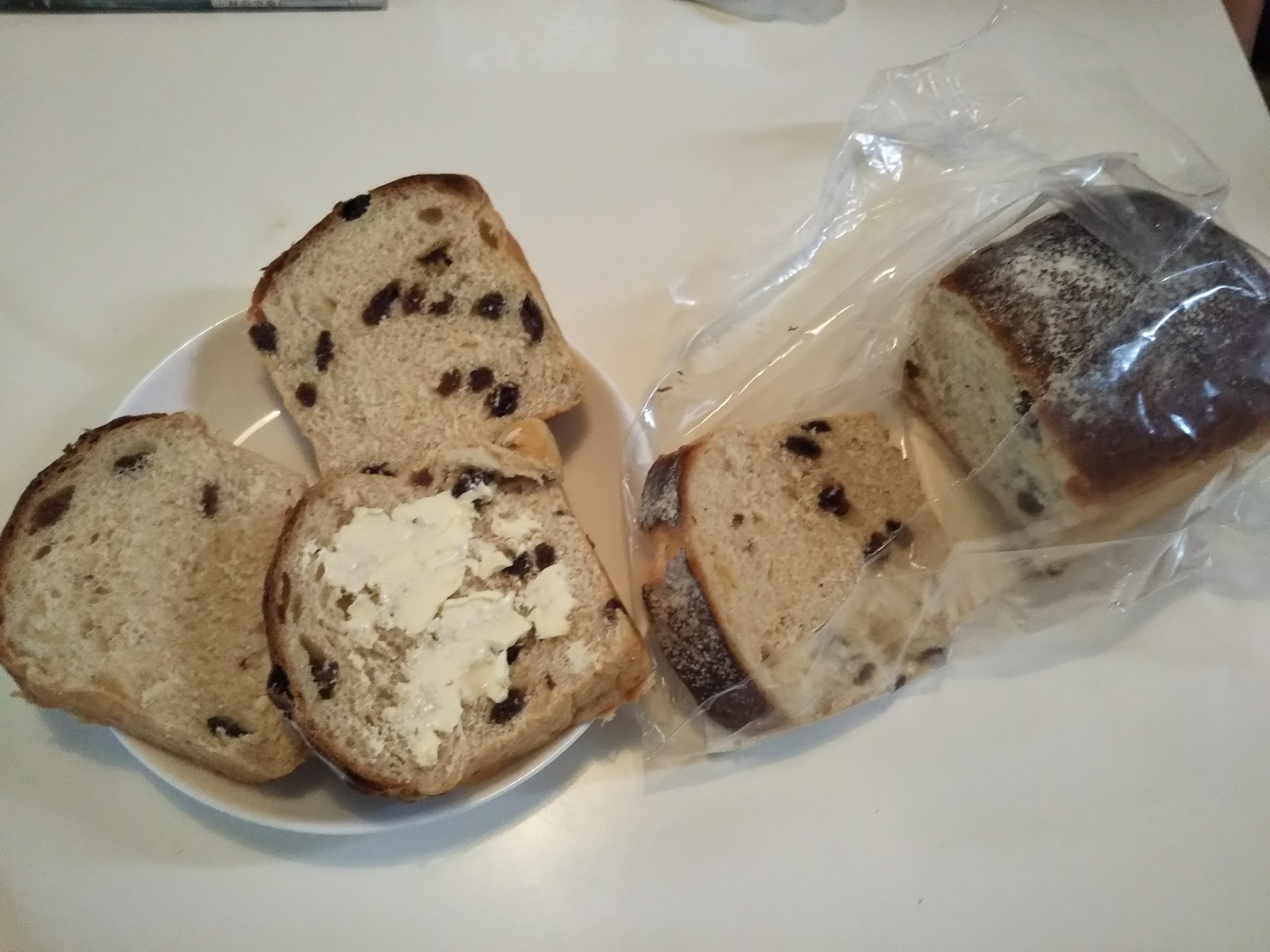 レーズンパンってなんとなく軽いクラムのイメージがあるのですが、この食パンは生地がすごく密。ずっしりと詰まっています。天然酵母食パンな雰囲気。食感の引きは強くなく、どこか焼菓子風でもあり。だけどクラストはしっかりとに焼きこまれていてめちゃめちゃ香ばしいので、パンのおいしさと、お菓子のおいしさを同時に味わえるような、不思議な美味しさでした。そしてやっぱり、生地自体がとても美味しい。噛みしめるとじゅわりと粉の旨味と酵母の深み。リベイクしても、そのままでも、最高でした。