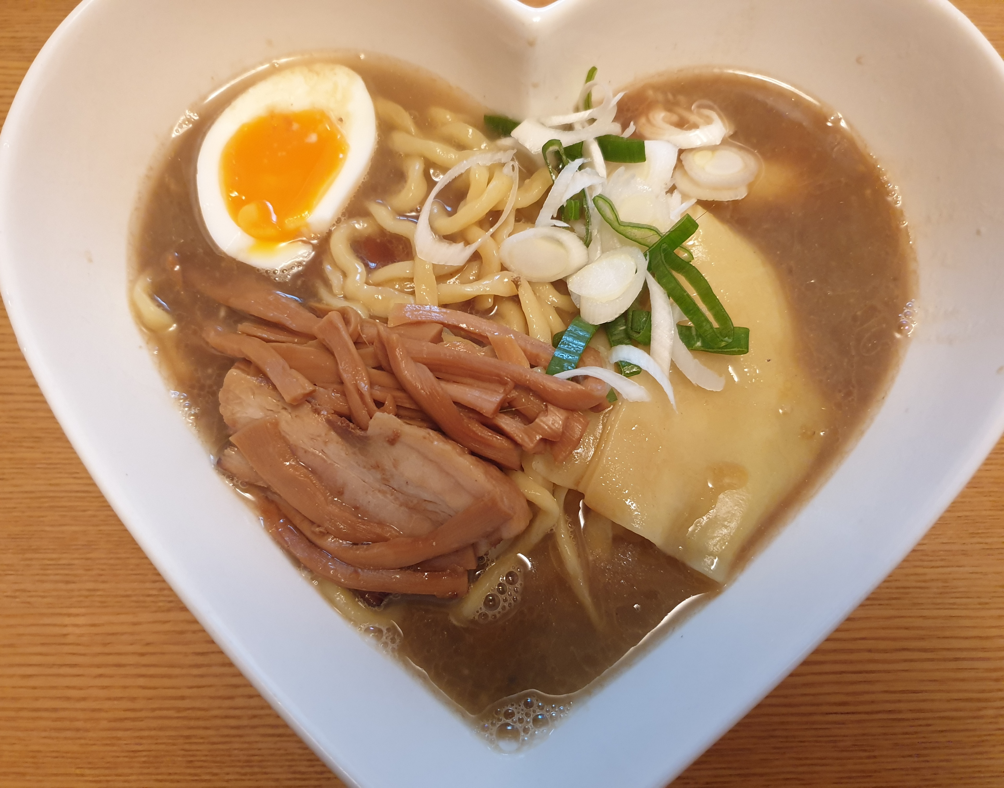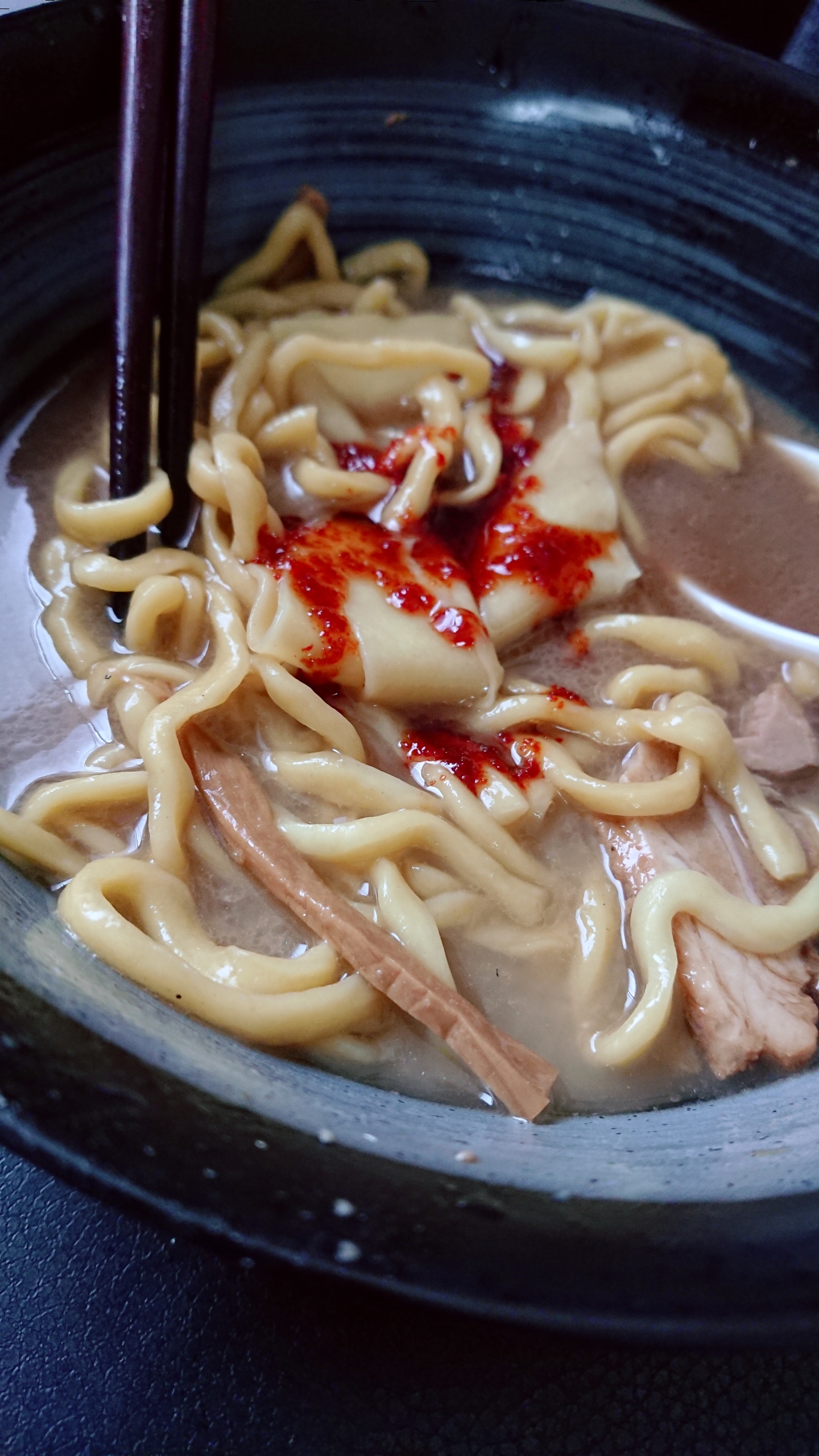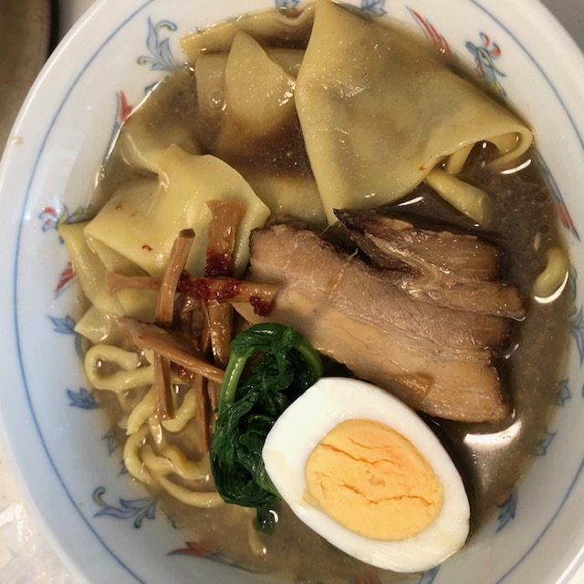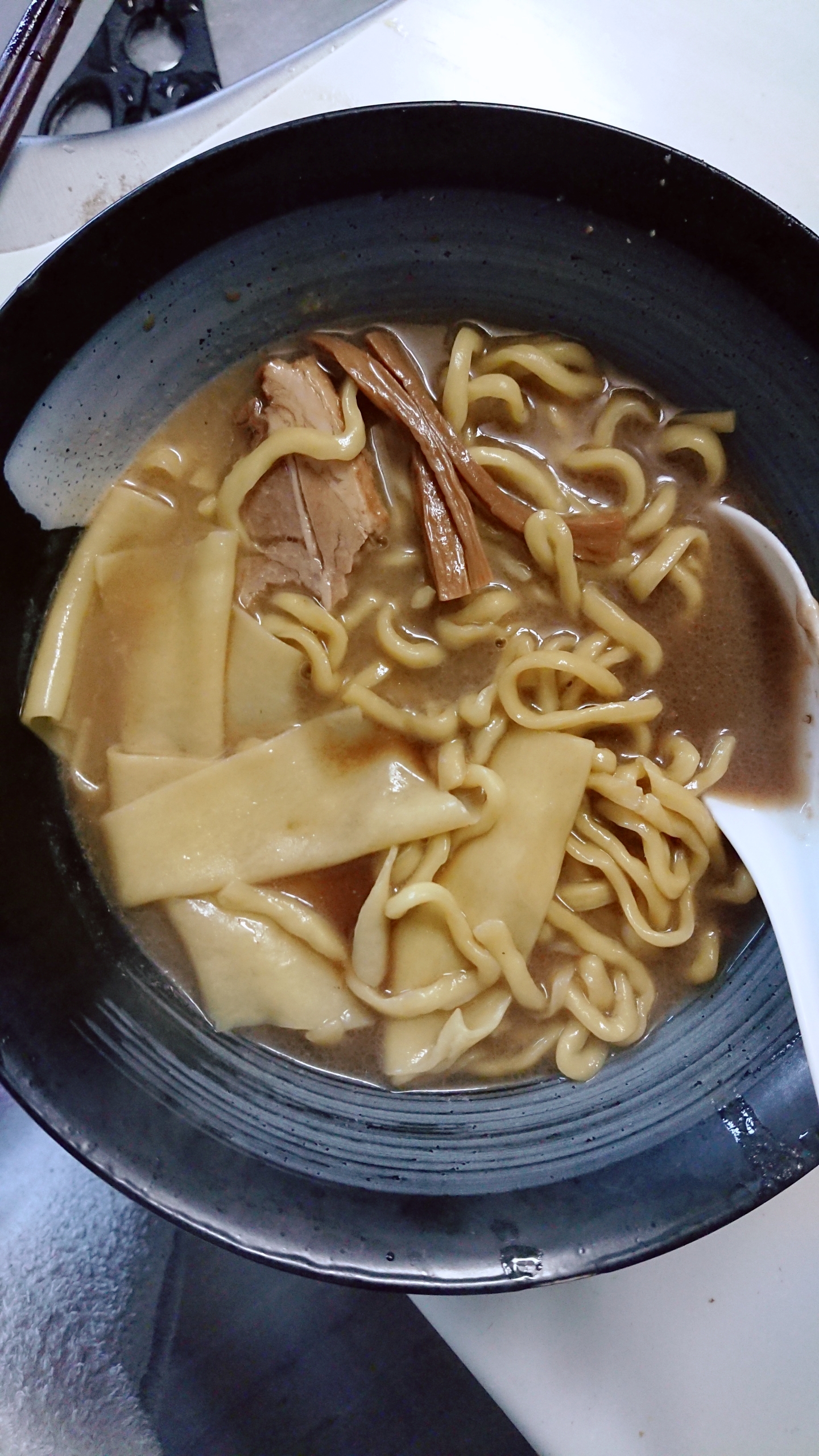 そして目を引くのがちぢれ麺の中に入っていたひもかわうどんのような平たい麺。幅広いチュルッとしたタッチで、アクセントにちょうどいい心地よさ。柔らかく煮込まれたチャーシュー、メンマも相まって、さらなる贅沢感が感じられる。