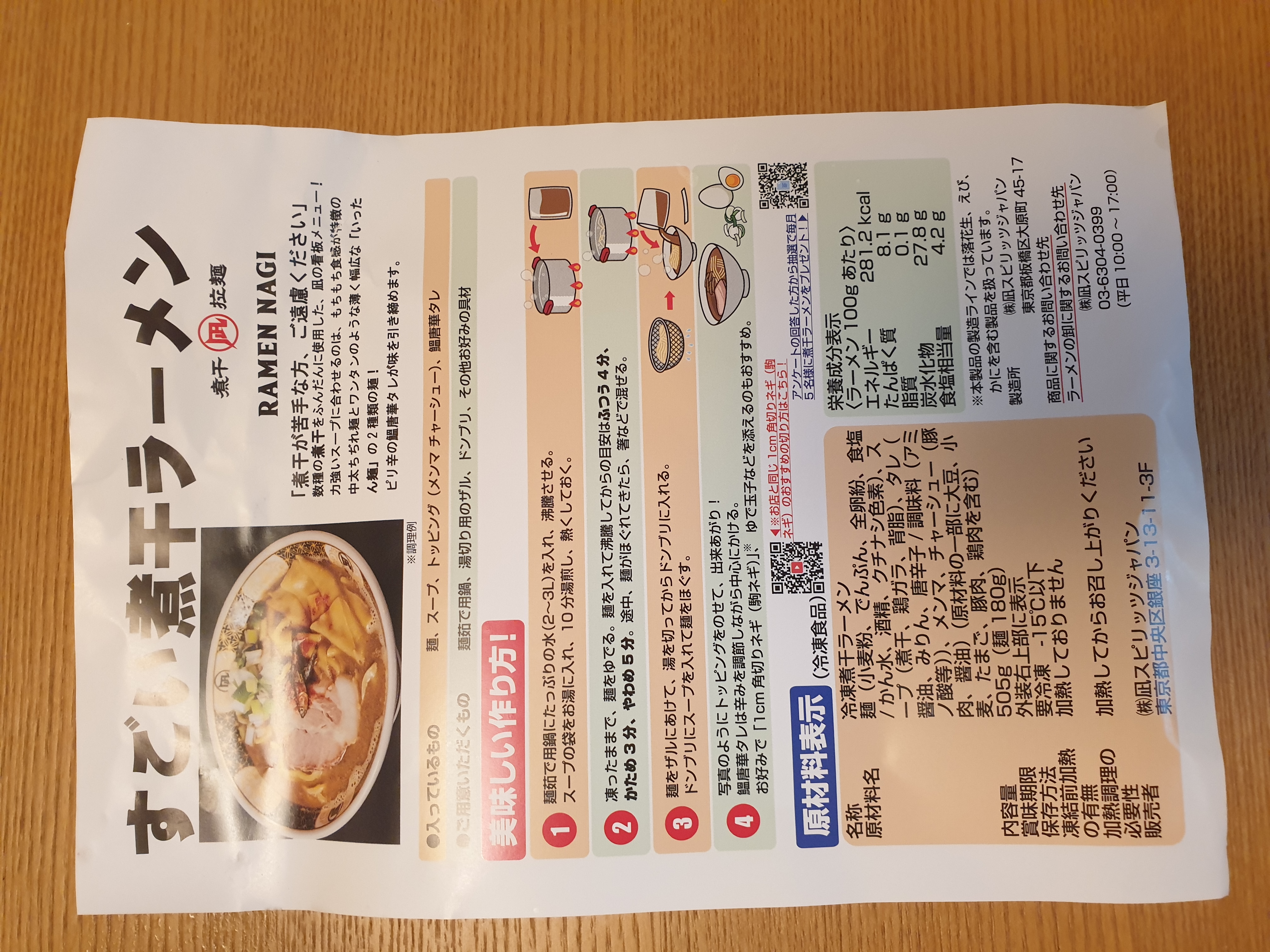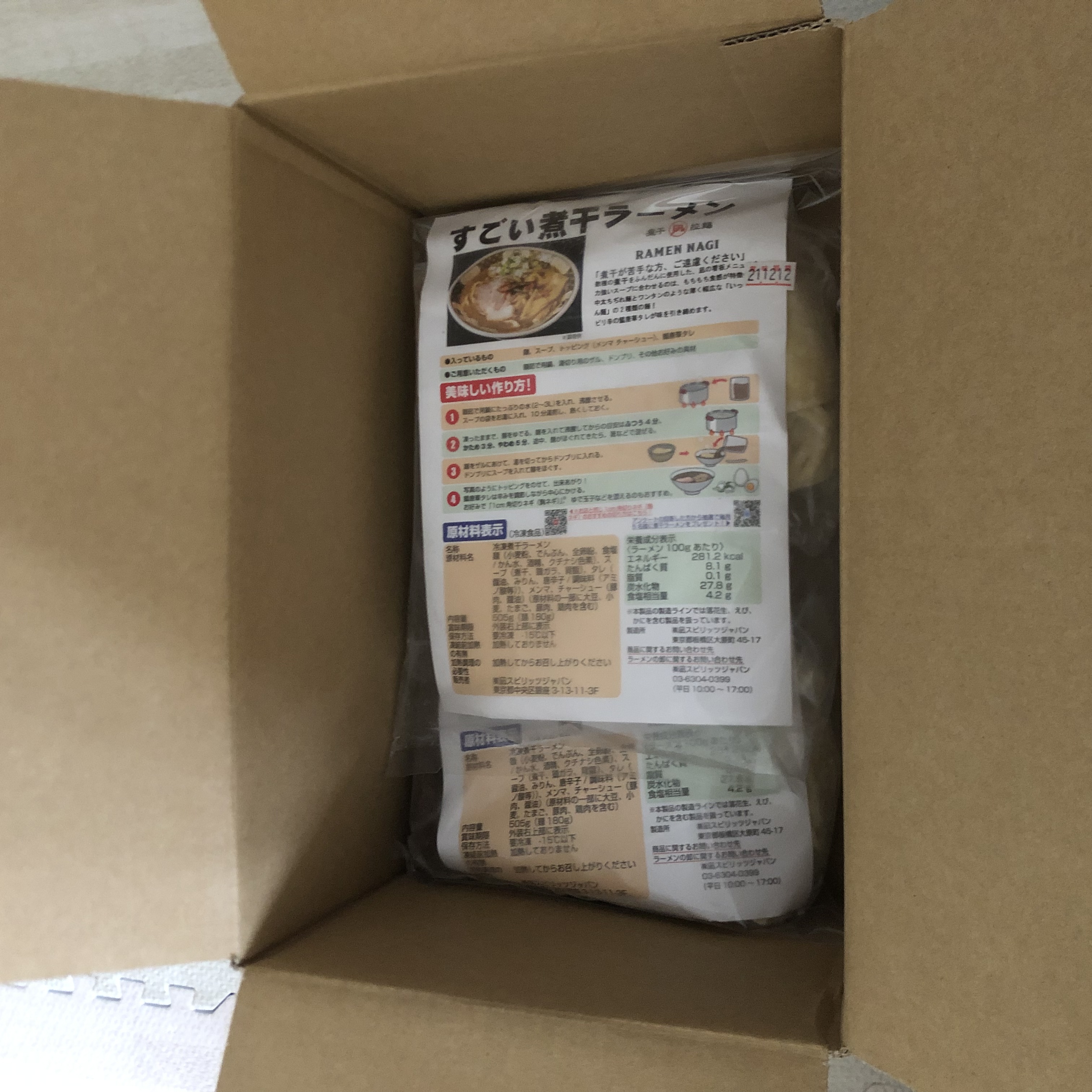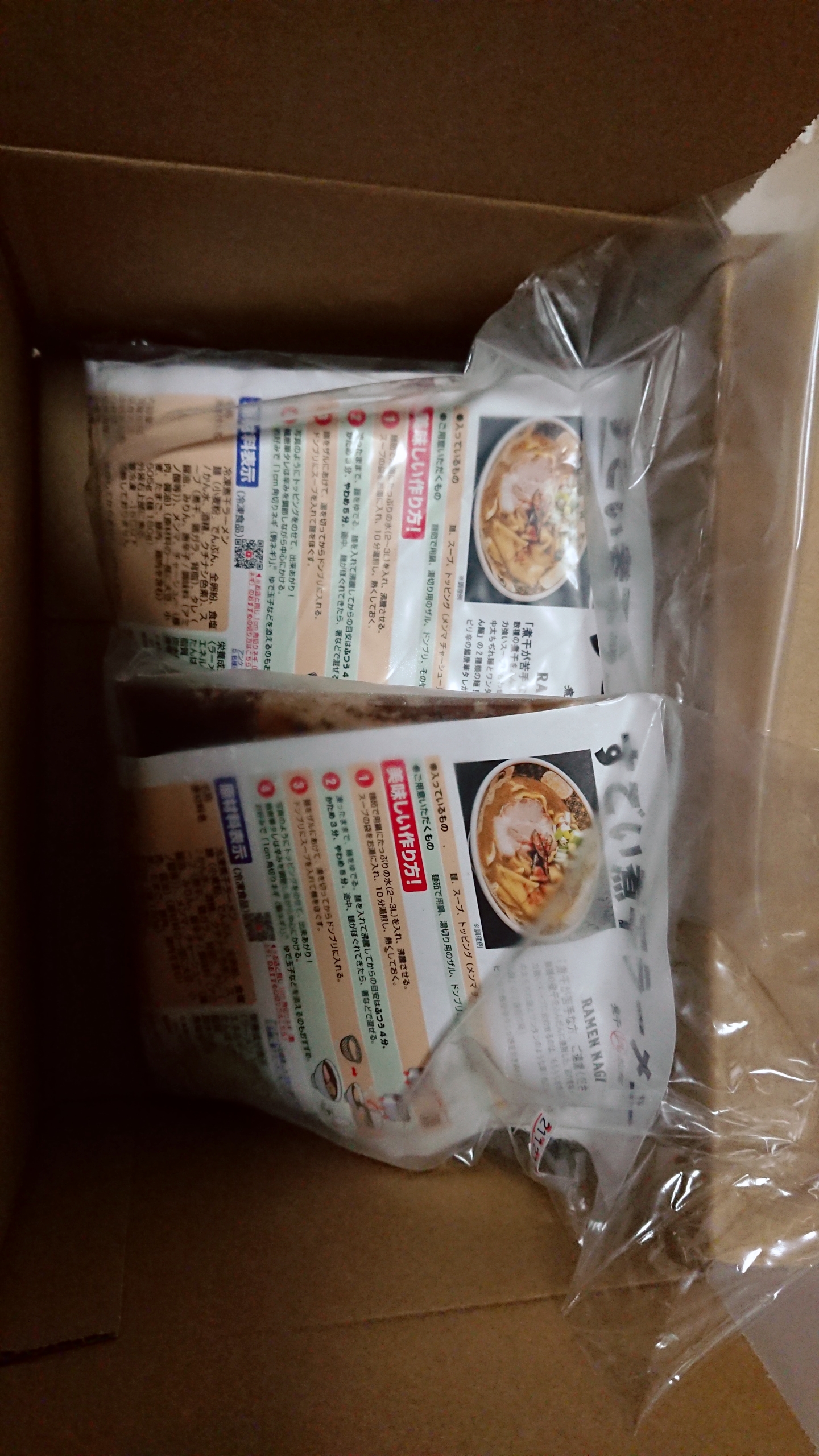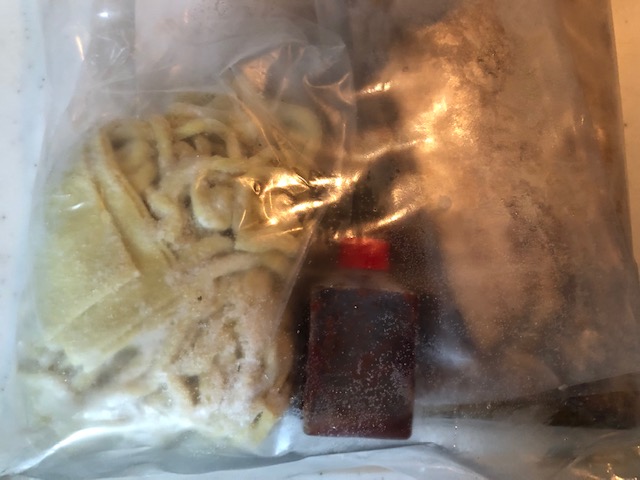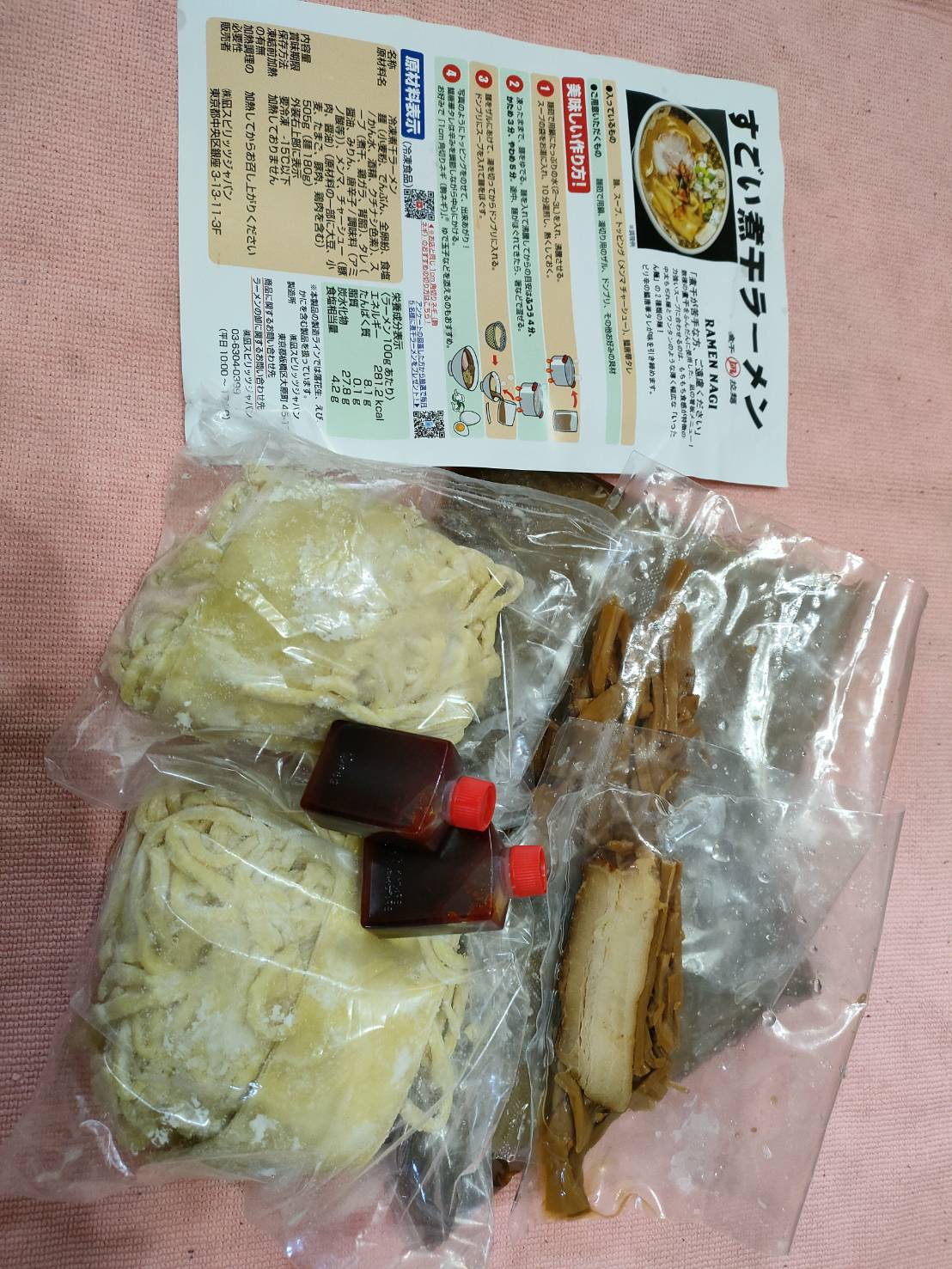 一人前の商品内容は麺(1人前180g)、具入りスープ、鰮唐華タレ。トッピングのメンマとチャーシューは別包装。作り方は凄く簡単。スープをお湯で解凍して麺を茹でるだけ。