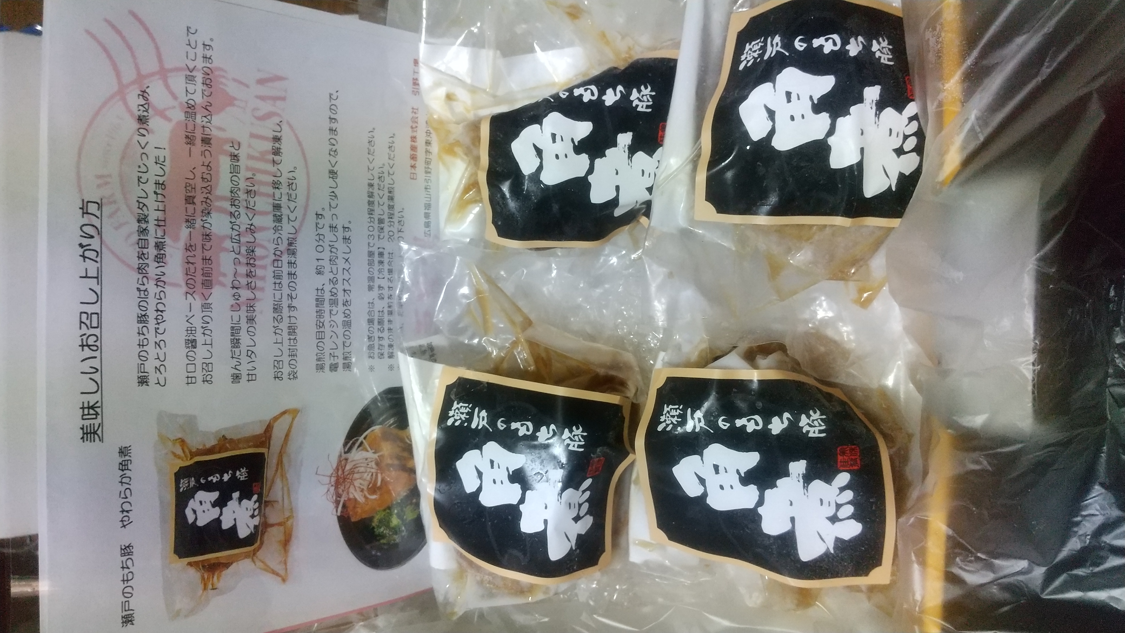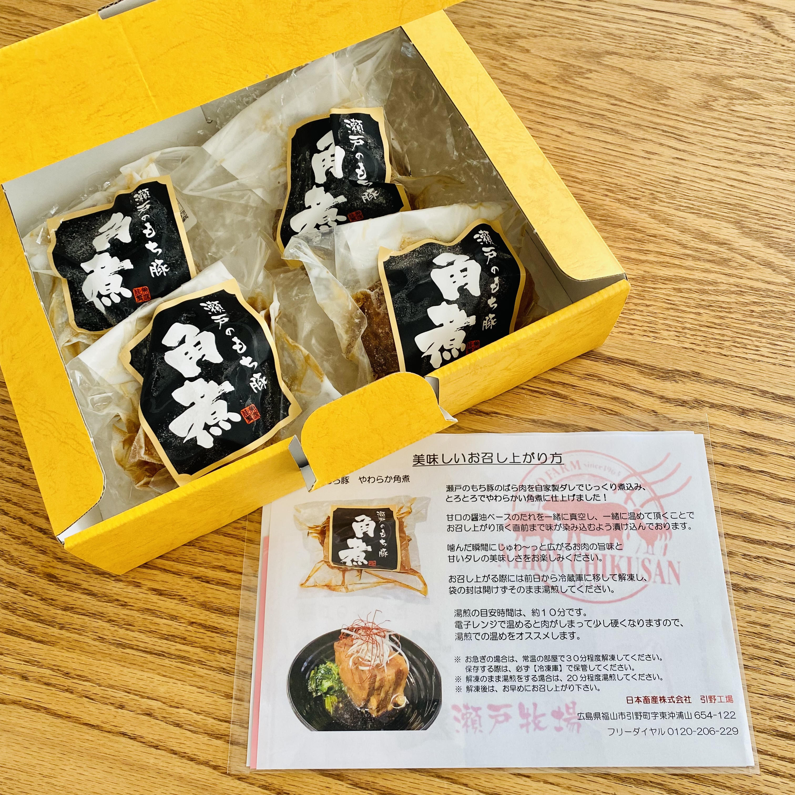 ブランド豚「瀬戸のもち豚の角煮」です。甘くとろける脂身と、旨味の凝縮された赤身が特徴的な「瀬戸のもち豚」の豚バラ肉を自家製ダレでじっくり時間をかけて煮込み、とろっとやわらかな角煮に仕上がっています。甘口の醤油ベースのたれを一緒に真空し、一緒に温めることで、食べる直前まで味が染み込むようしっかり漬け込んでいます。瀬戸内の穏やかな気候と養豚専門の自社牧場で育てた「瀬戸のもち豚」を原料に、自社工場で製造した安心安全な角煮セットです。