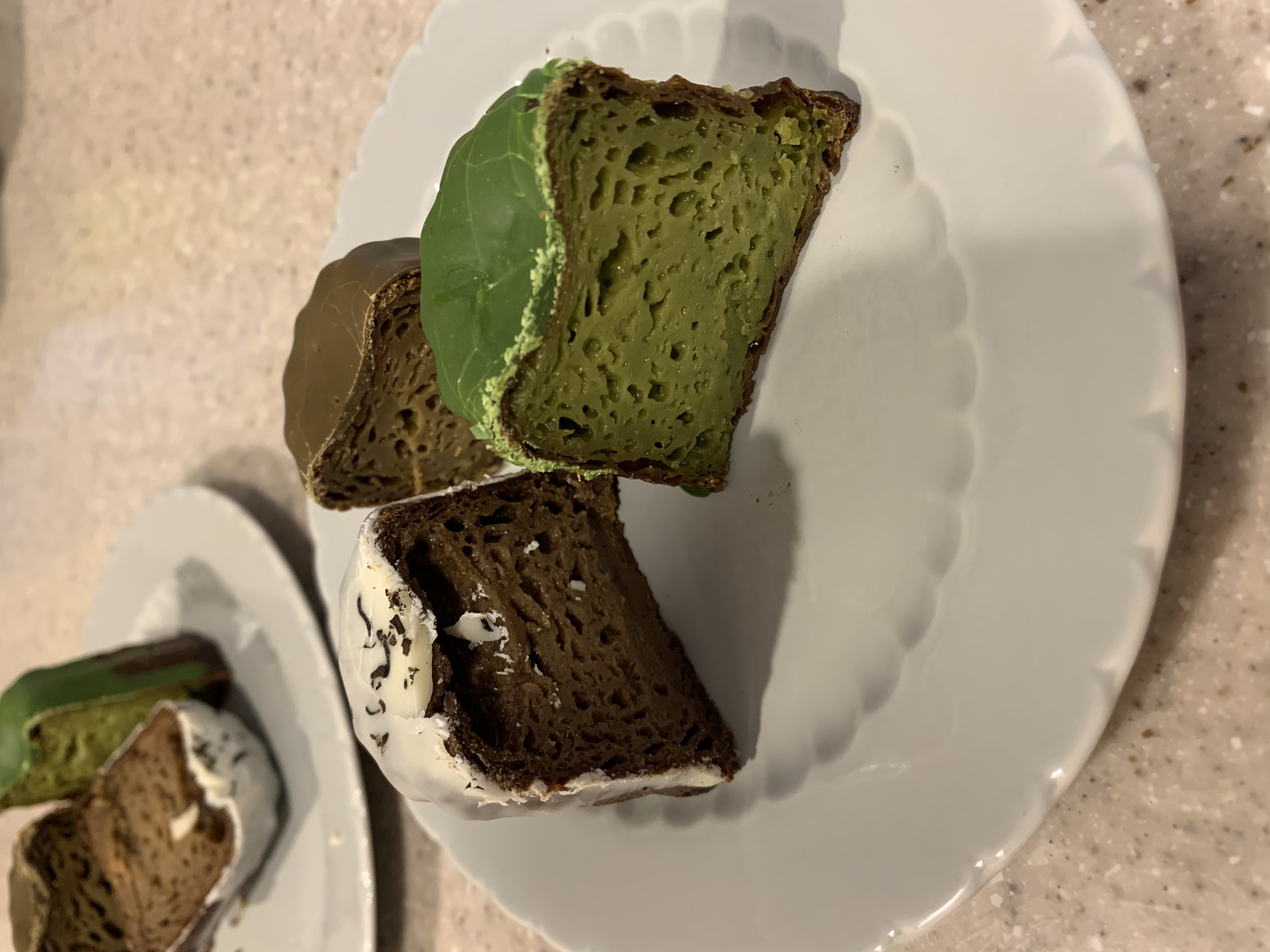 静岡県産ほうじ茶を使った「ほうじ茶カヌレ」。割ってみると、中も濃いめのほうじ茶色。抹茶ほどの濃さはありませんが、チョコっぽいほうじ茶の香りがほんのりとします。食べてみると、一瞬チョコな感じがするのですが、その中にほうじ茶の苦みや香ばしさがふわっと広がります。