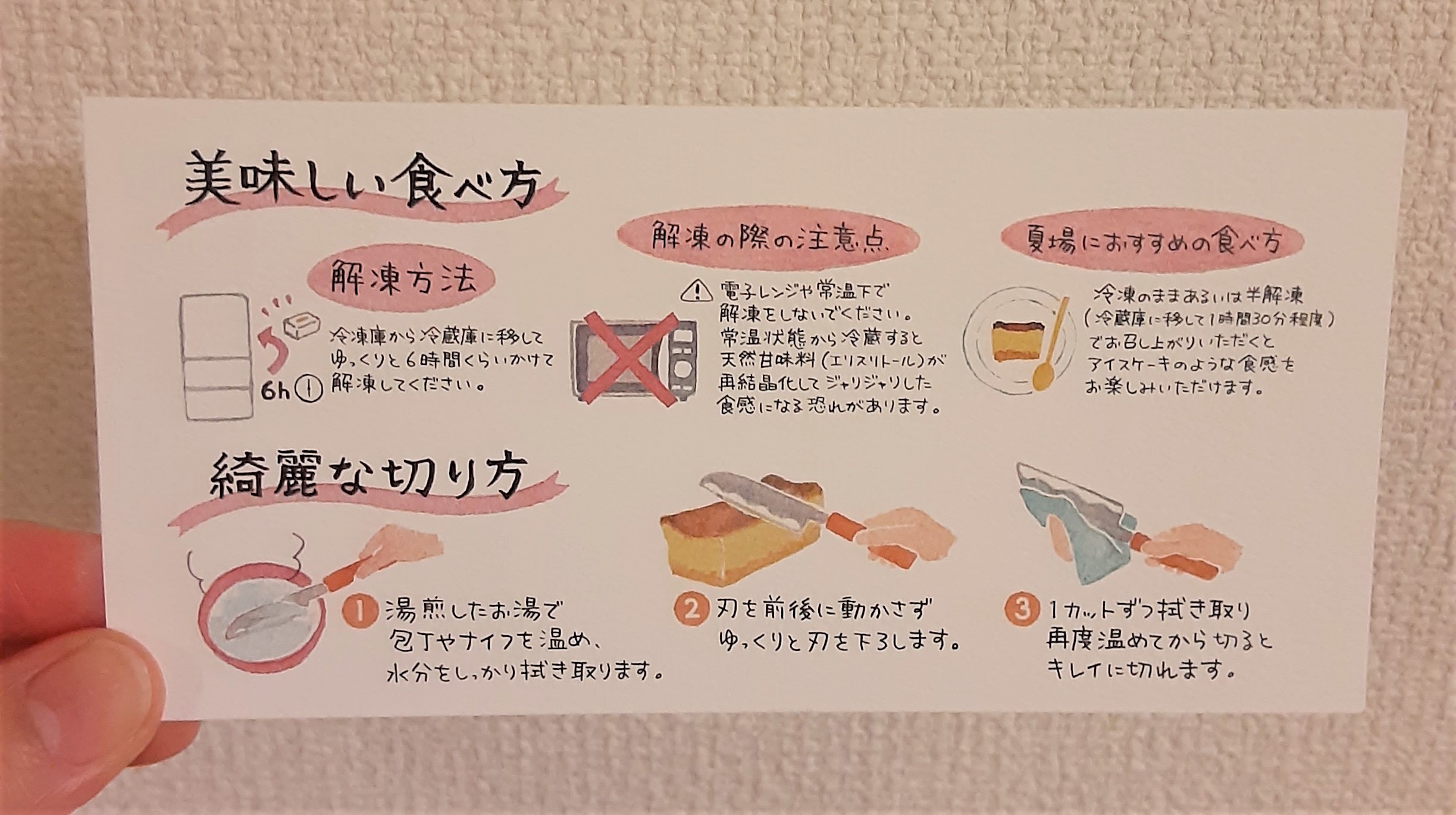 段ボール箱を開けると、緩衝材で丁寧に保護された、白地にロゴ入りのおしゃれな化粧箱の登場です。チーズケーキは一見小さめのホールですが、持ち上げると見た目以上にずっしりと重量感があり、表面のしっかりとした焦げ目にもバスクチーズケーキの醍醐味を感じます。同梱された保存方法とおいしい食べ方の説明書もイラスト付きでとても可愛らしいです。