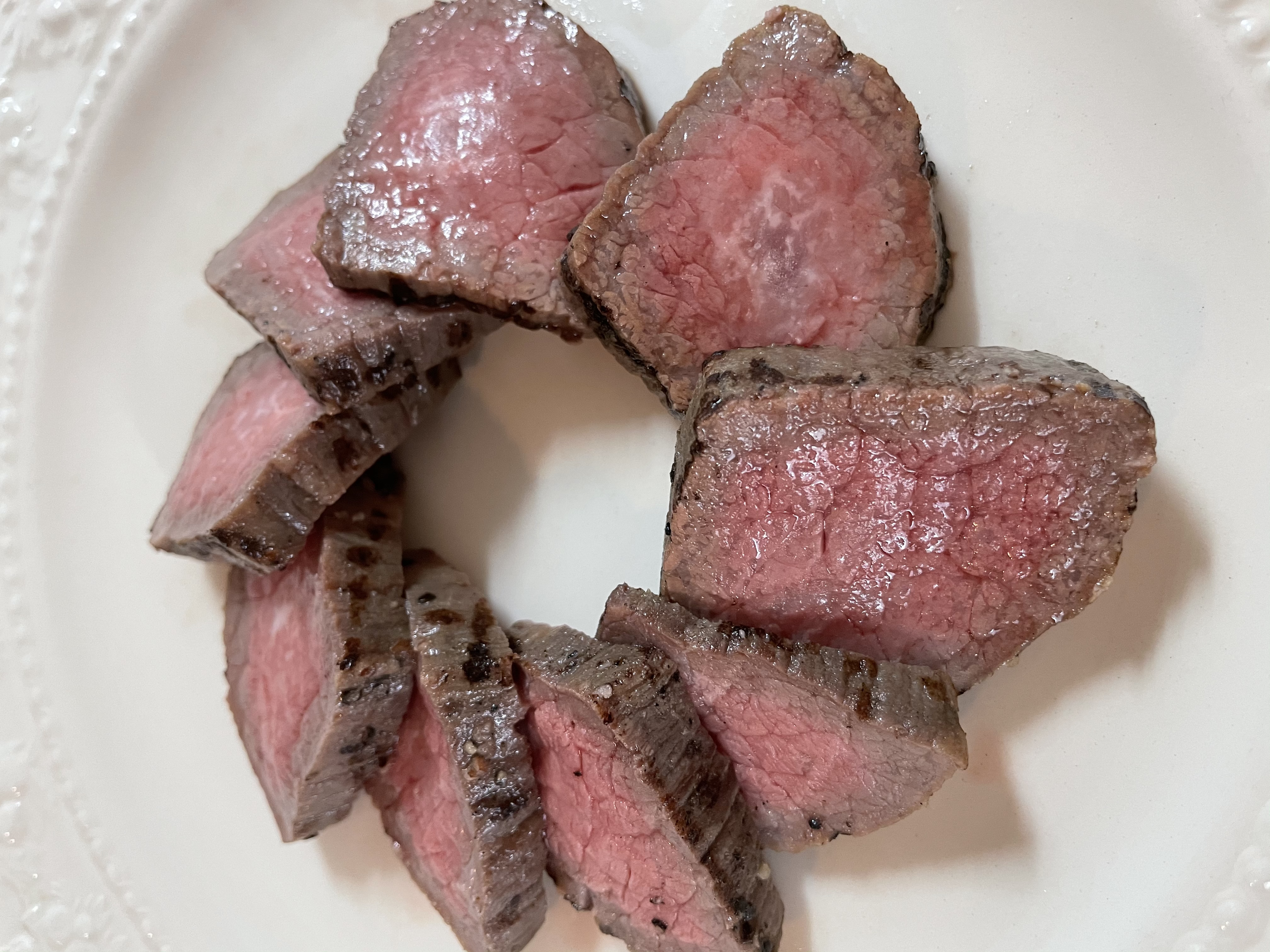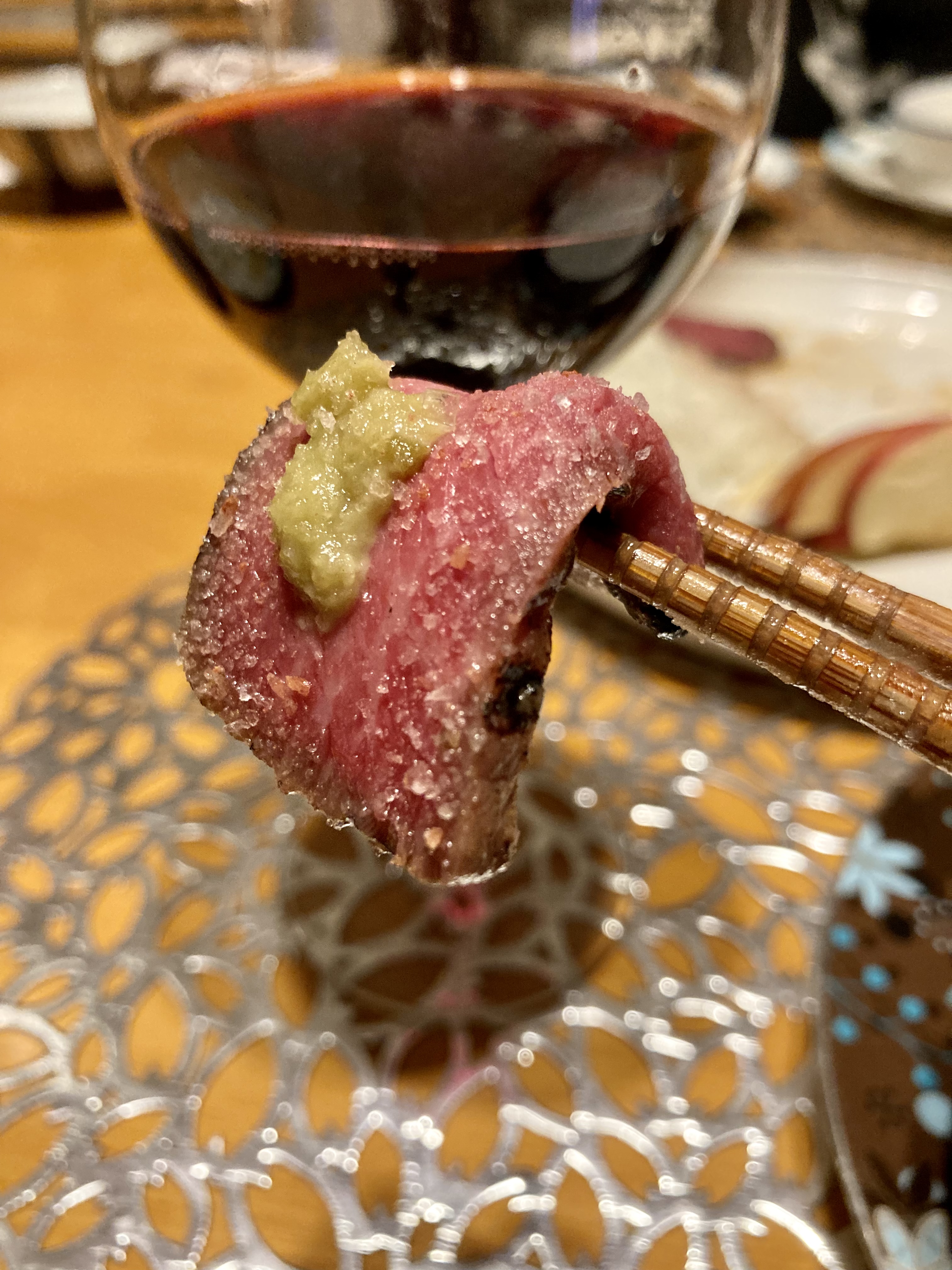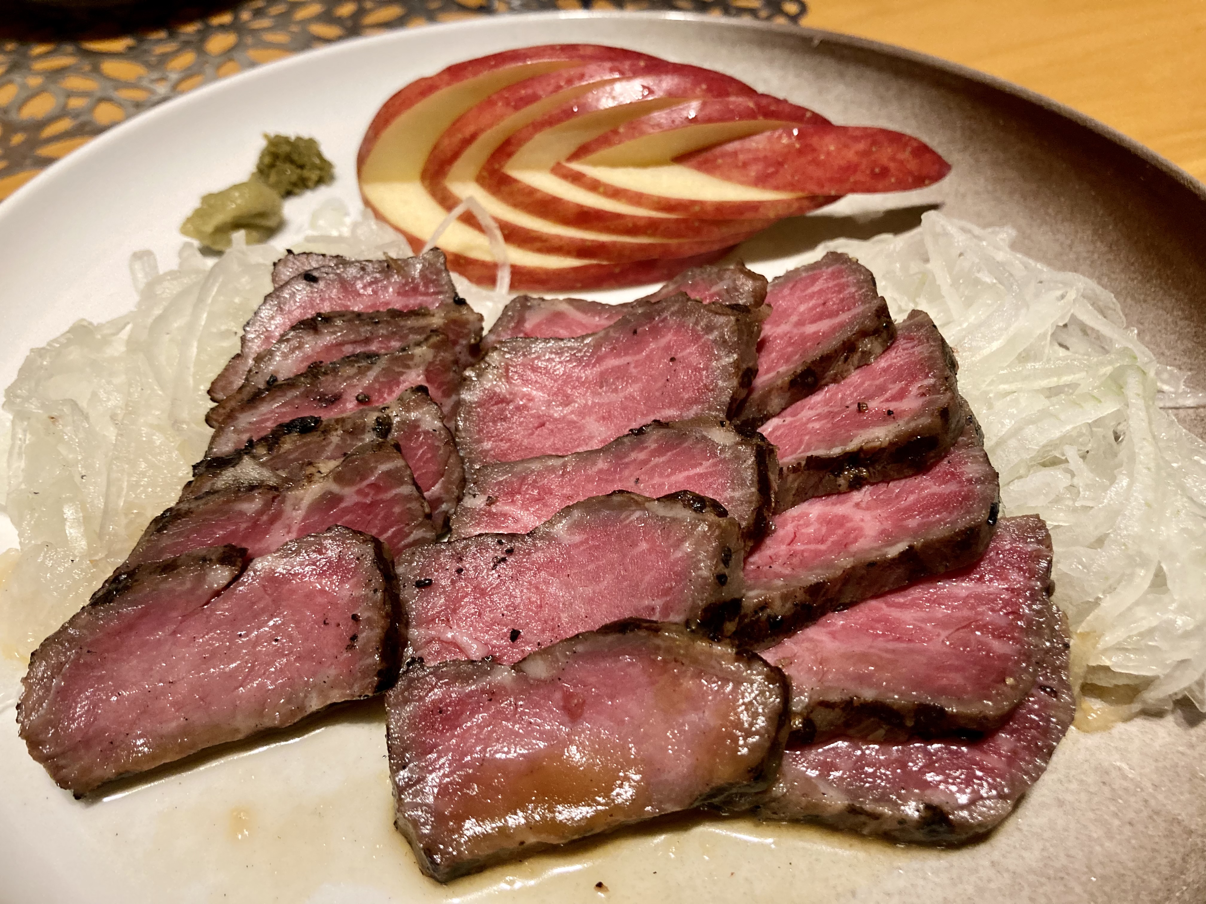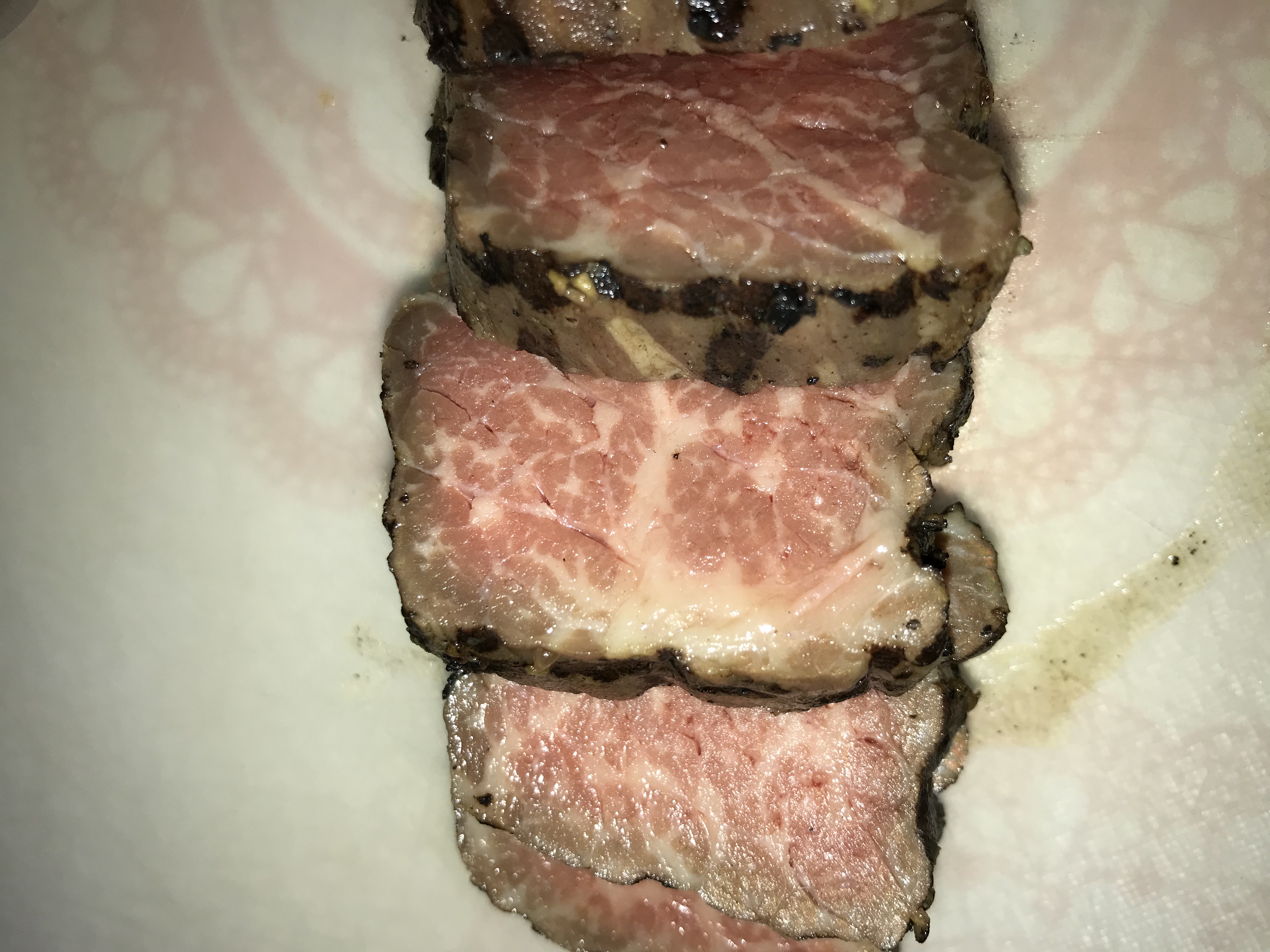包丁を入れると、お肉の綺麗な赤色が出てきました。あまりに美味しそうな断面にこの時点でよだれが..(笑)