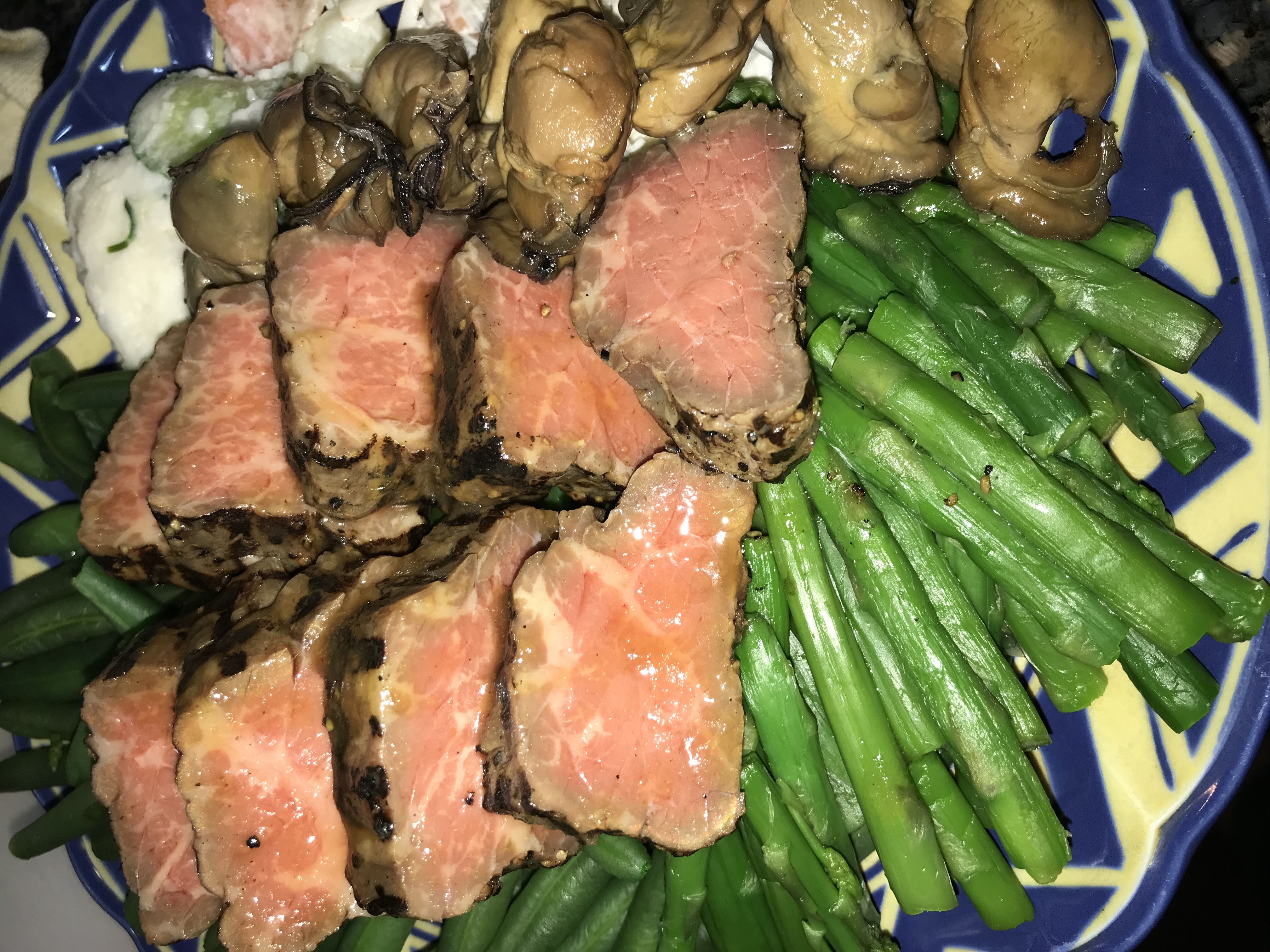 つまみ食いしたくなる気持ちをグッと堪えて、ケールと紫カブで作ったサラダにローストビーフを添えて盛り付けました。