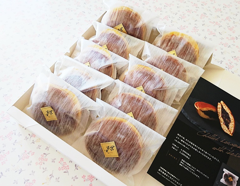 塩が引き立てる小豆に甘味栗が入った「どらやき」です。どらやき用に仕上げた特注塩に合う素材を厳選。卵はヨード卵、小麦は国内産、小豆は北海道産を使用。生地をしっとりさせるための調整、小豆の風味や甘みが最も引き立つ塩の量を計算して仕上げています。塩味の効いた粒あんは、ホクホクとした栗がアクセント。常温だけでなく、冷蔵庫で冷やすと生地のしっとり感が一層感じられます。贈答用のボックスに入って届くので、贈り物にもおすすめです。