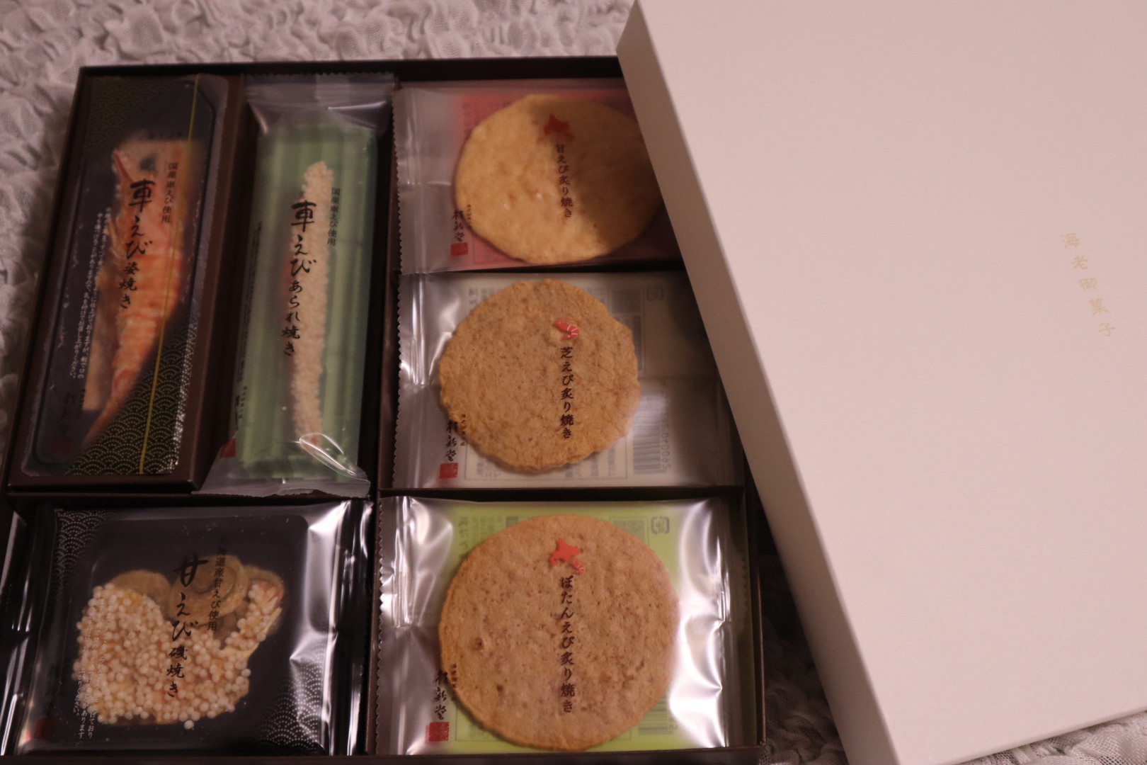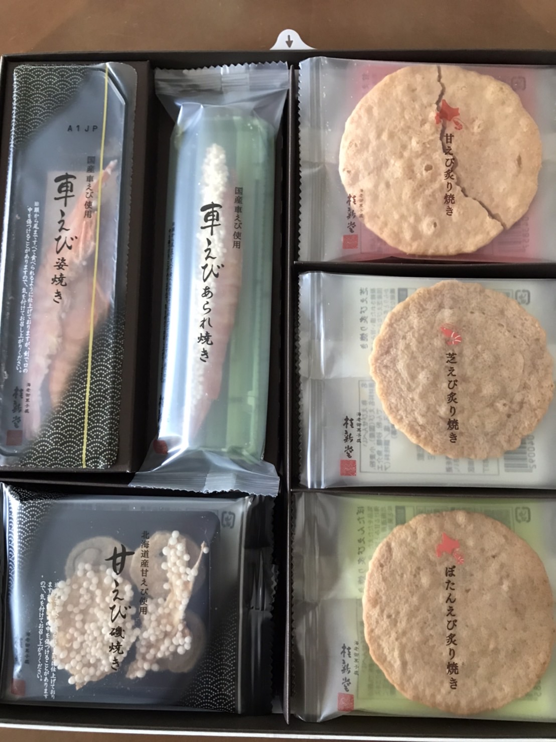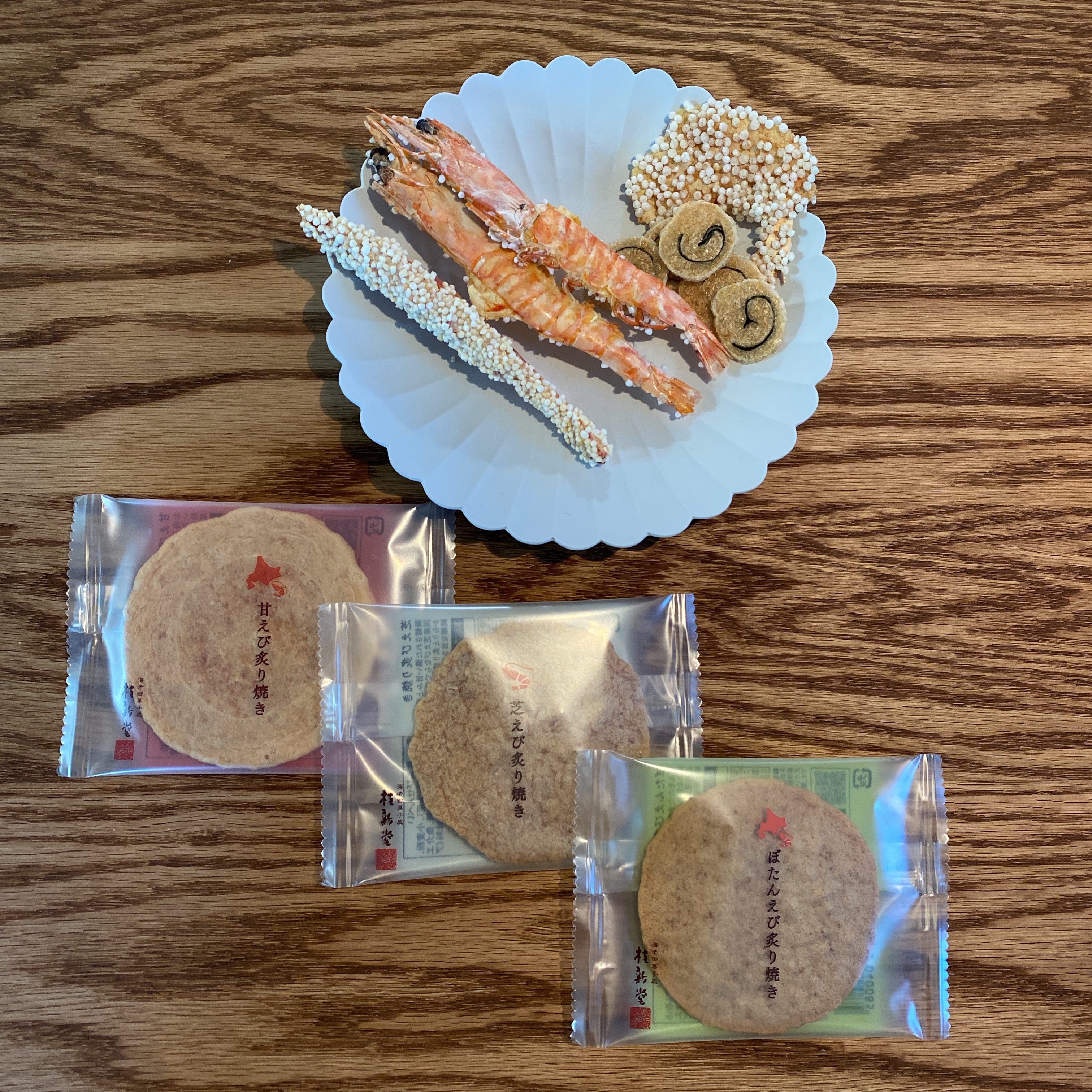 まず、車えびの姿焼きをいただきまして、形もしっかり大きくて美しくて、個包装を開けた瞬間に海老の香りが漂ってきて、裏面にあられが控えめについてるのがまた美味しくて、2枚入りですがペロリといただけました。