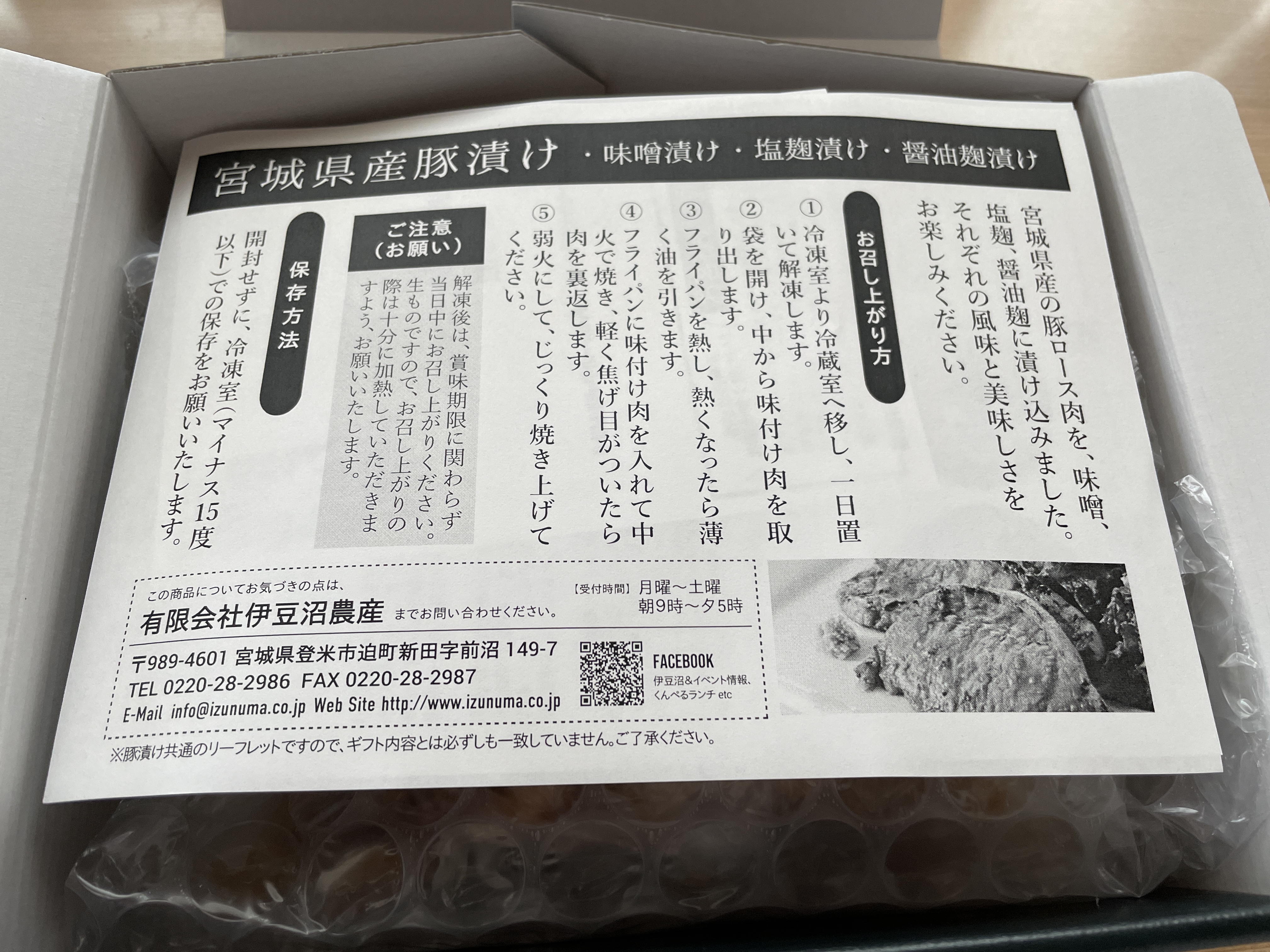 化粧箱を開けると、赤身と脂身のバランスが美しいロース肉が5枚。個包装になっているので、冷凍庫で保存しやすいです。「お召し上がり方」の丁寧な説明書も添えられているので、誰でも簡単に美味しいお肉を焼くことができます。