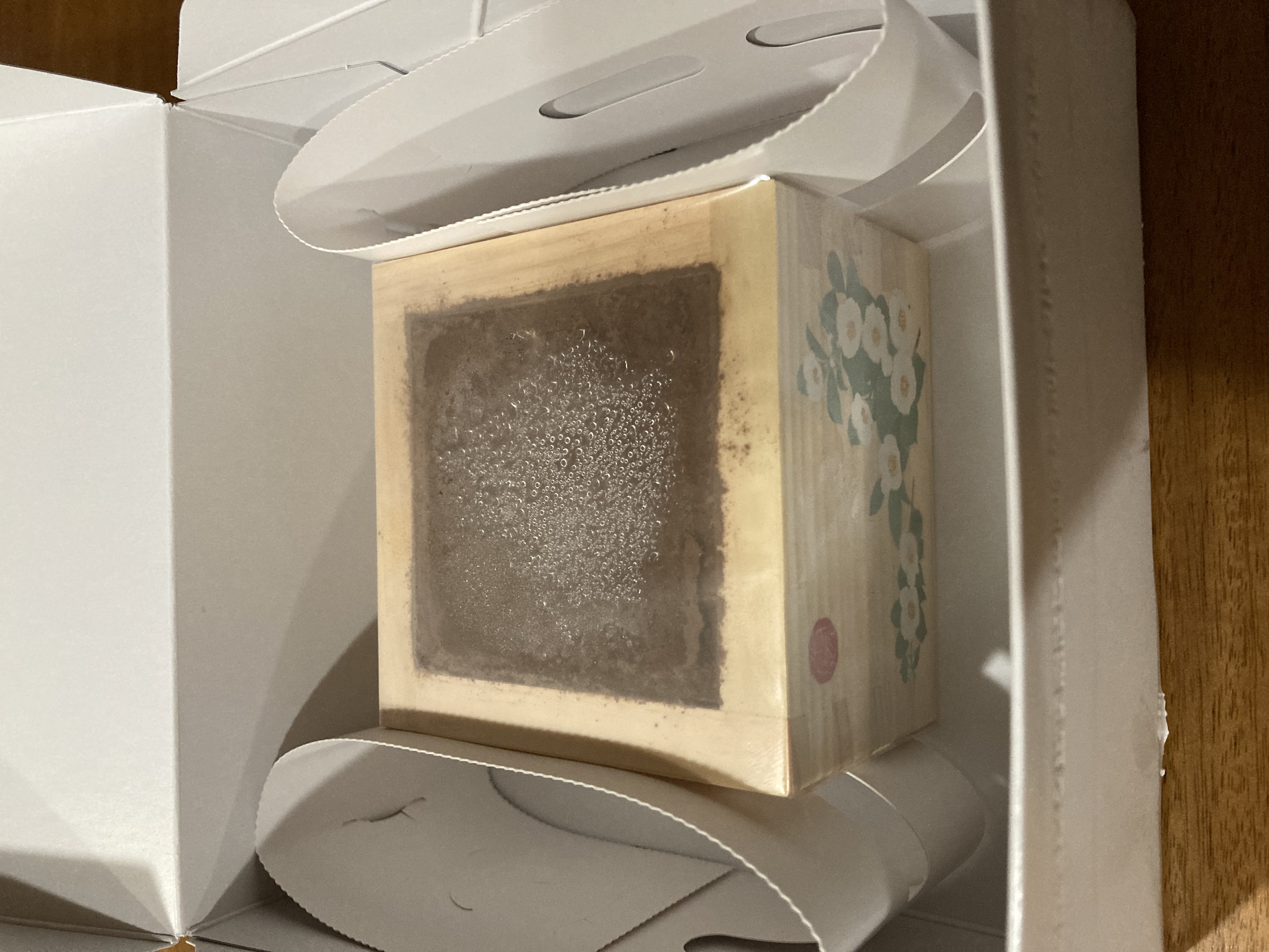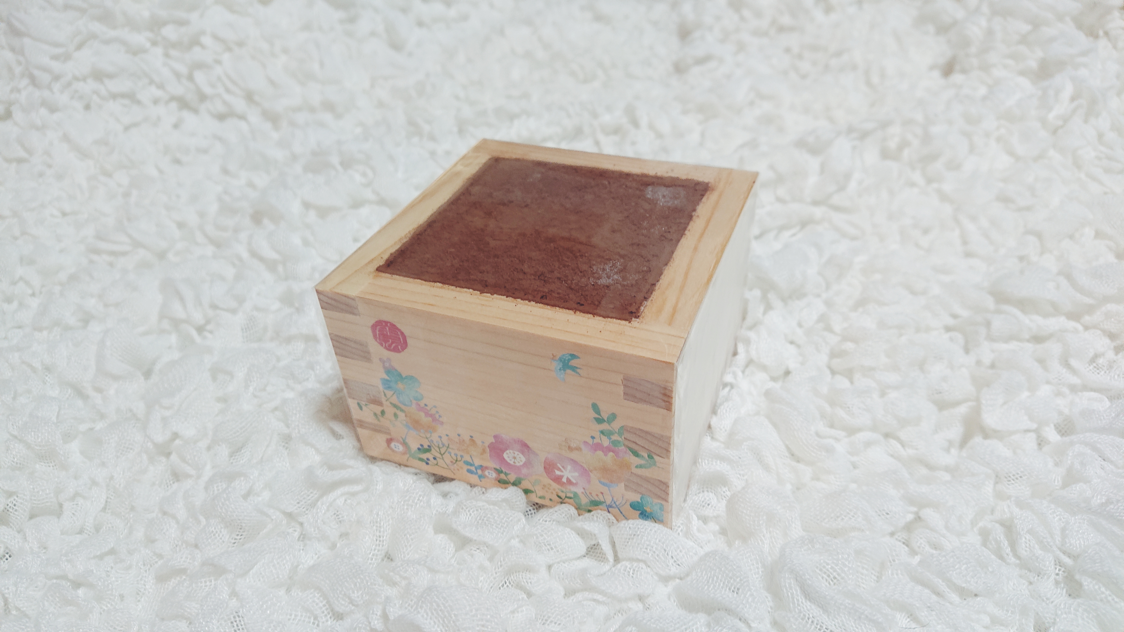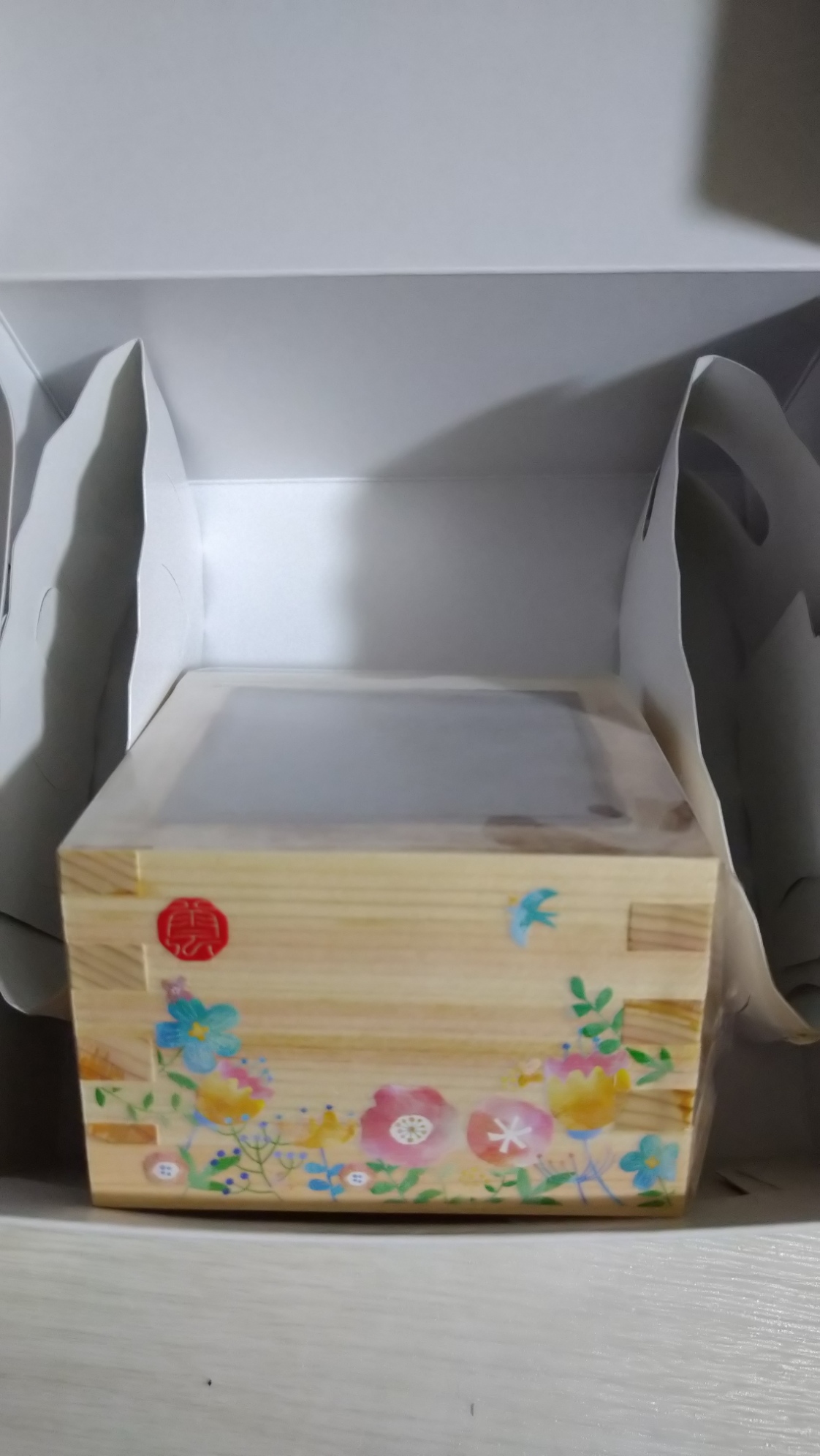 高級感のある枡には可愛らしいお花や鳥の柄(「うらら柄」です)。万人ウケしそうな絵柄で、誰に贈っても喜ばれそう。何より自分も嬉しいです。