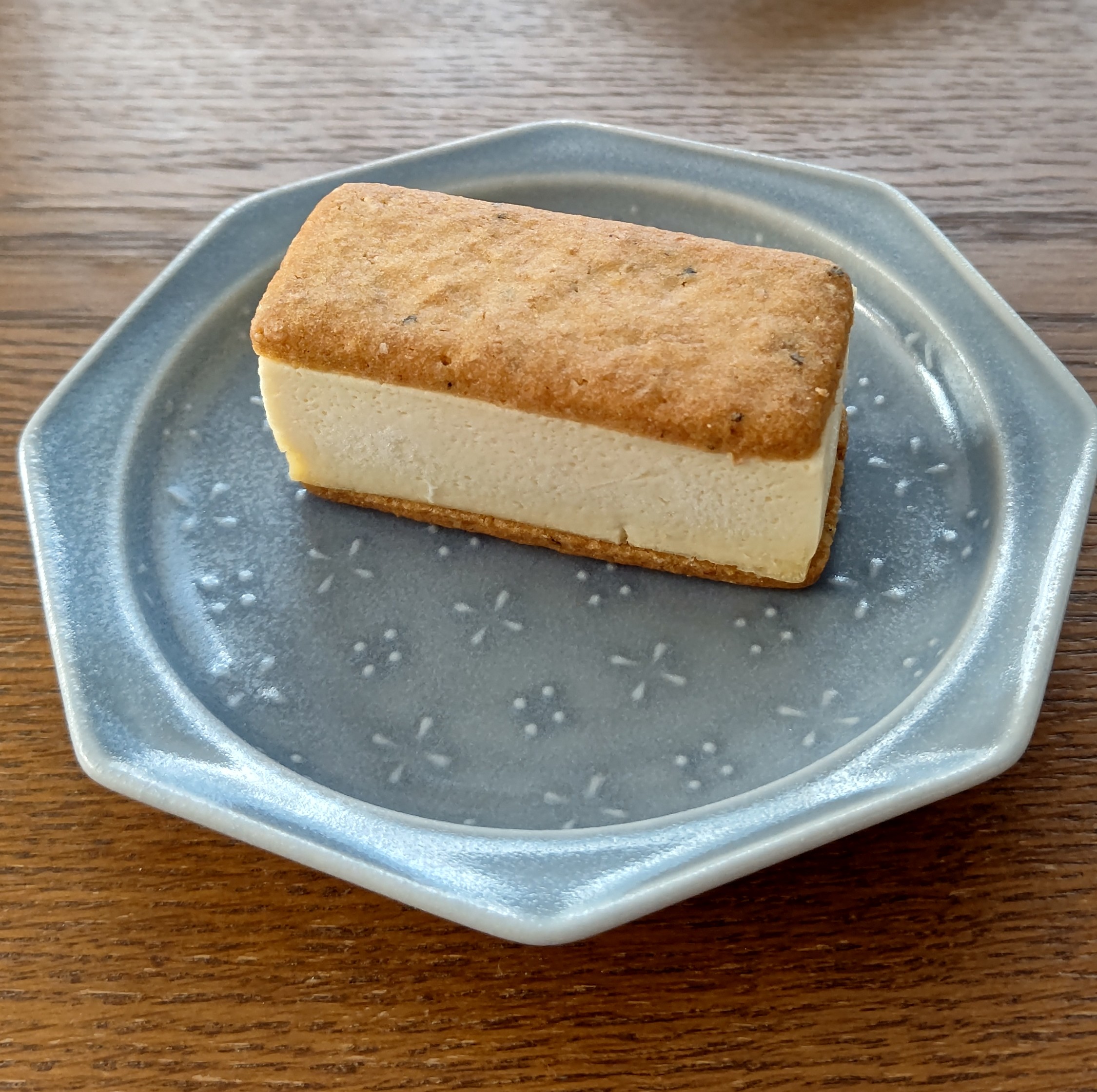 なめらかな食感で優しい甘さのチーズケーキが程よい厚みのあるサブレでサンドされています。