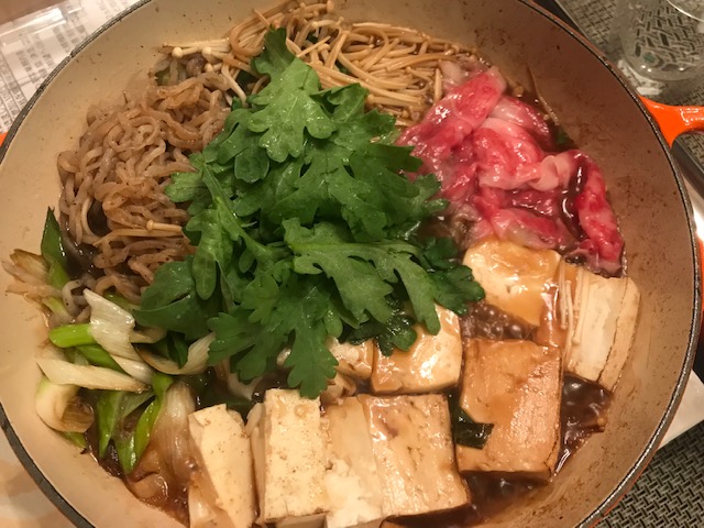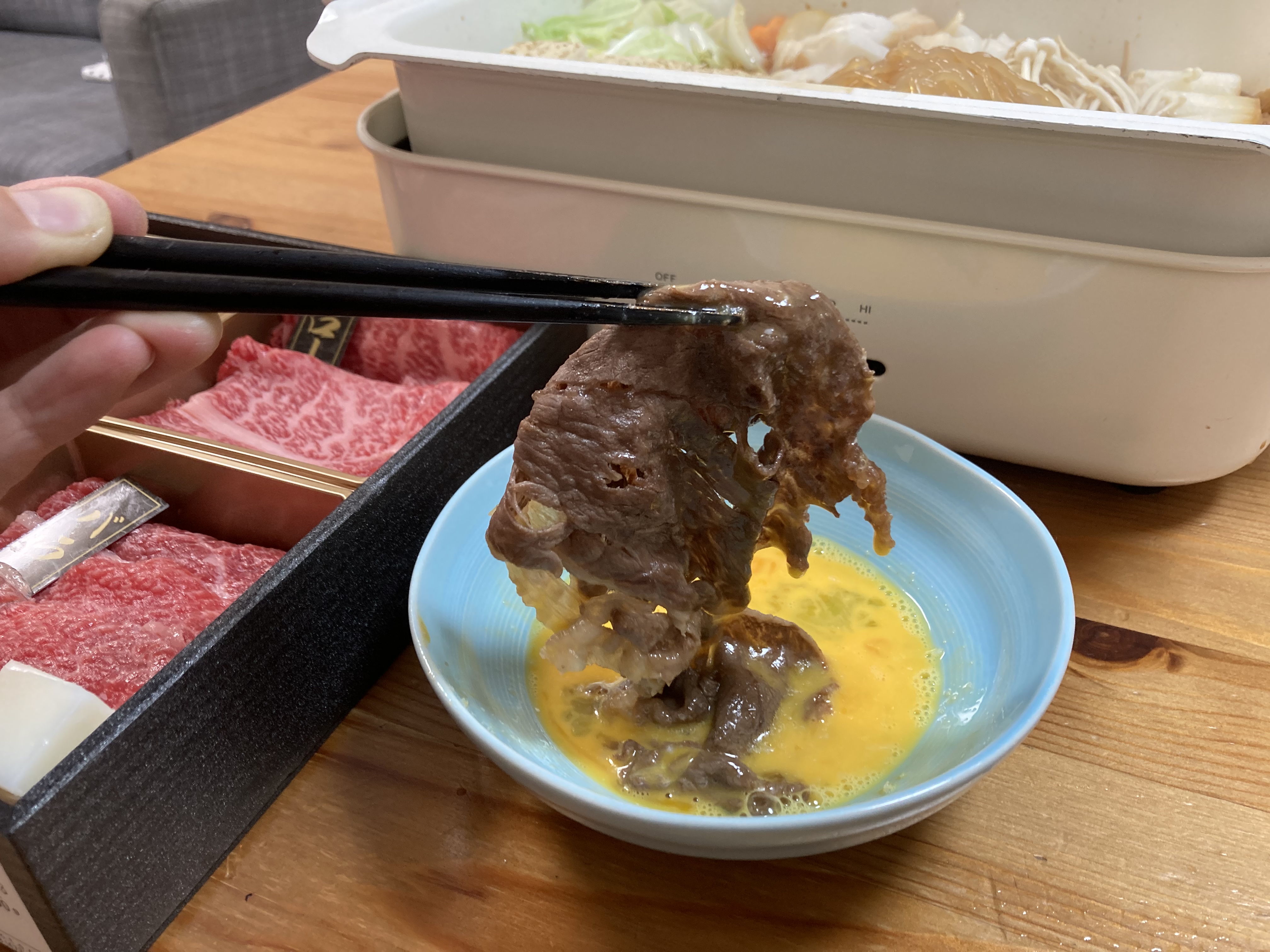 まずはオススメの食べ方で…と思い、付いている牛脂をすき焼き鍋にまんべんなく引き、一枚だけ焼いて、お肉そのものの味を堪能。