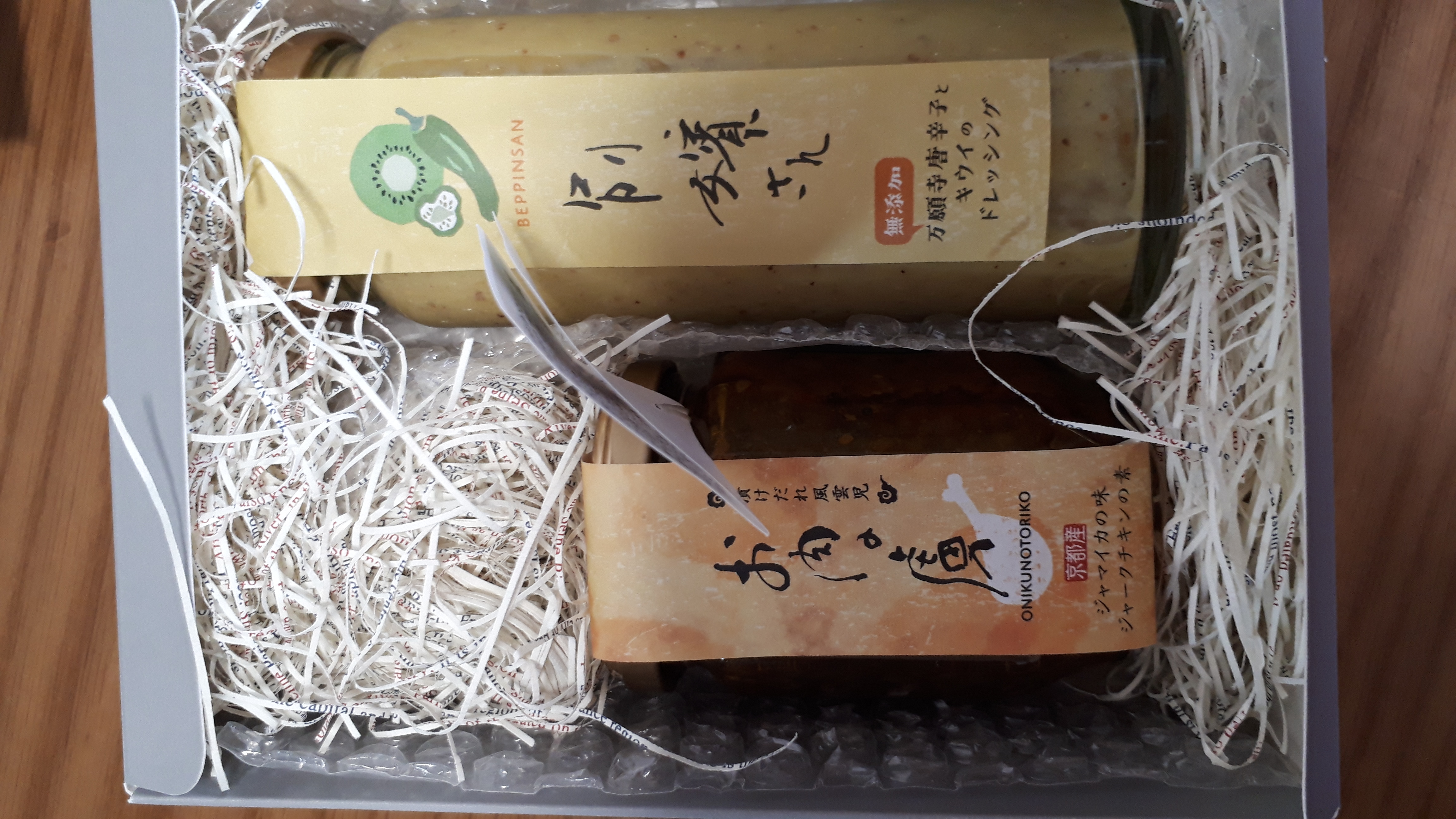 京野菜を使った無添加の「調味料」セットです。「お肉の虜」は、ジャマイカのソウルフード「ジャークチキン」の素です。京野菜の味を生かし、スパイシーでありながら日本人の口に合うよう仕上げました。京都産万願寺唐辛子に、キウイを合わせた濃厚な無添加ドレッシング「別嬪さん」。フルーティーで爽やかな味が特徴です。フレッシュ感を感じる京野菜たっぷりの調味料です。