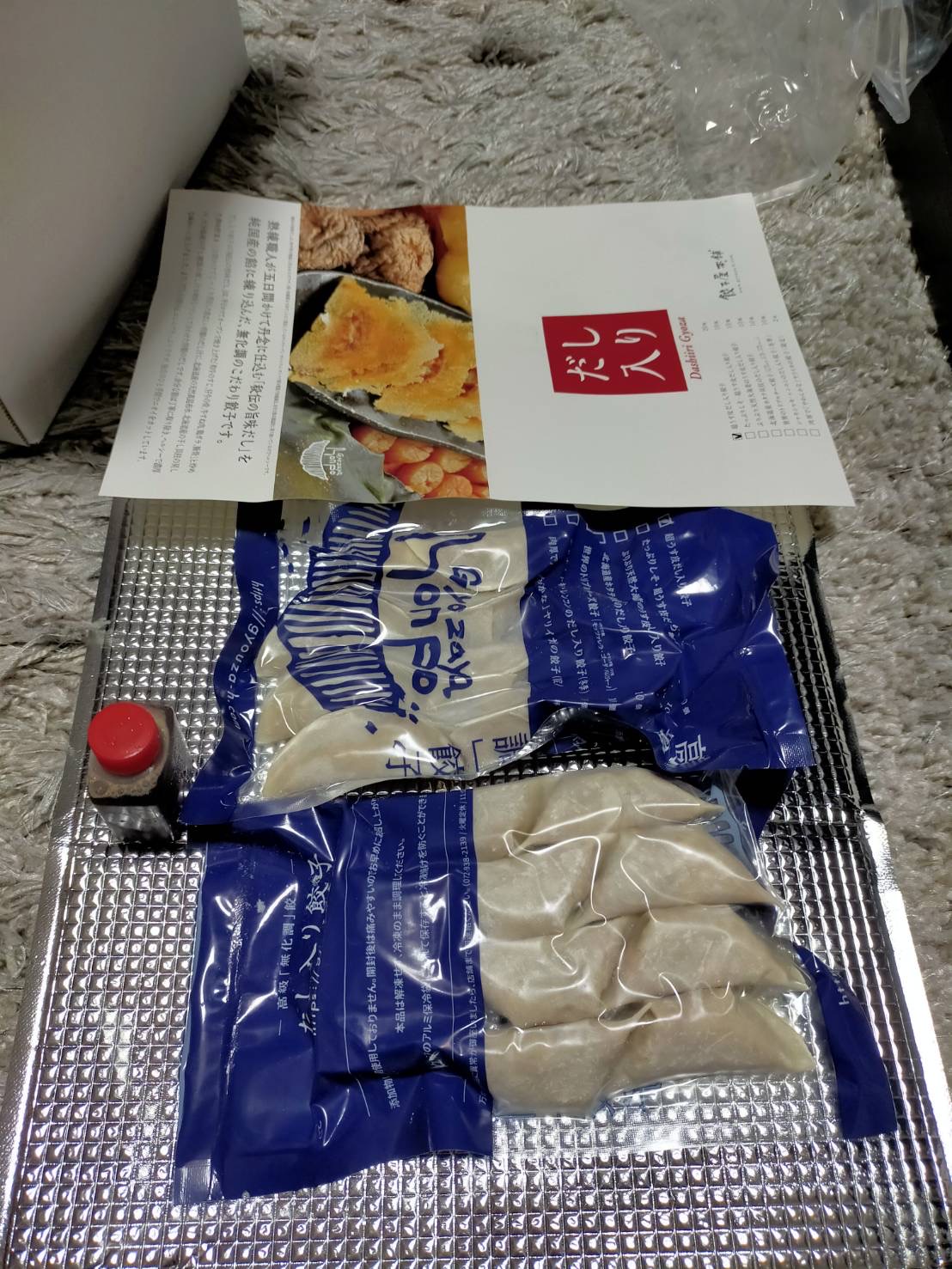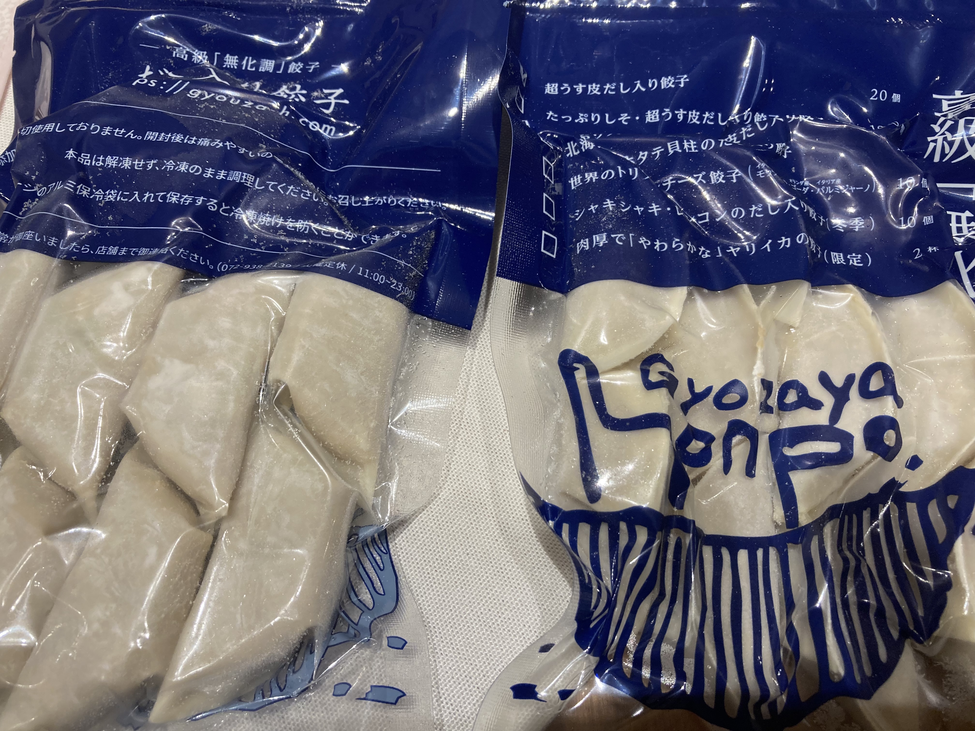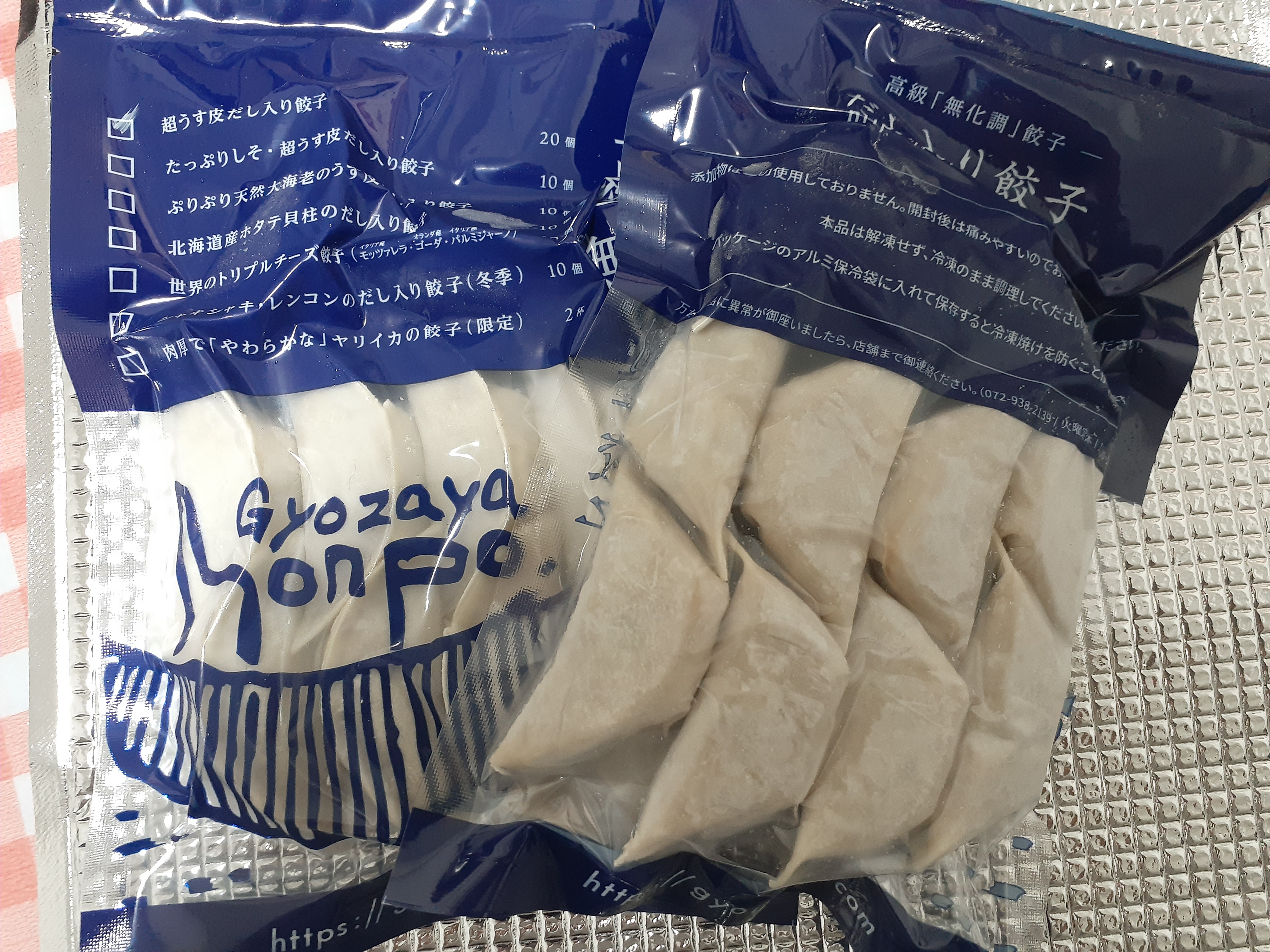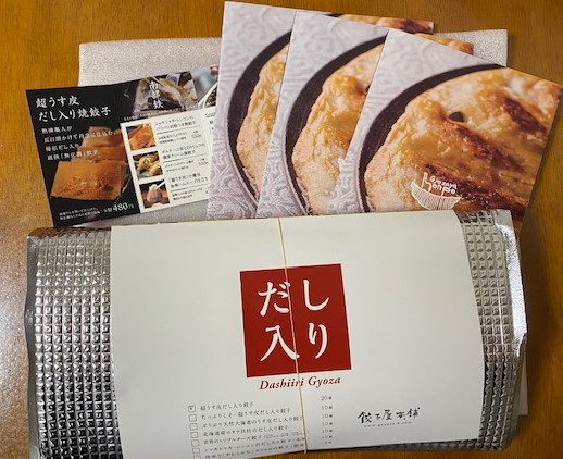 箱を開けると、しっかりとしたアルミ保冷袋の中に真空パッケージの餃子が入っており、手土産などちょっと持ち歩くときも安心感があります。餃子が10個入り×2袋に分かれている点も重宝しますね。焼き方の説明書もガス用とIH用の2種類同梱されており、行き届いているなぁという印象です。