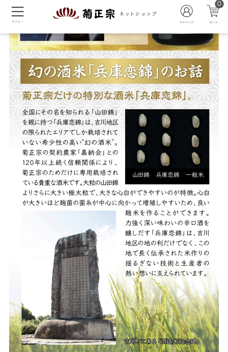 菊正宗でしか手に入らない希少な菊正宗契約栽培「兵庫恋錦」を菊正宗で継承されている生酛(きもと)造りで醸した究極の銘酒です。普段使いで味わって頂きやすいように敢えて包装等を華美にせずお求めやすく最高品質をご提供しております。