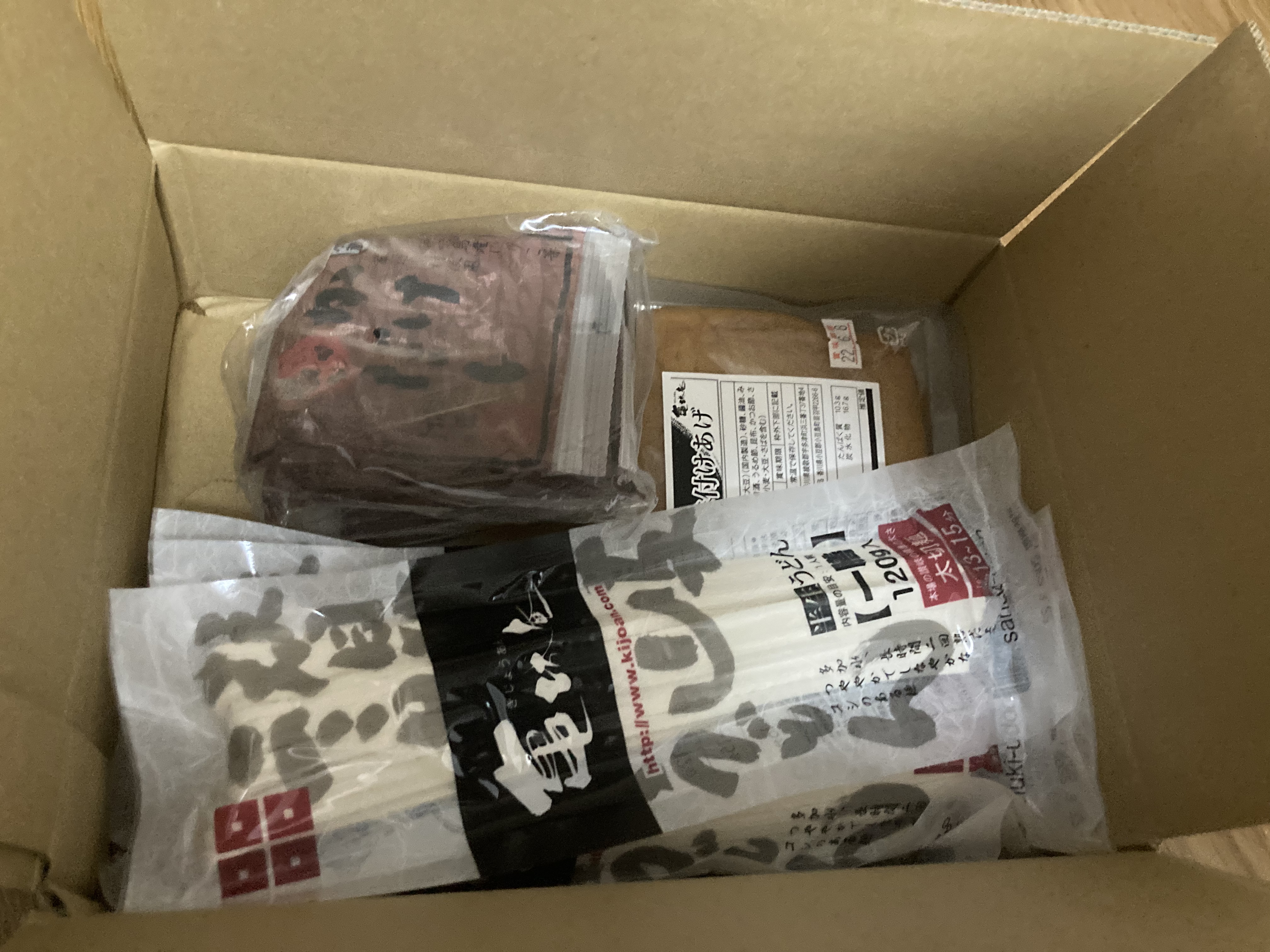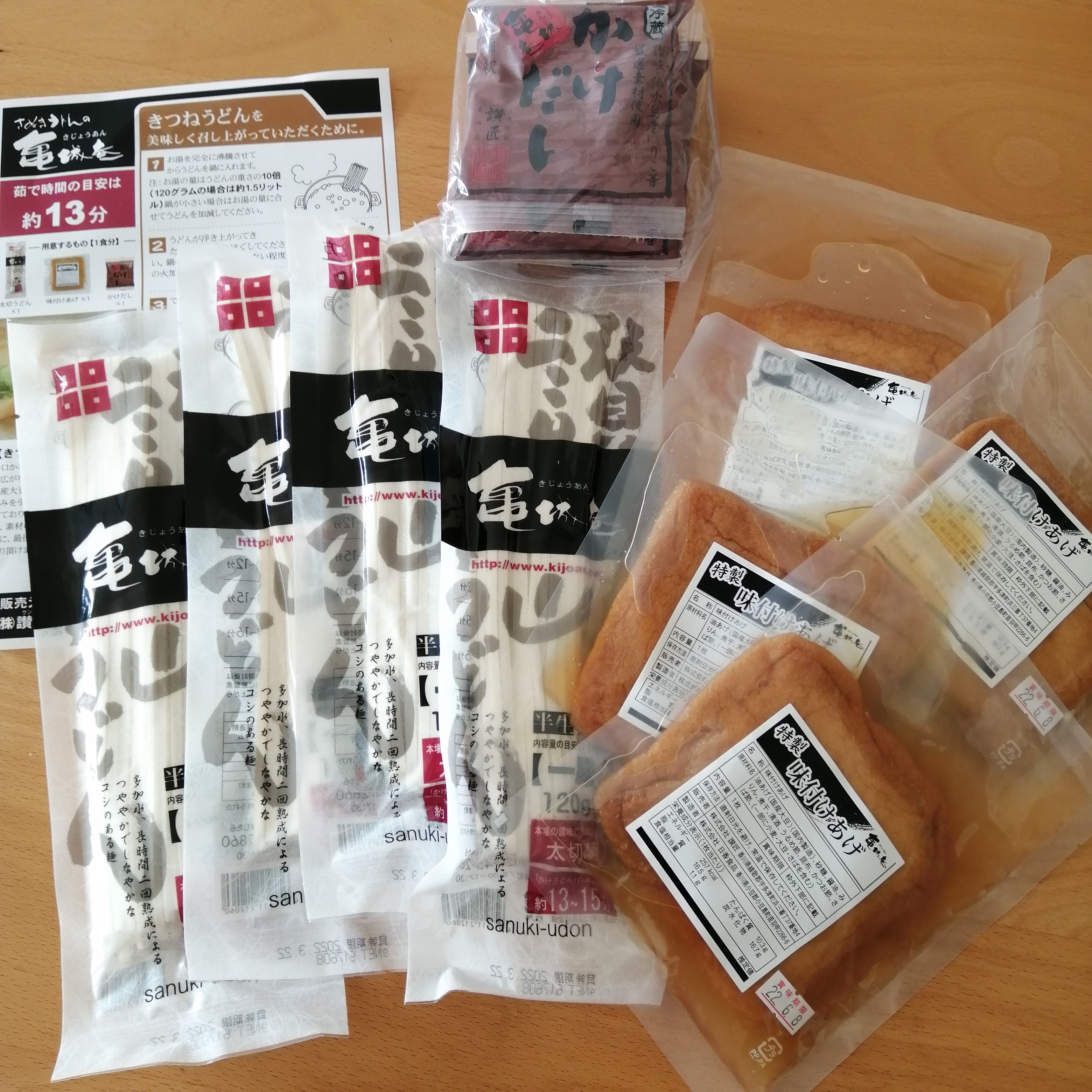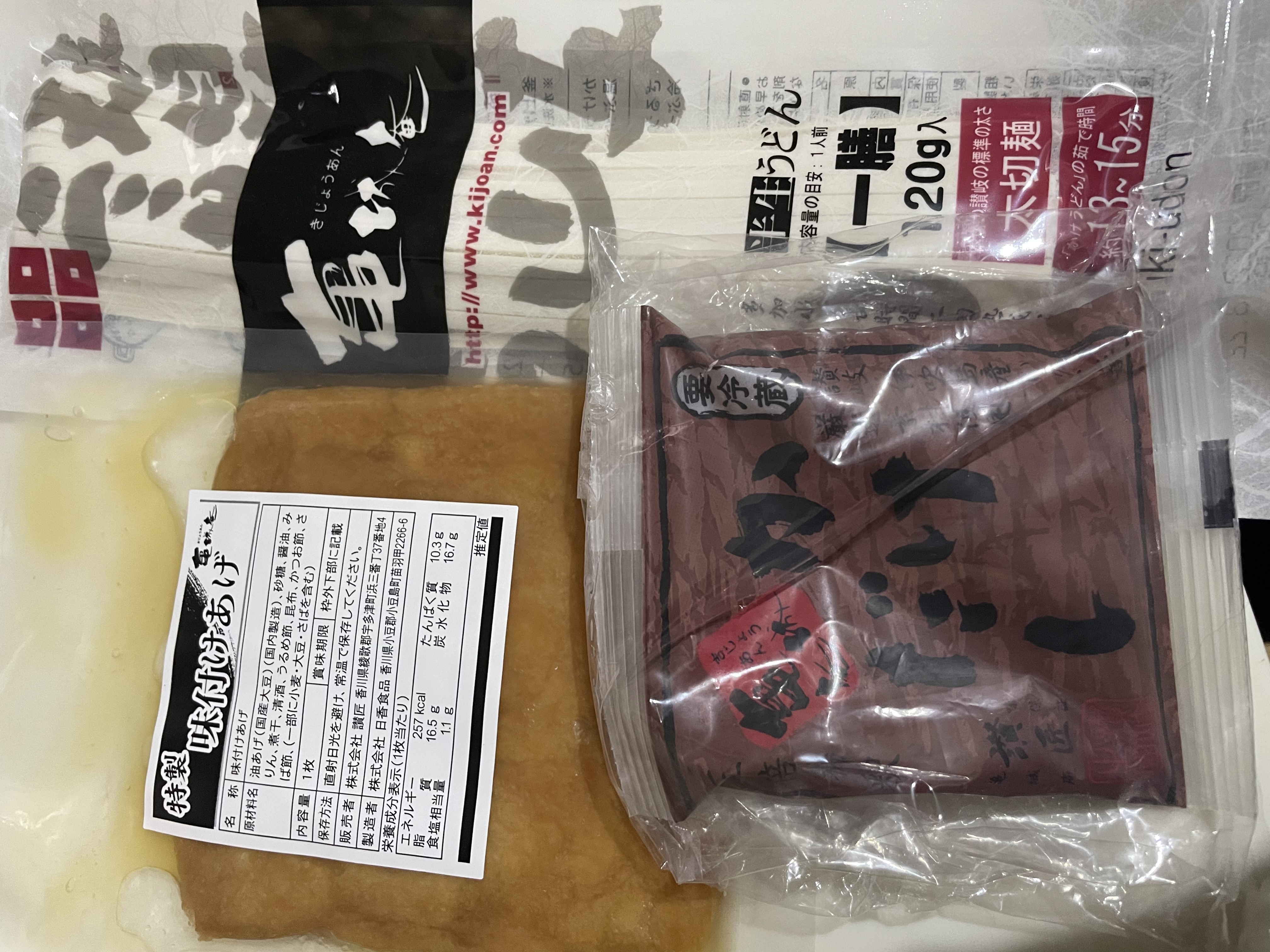 大きなお揚げが印象的な「きつねうどん」です。モチモチとした半生讃岐うどんと、伊吹島産いりこをはじめ昆布節類などをふんだんに使った黄金色のかけだし、消泡材を使わない豆腐にこだわる久保さんの揚げを味付けしてつくったレトルトタイプのセットです。ふくよかな塩味と甘味のジューシーな揚げと、讃岐うどんならではの伊吹島いりこの風味を家庭で堪能できます。すべて、1食ずつ個包装になっているので、昼食などにもピッタリです。