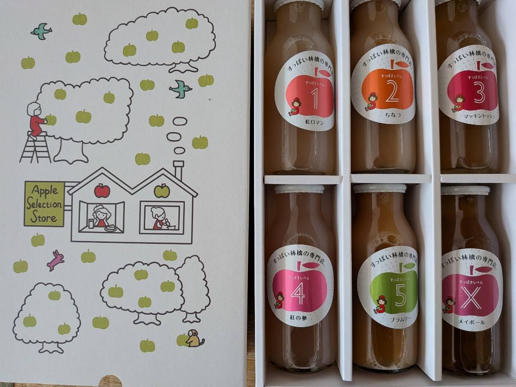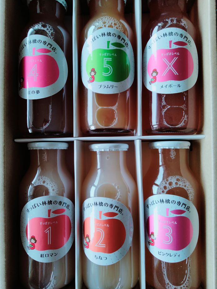 品種別にしぼったりんごジュースの6本セットで、当店独自の基準「すっぱさレベル」の数字がラベルに表示されています。