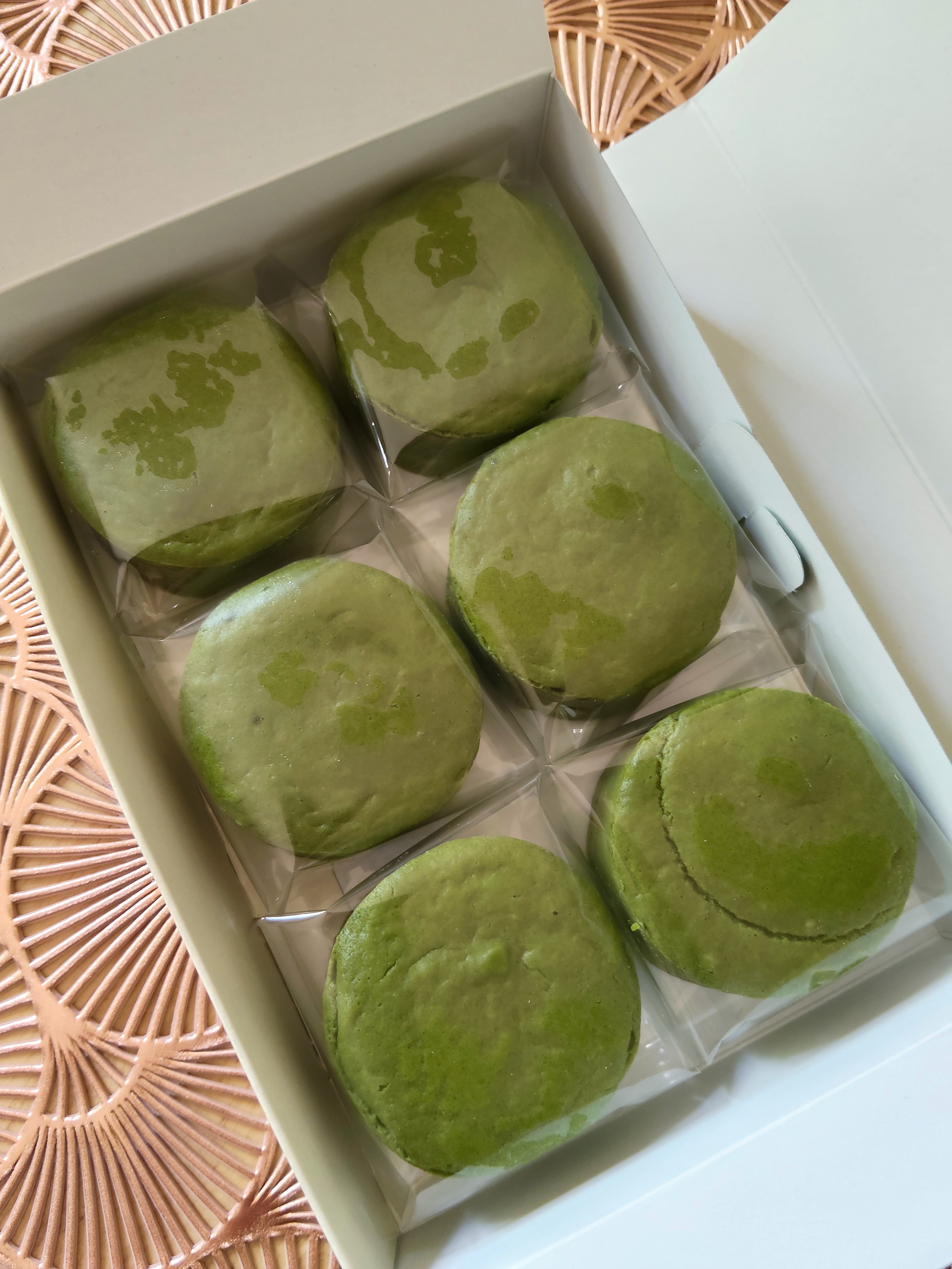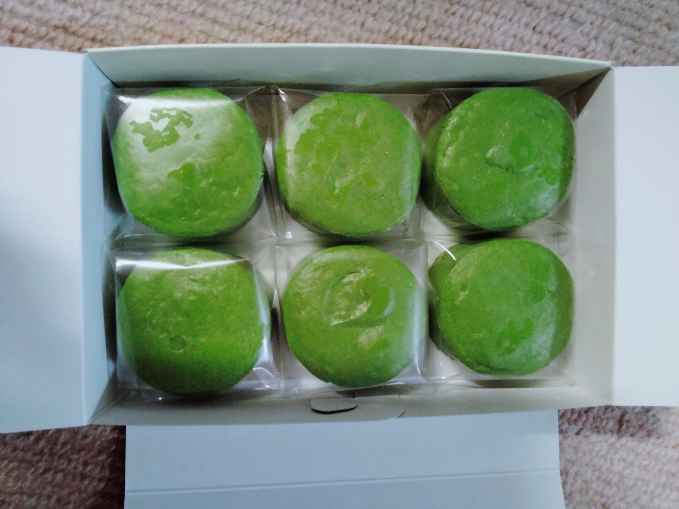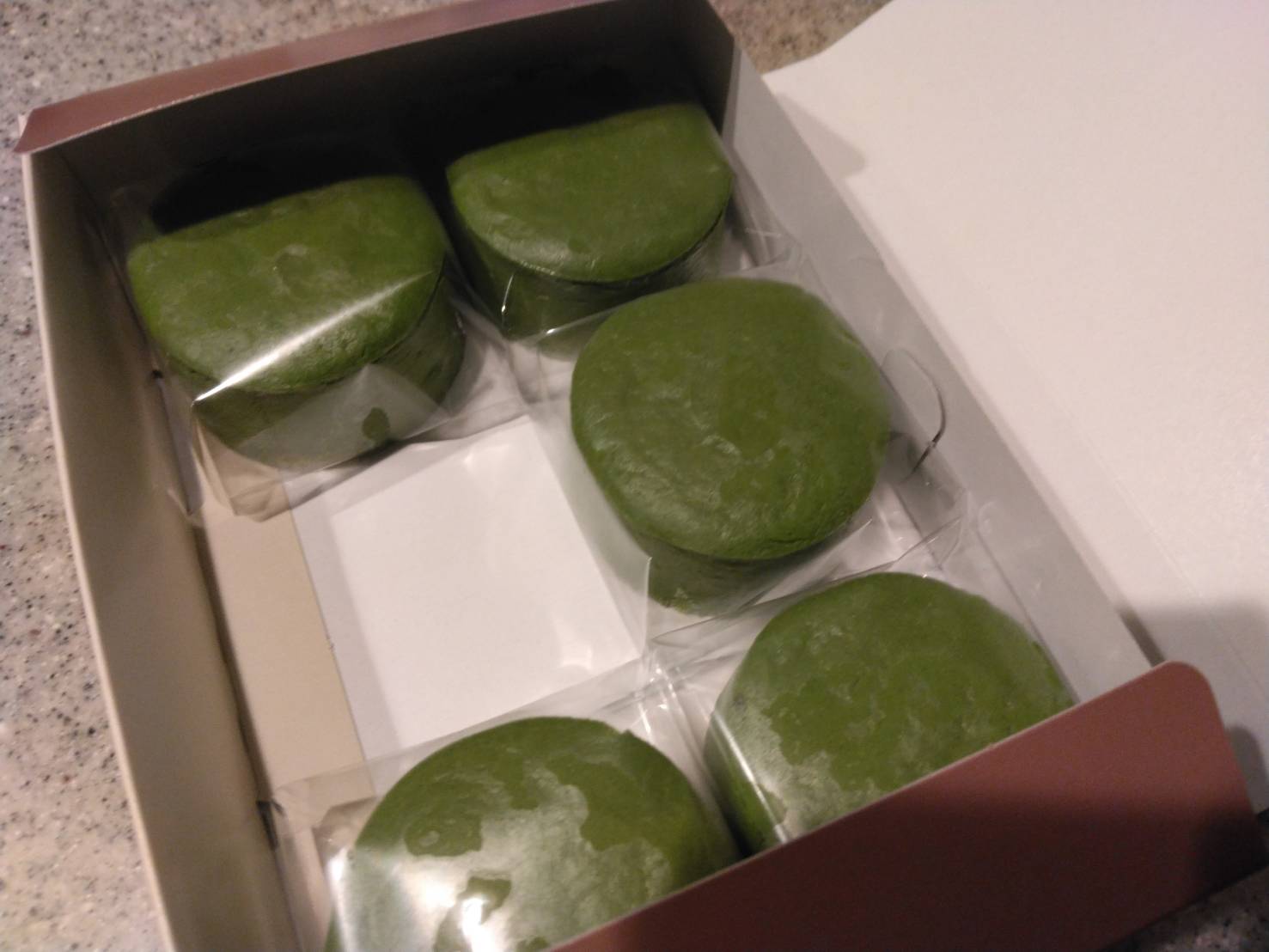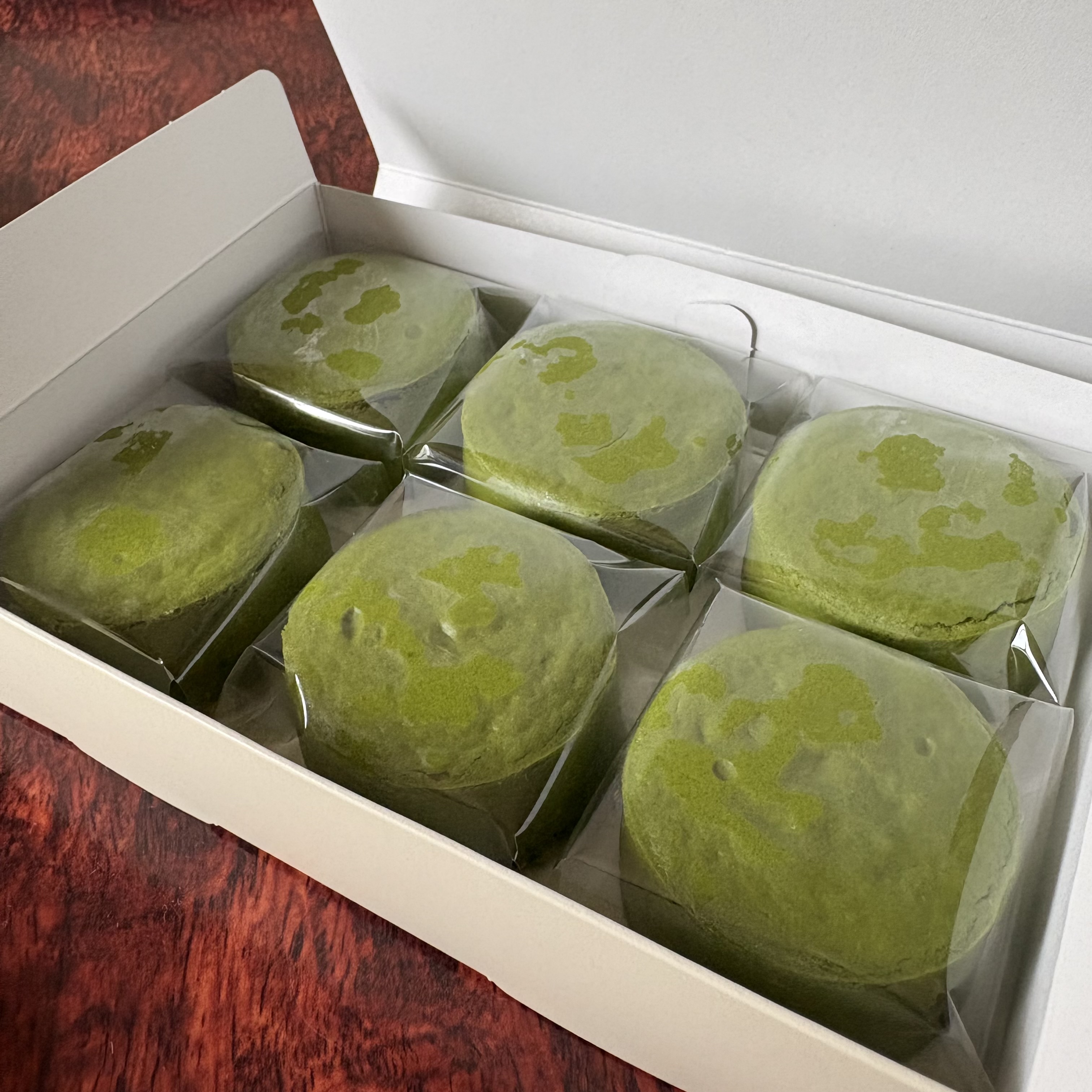 そして、その箱の中には綺麗に陳列された抹茶色のチーズケーキが6個入っていました。