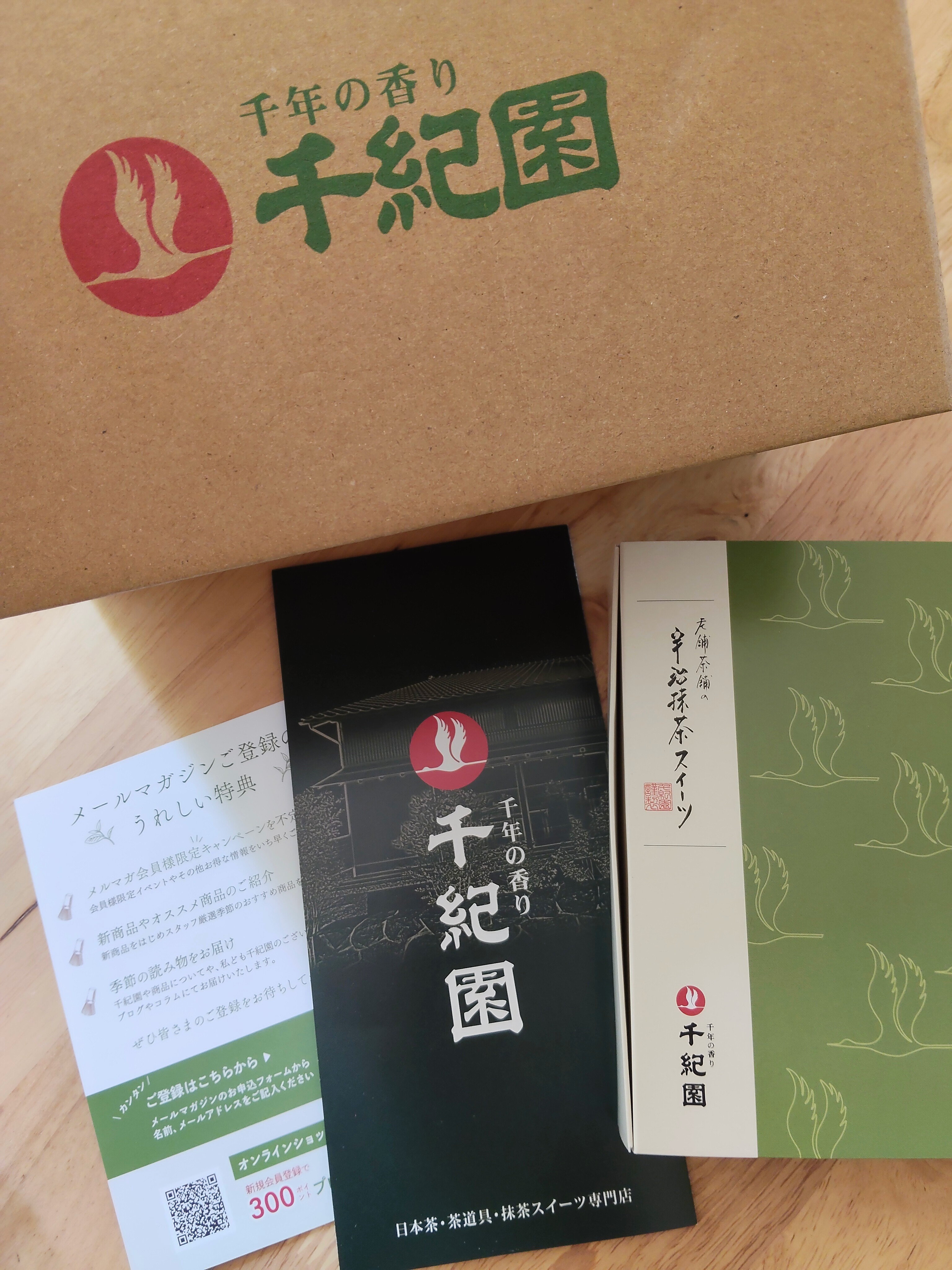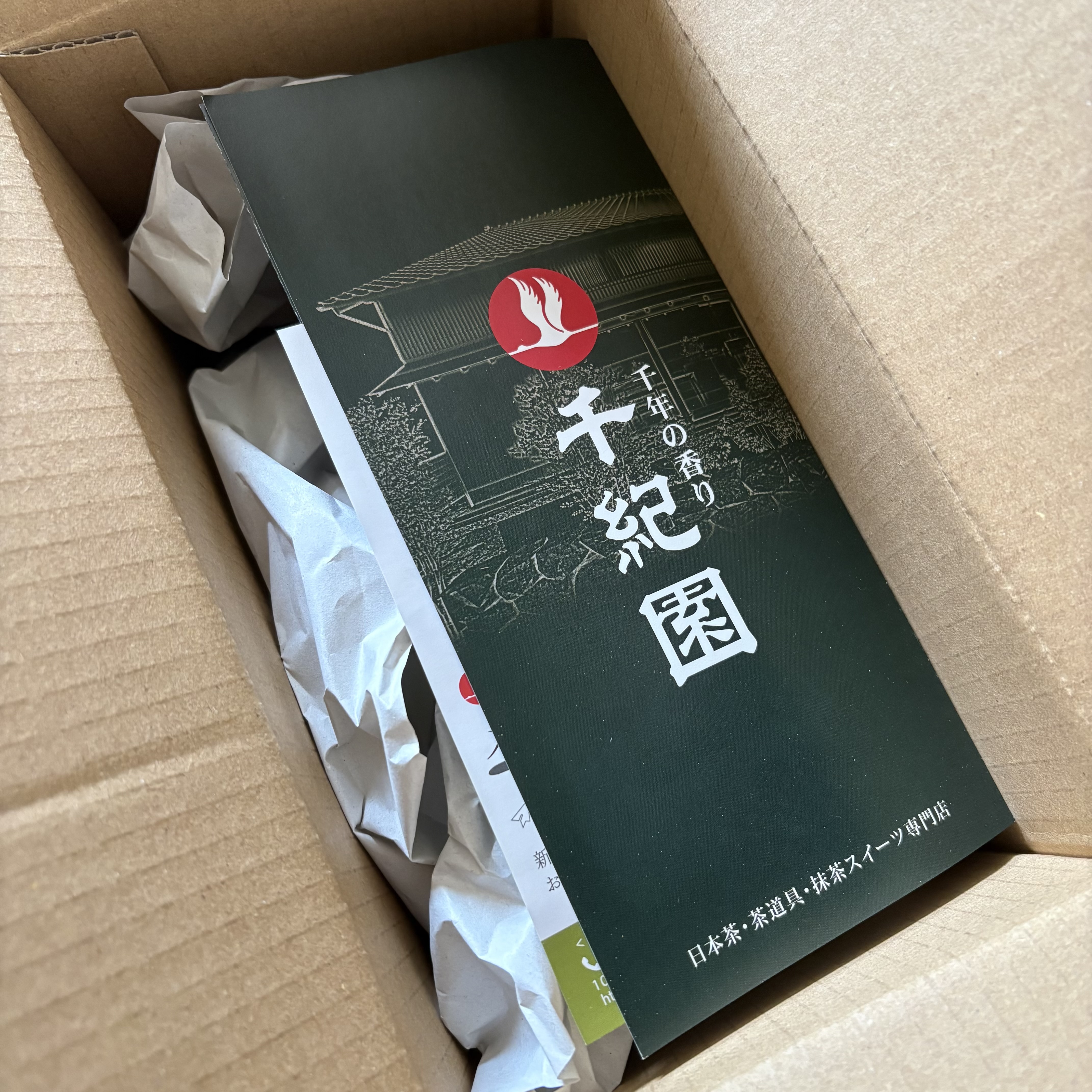 抹茶をイメージした緑を基調とし、千紀園のマークでもある鶴が飛ぶ姿が描かれた箱に入っています。
