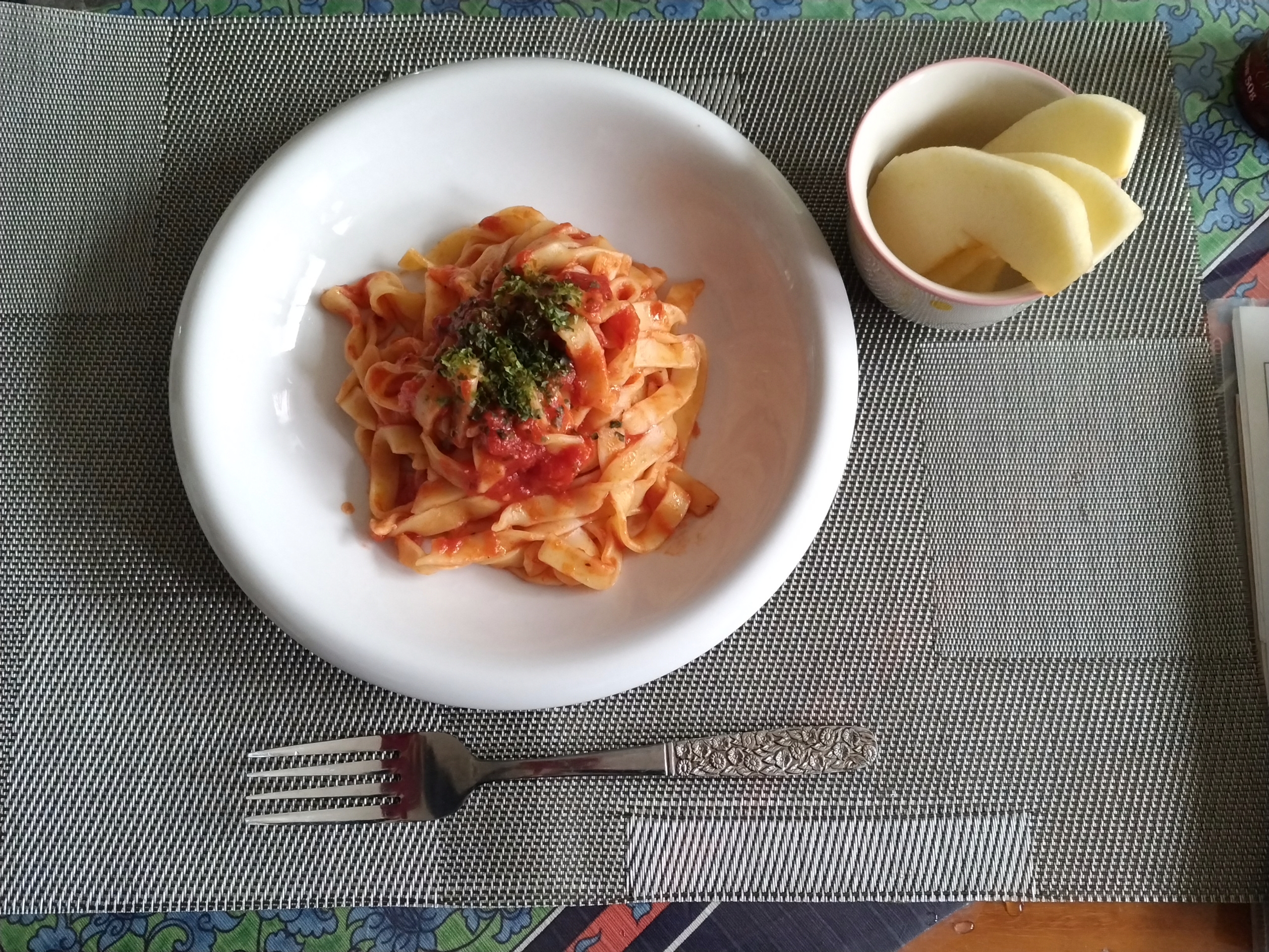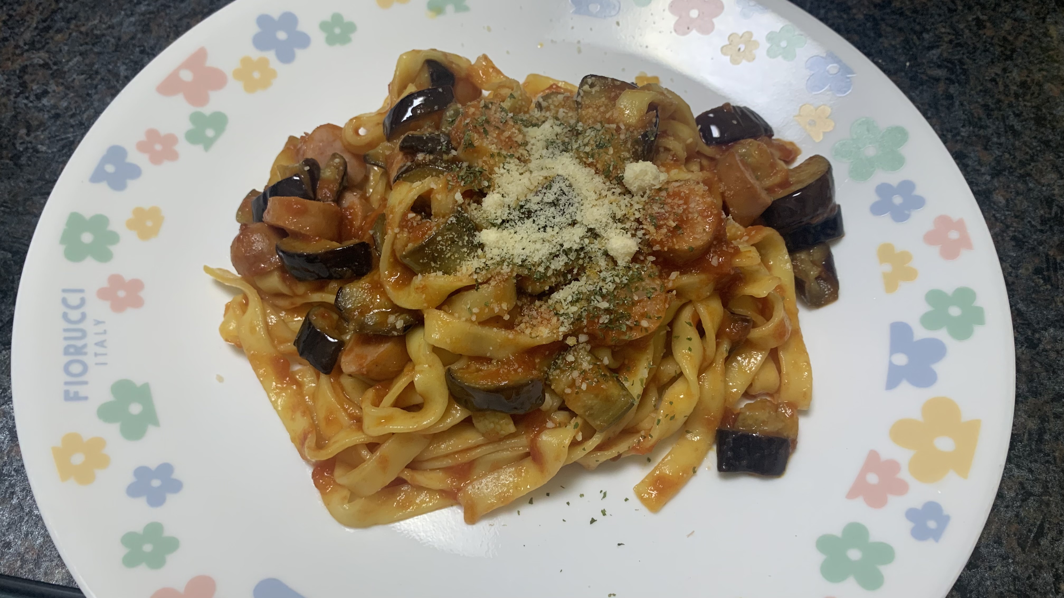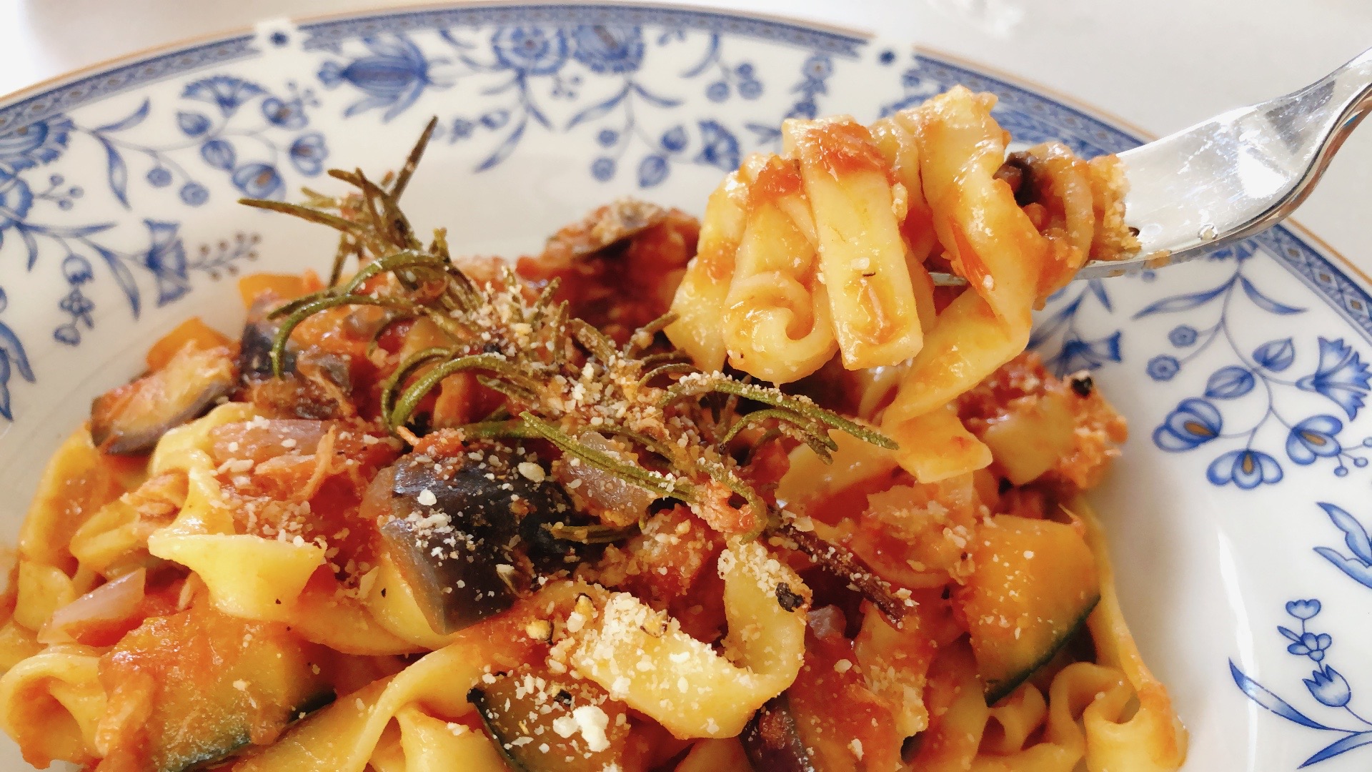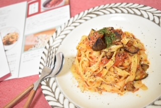 そして鮮やかな赤褐色がとても綺麗。具材として、ナスとプチトマトを追加し、最後にパセリを振りかけましたが、ソースの色合いが良く、とっても映えるパスタになりました。