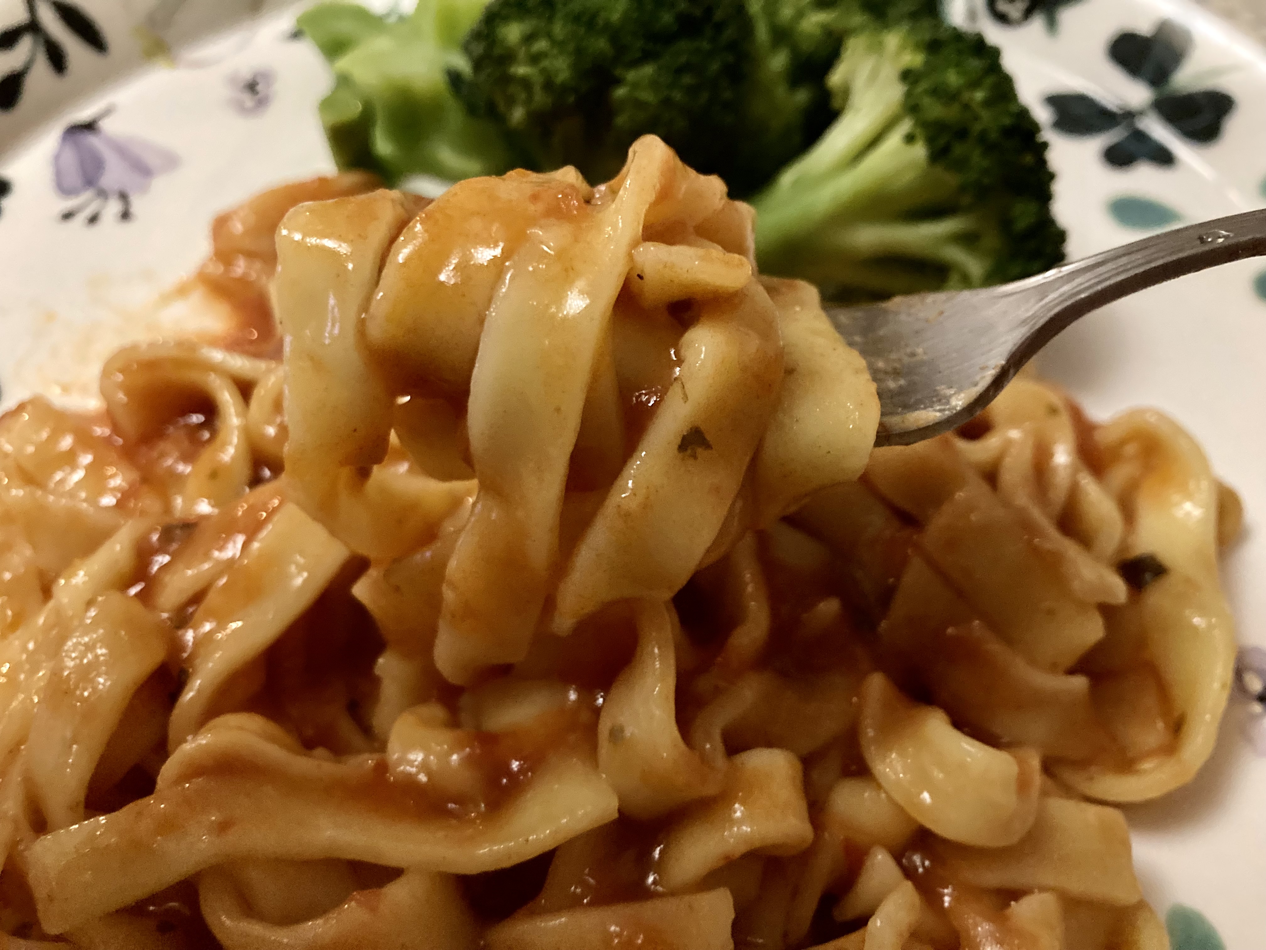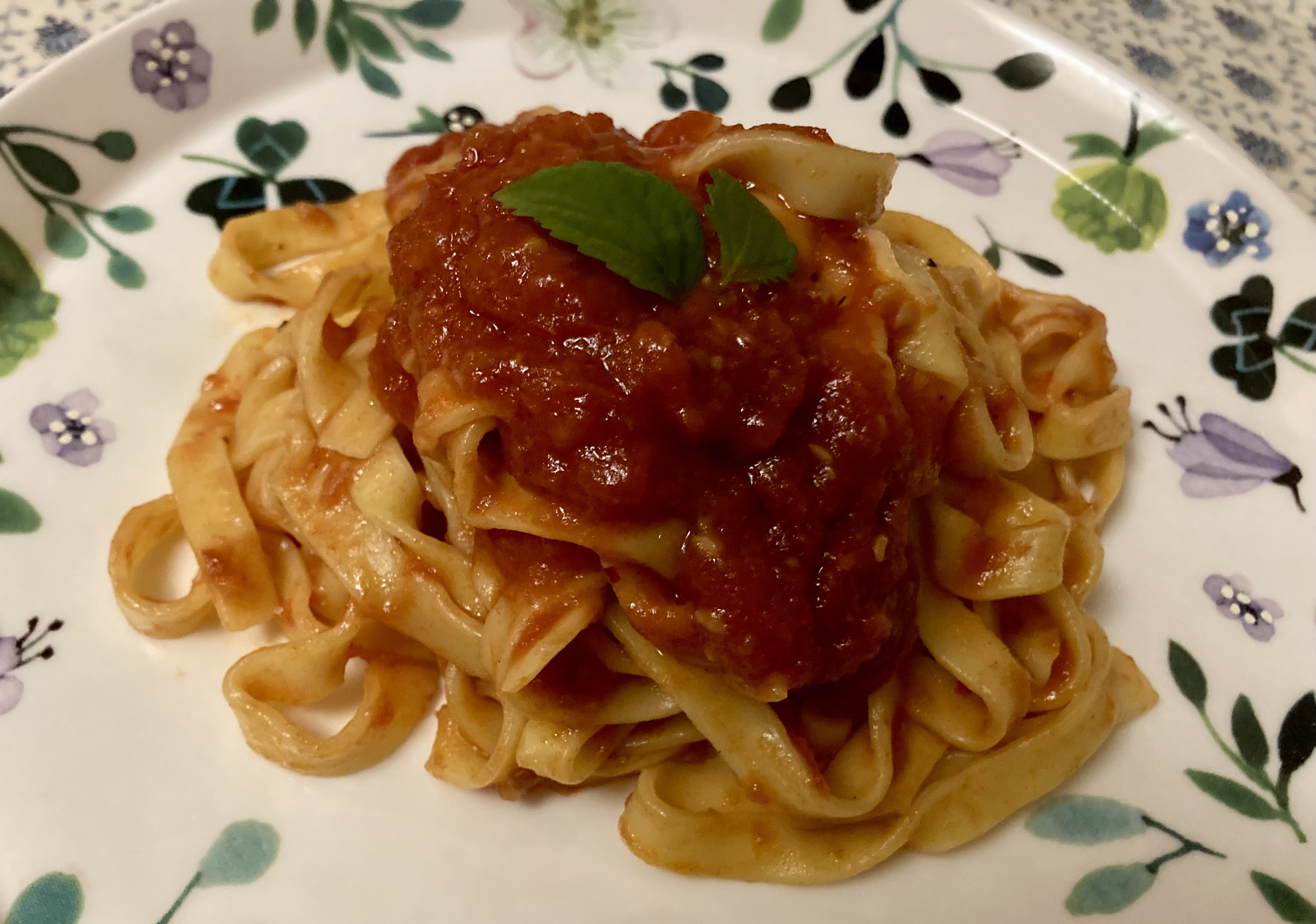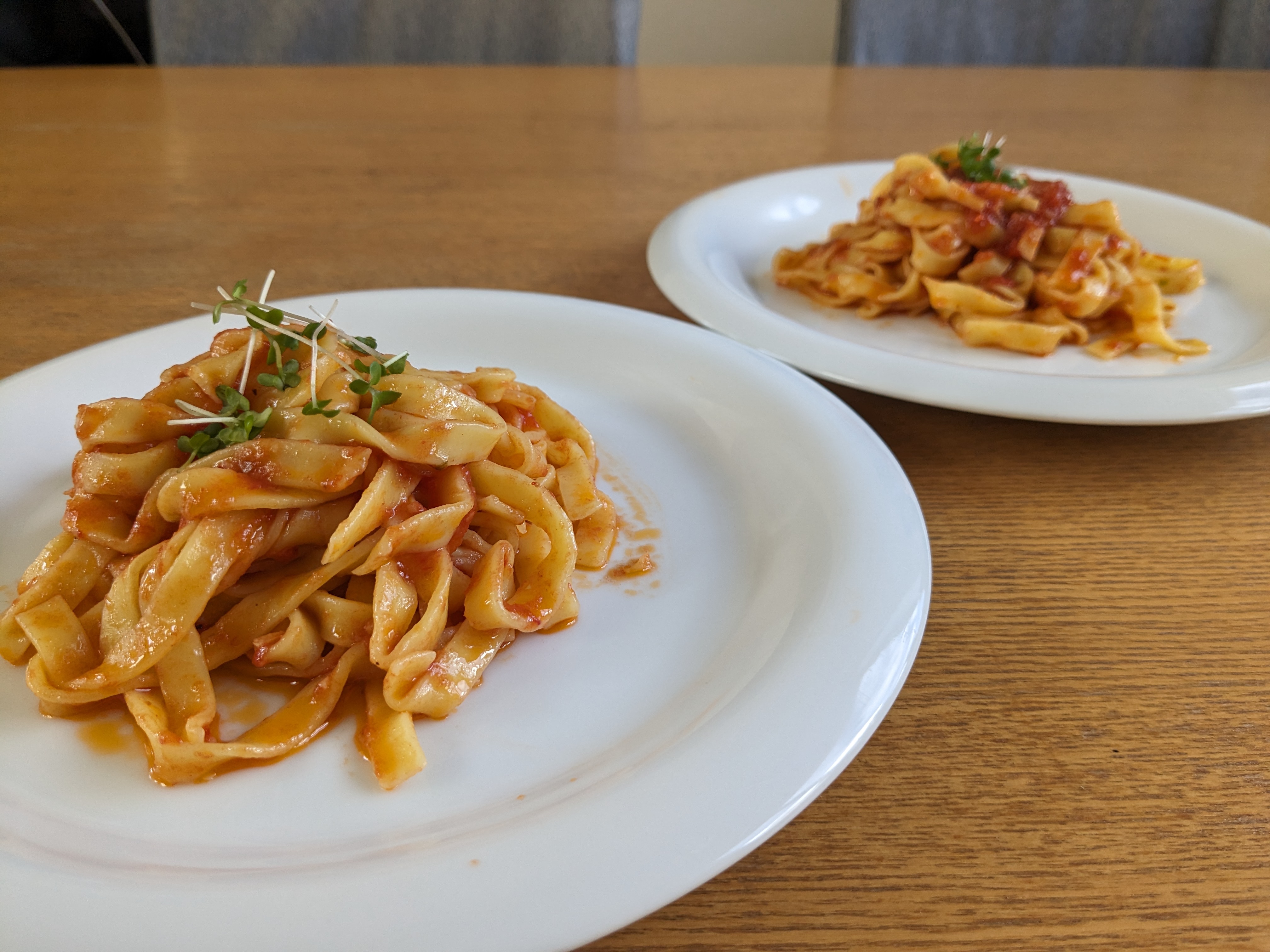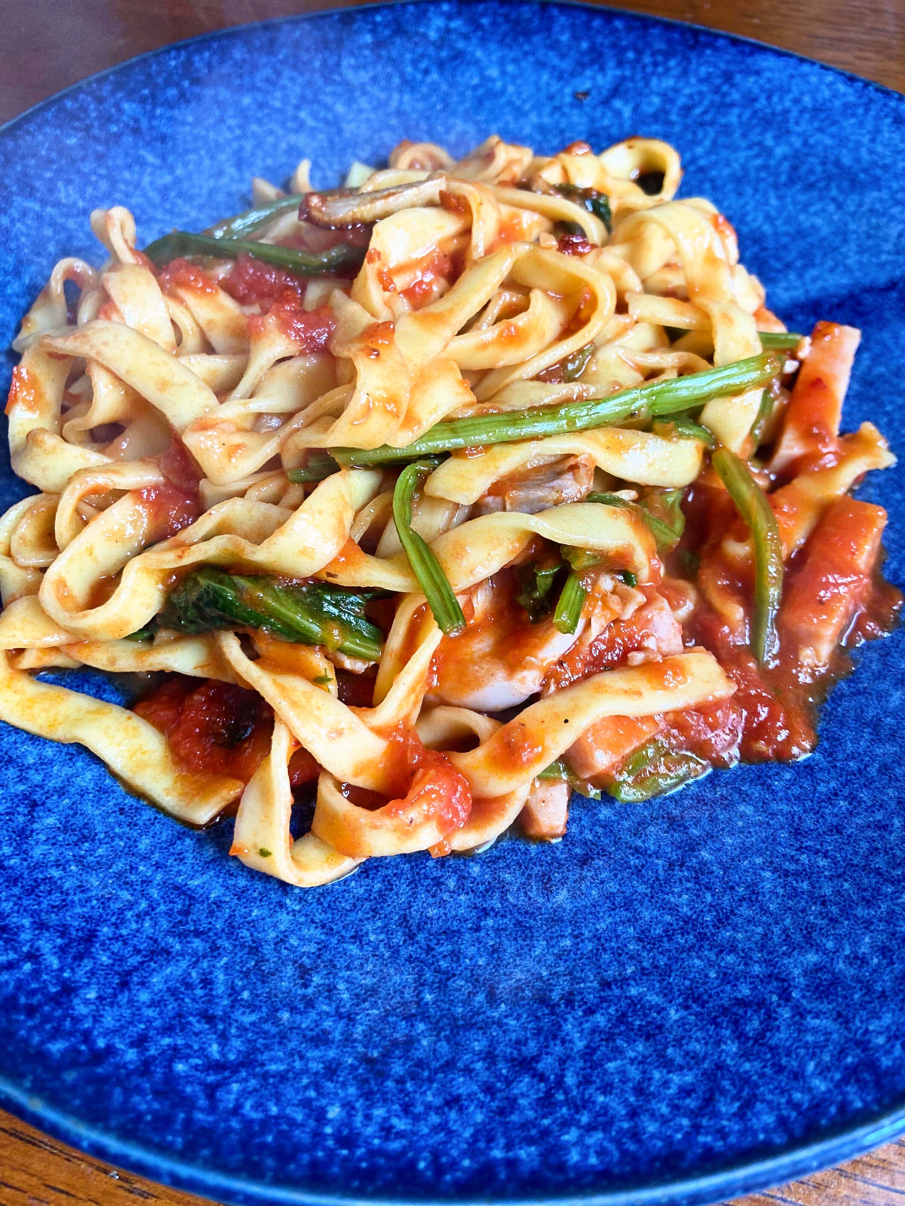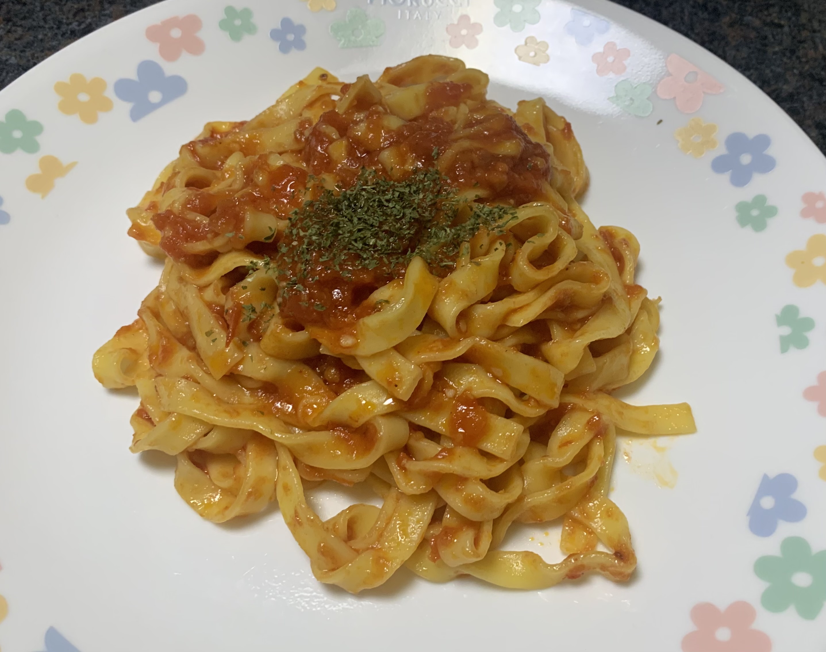 波打ってる形状なので、トマトソースとの絡みが良く、パスタを口に入れる度にソースがしっかり付いてきます。まさにこれが『ソースを引き立たせている』という事なのでしょうか^^