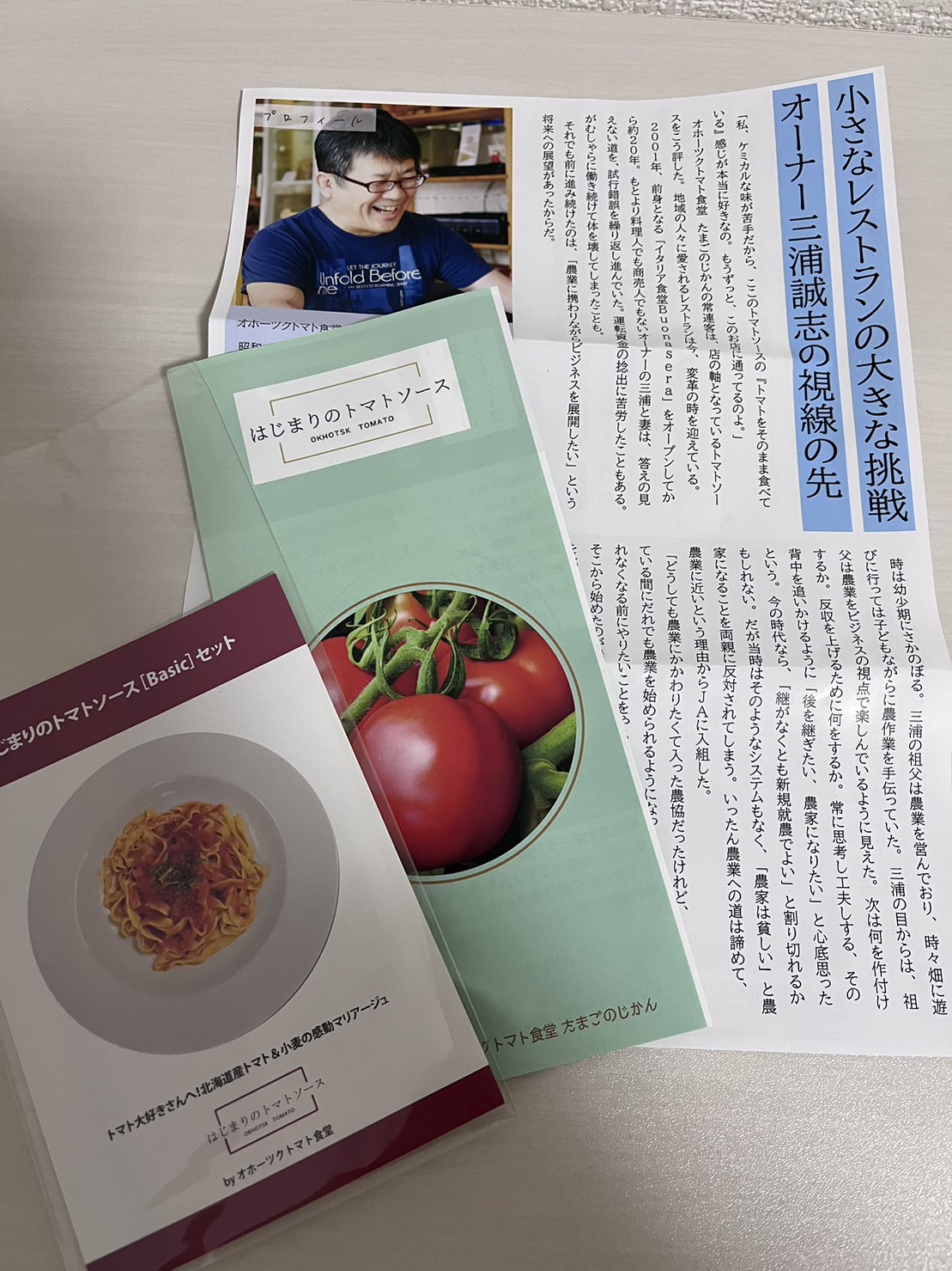 オーナーシェフである『三浦誠志』さんのご紹介・トマトソースの開発秘話、トマトソースの説明・作り方等が書かれたリーフレットが同封されています。